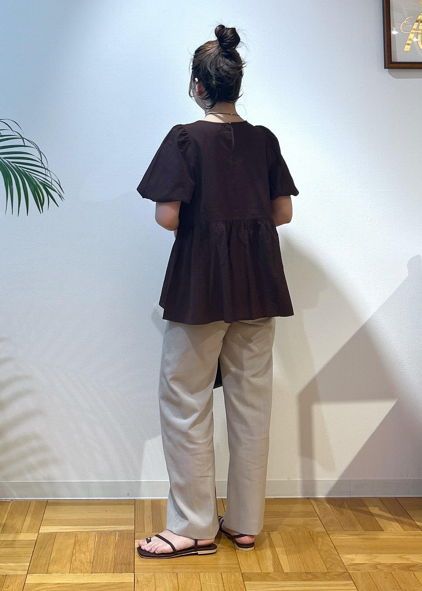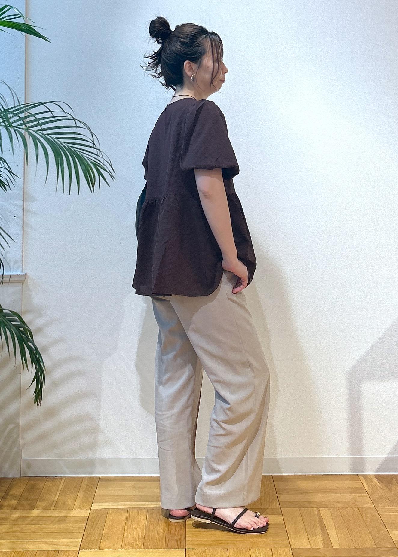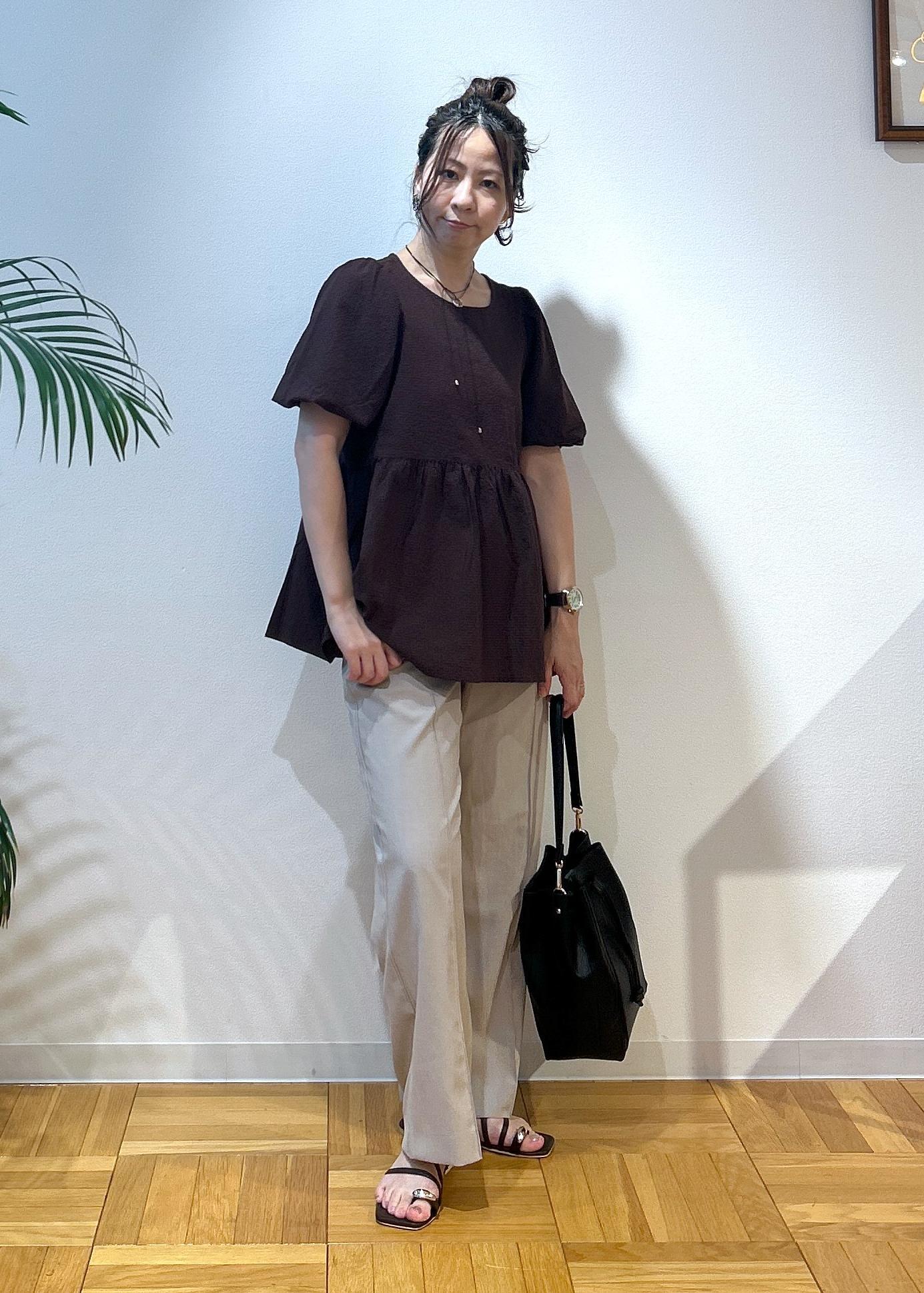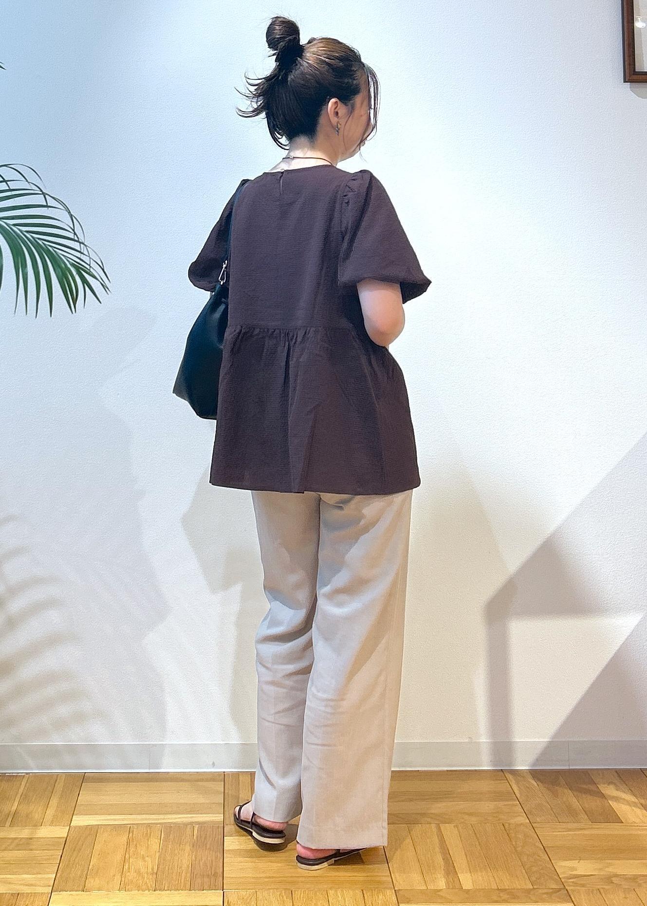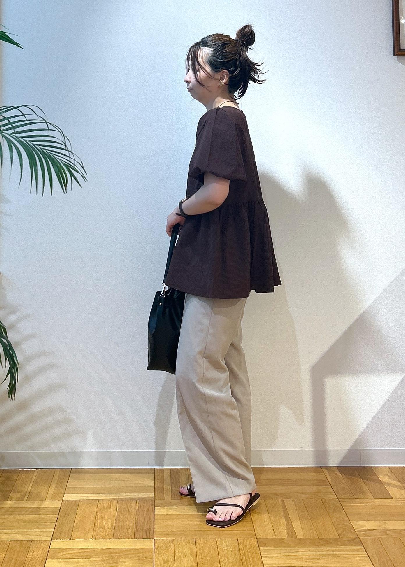 トップスの可愛いデザインをワイドパンツで合わせることで大人可愛いに仕上げました。カラーもブラウンとベージュでまとめることで落ち着いた雰囲気にしてみました。