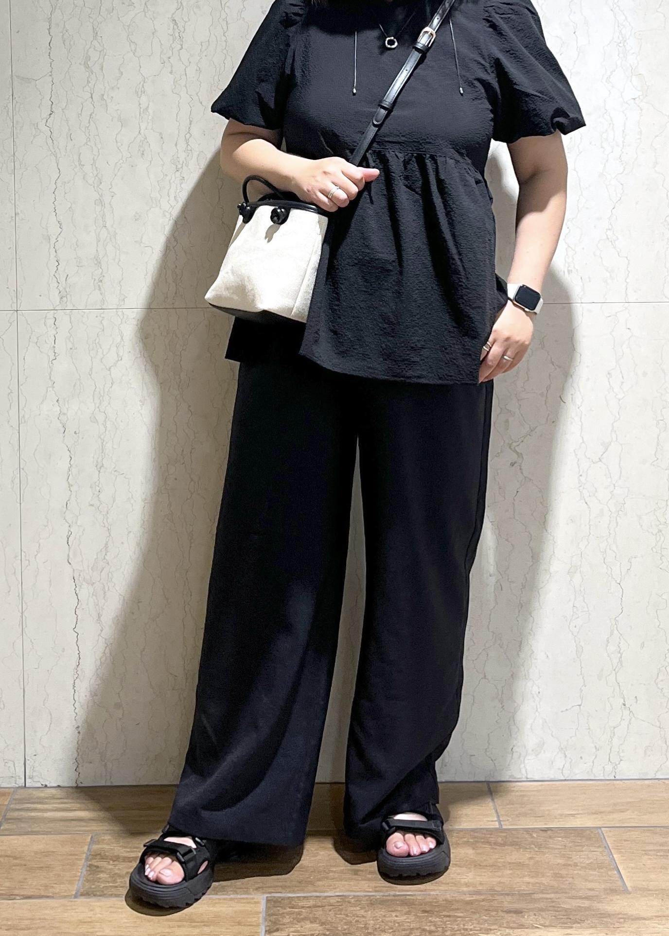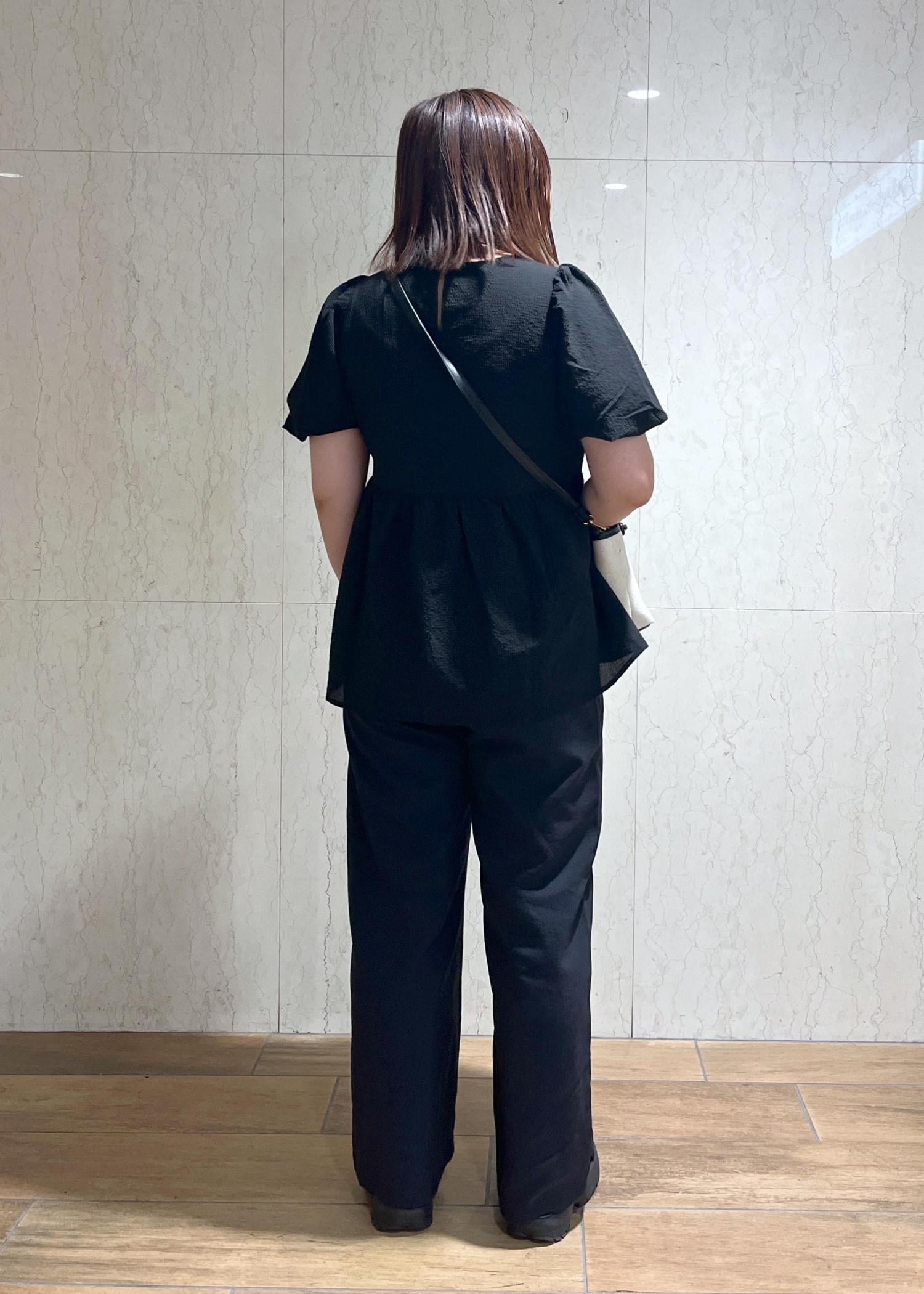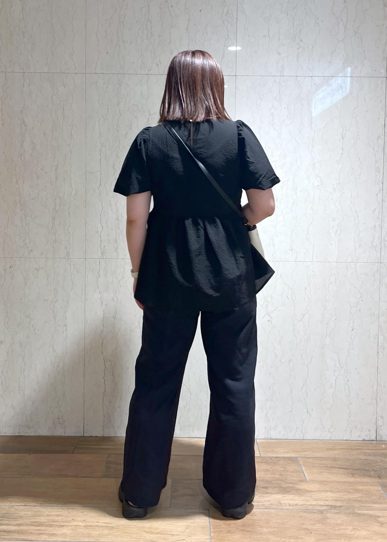 ペプラムブラウスにワイドパンツを合わせたブラックコーデです。
