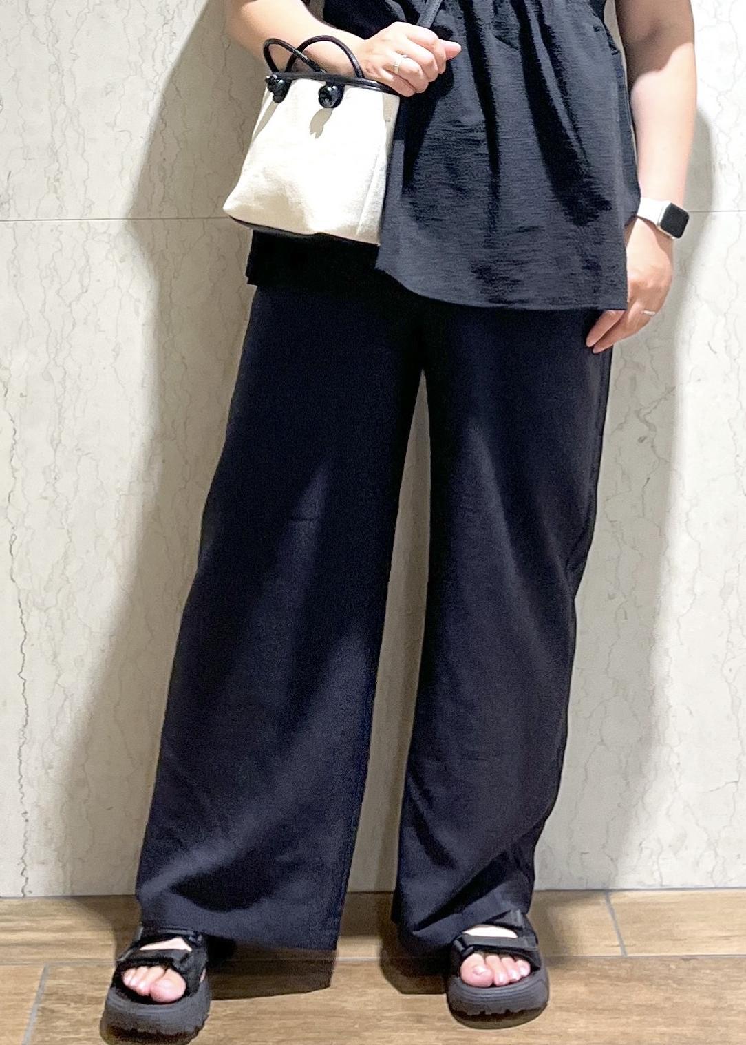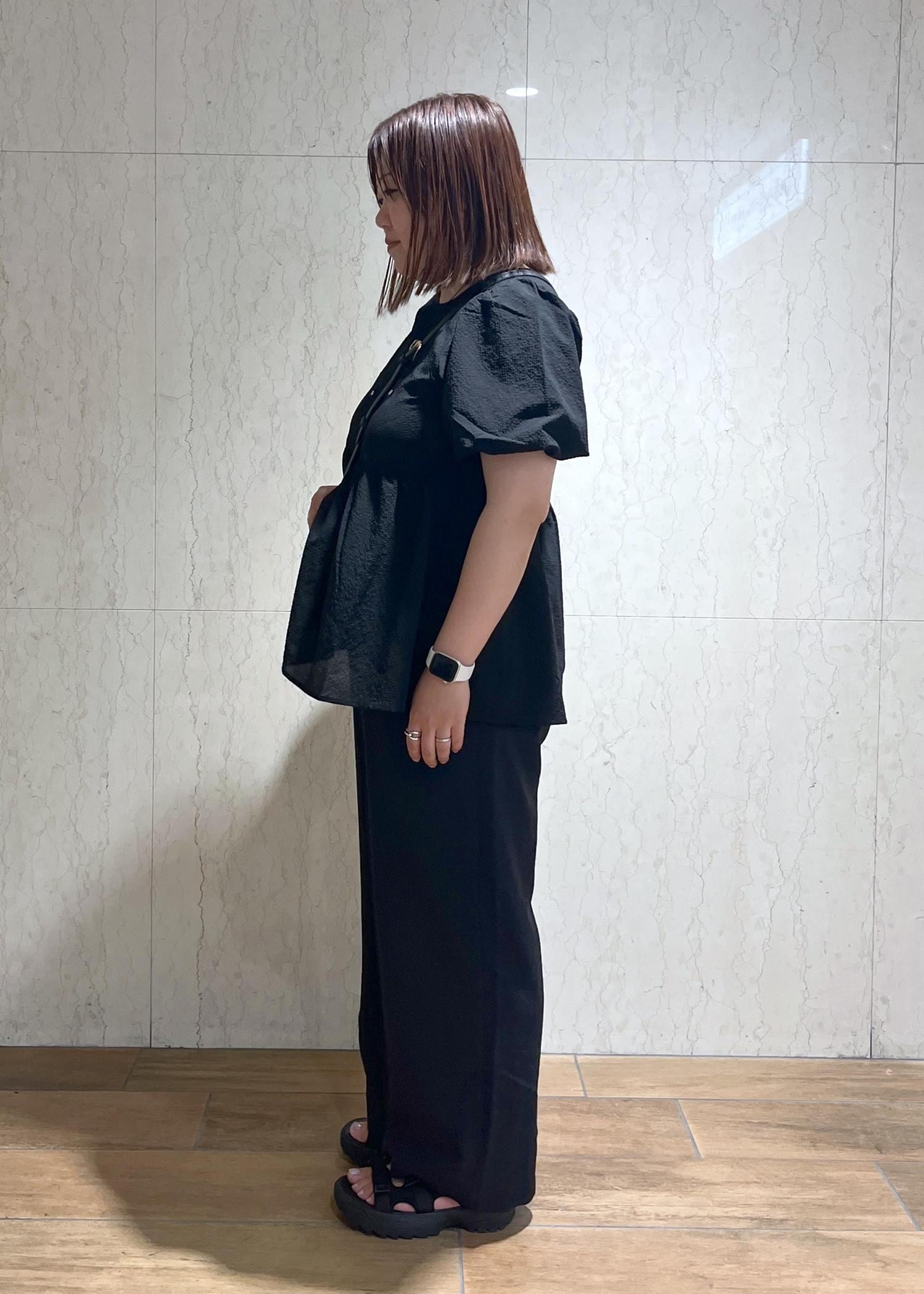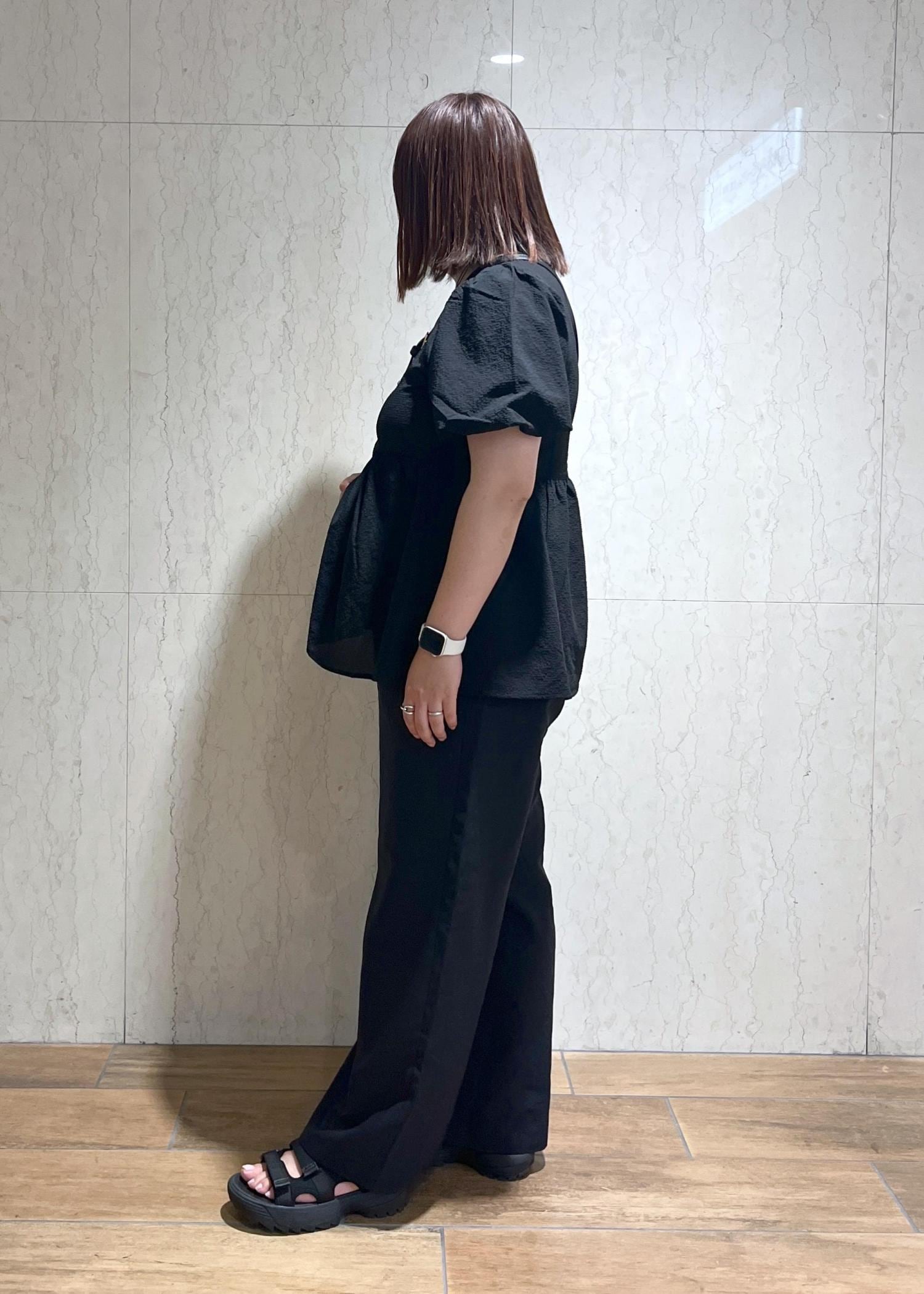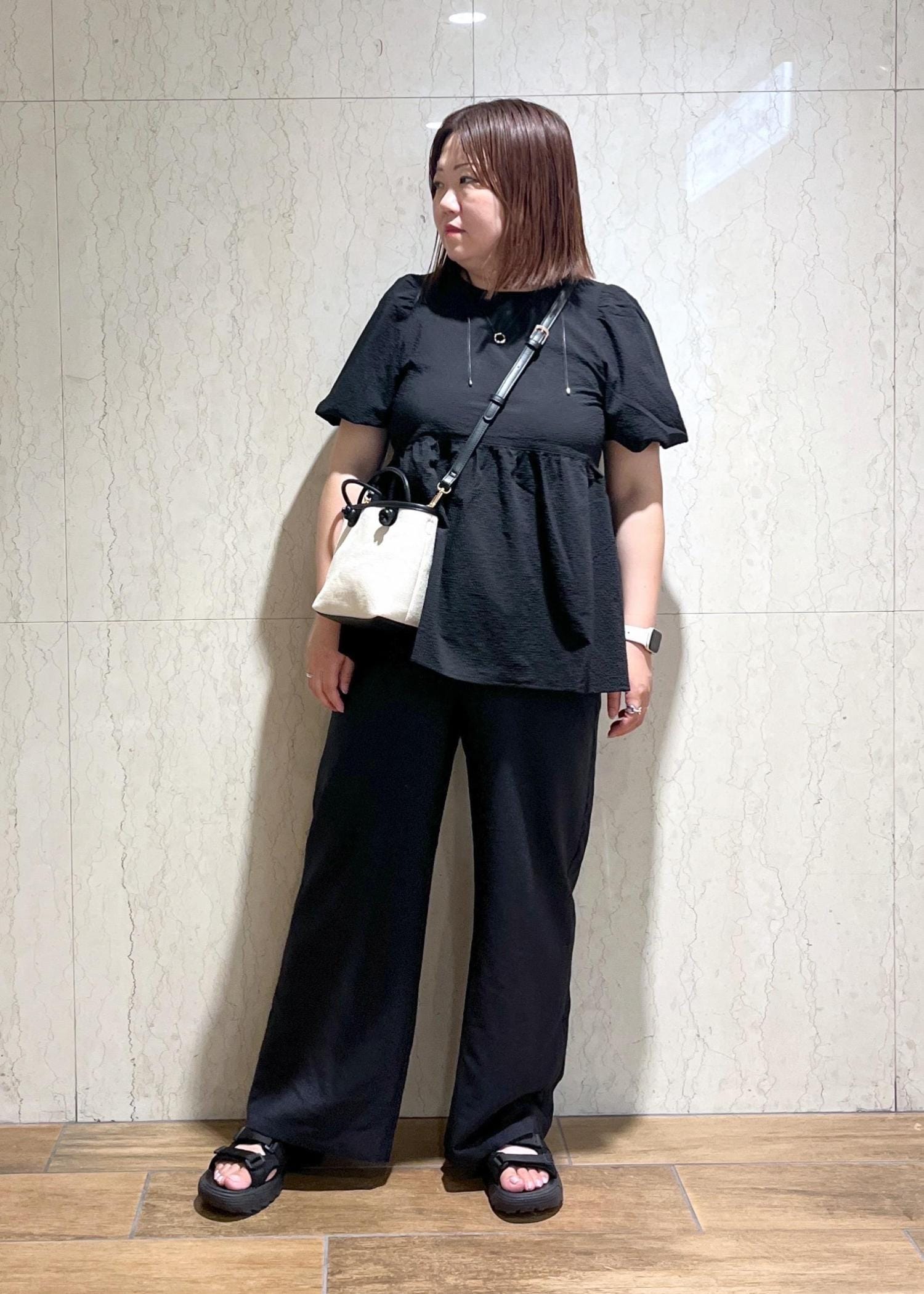ペプラムブラウスにワイドパンツを合わせたブラックコーデです。
