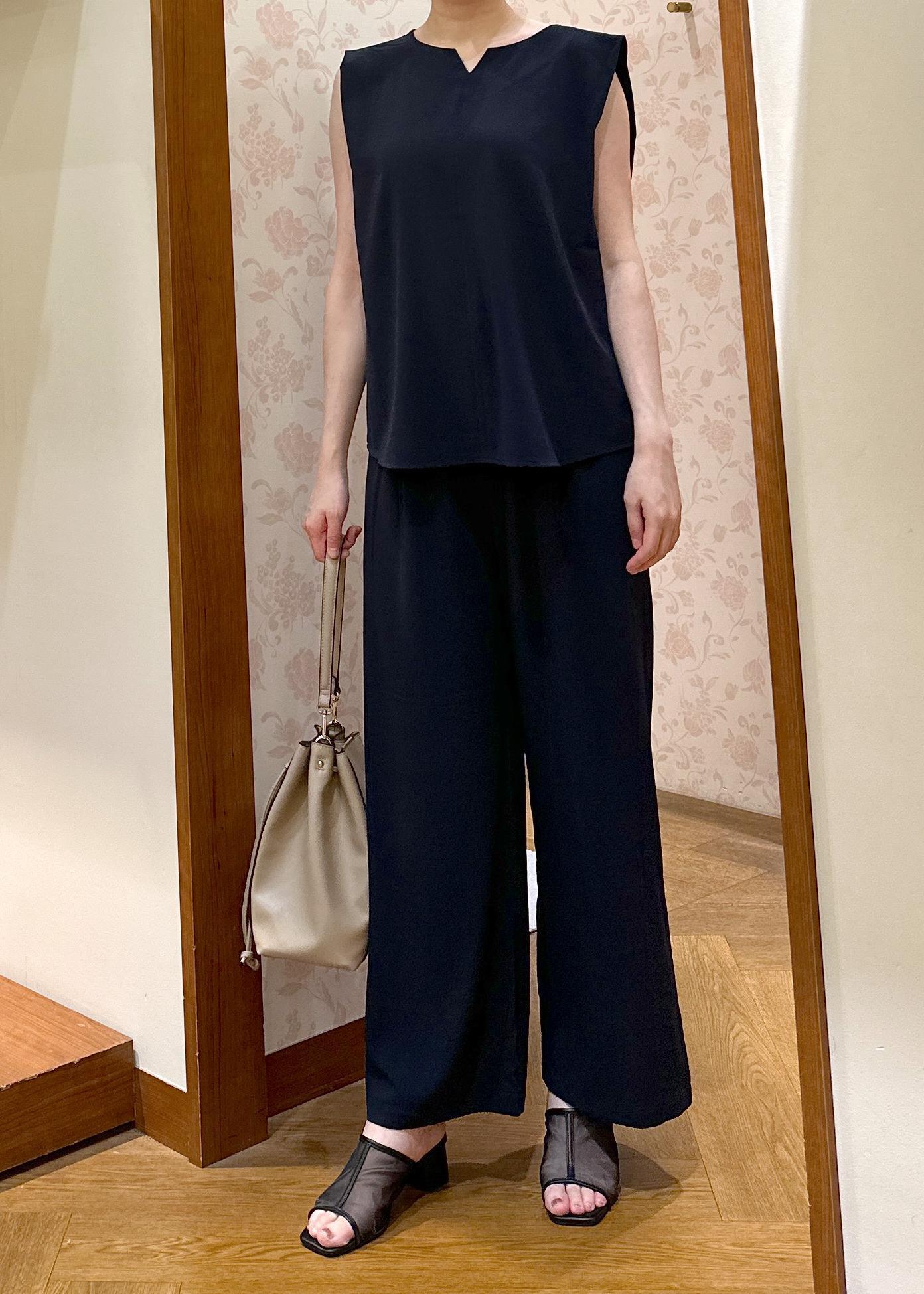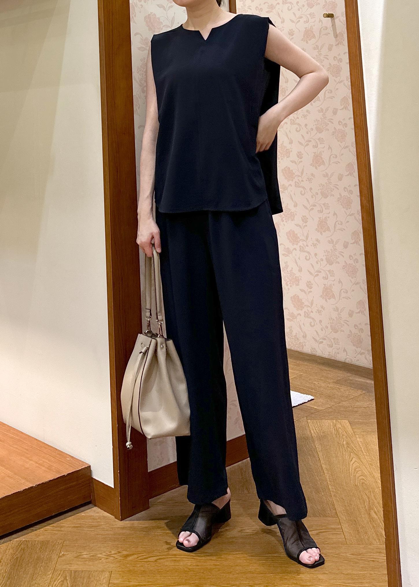 薄めなポリエステル素材で、夏でも着心地抜群のセットアップコーデです!汗をかいても安心です◎アクセサリーをプラスして結婚式や会食にも。