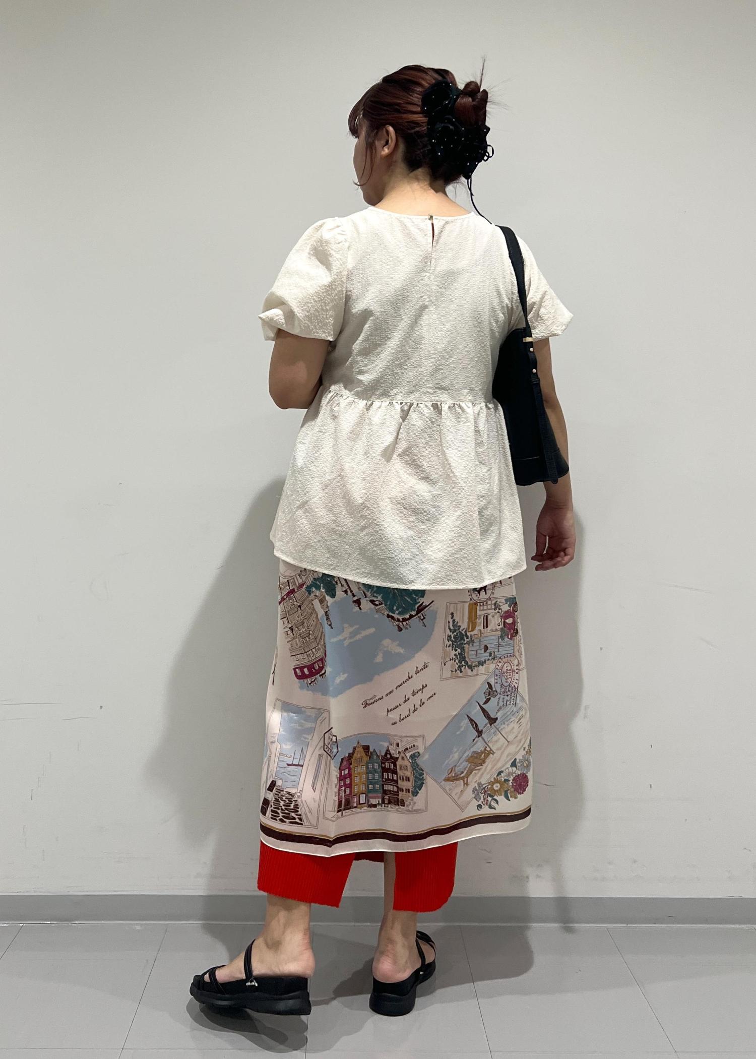バルーンスリーブがかわいいペプラムブラウス。凹凸感のある素材感でデザイン性抜群です!着丈長めで体型カバーにもなります。