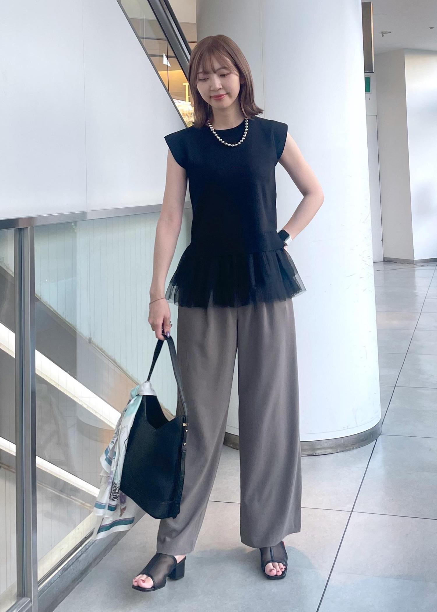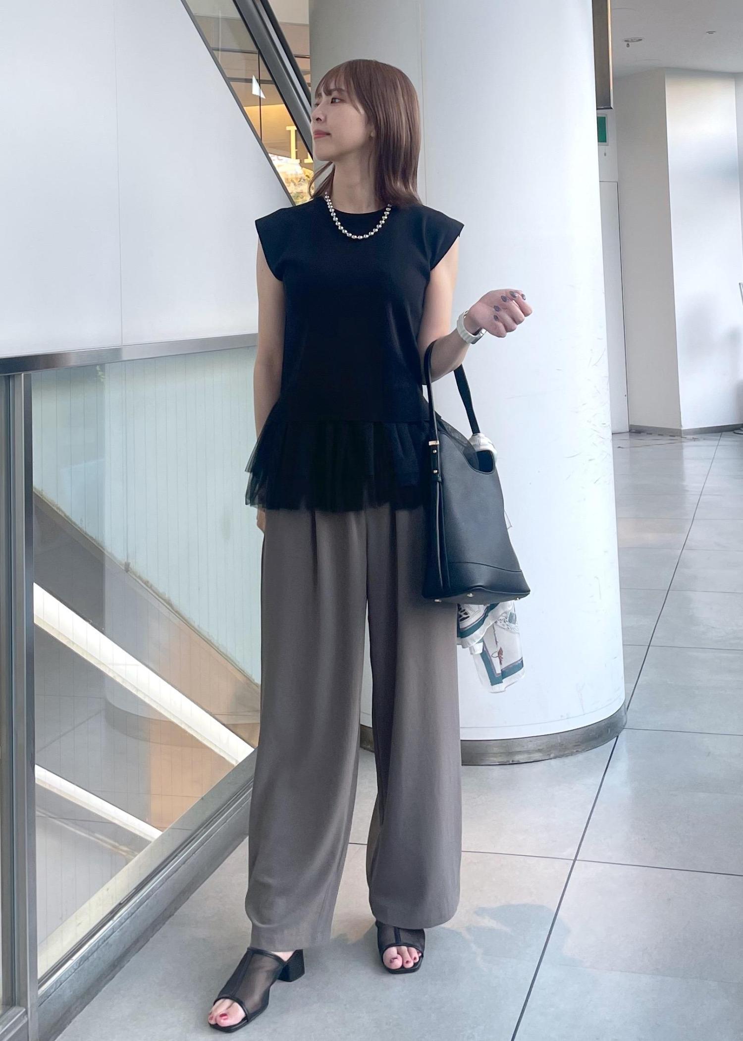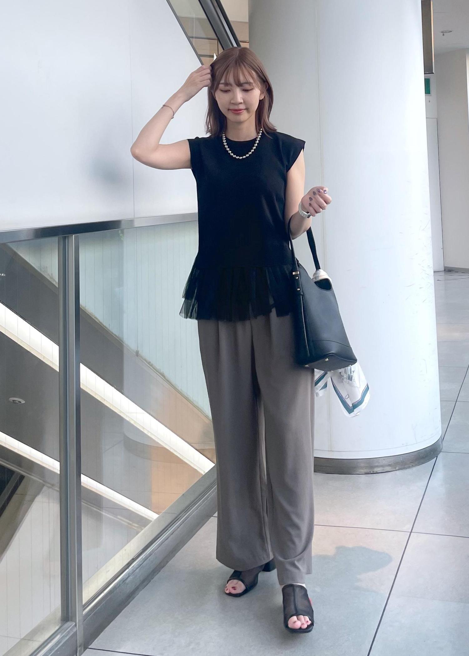 まだまだ使えるノースリーブのトップスとパンツは両方夏物ですが、色の組み合わせによって秋っぽいスタイルになります。