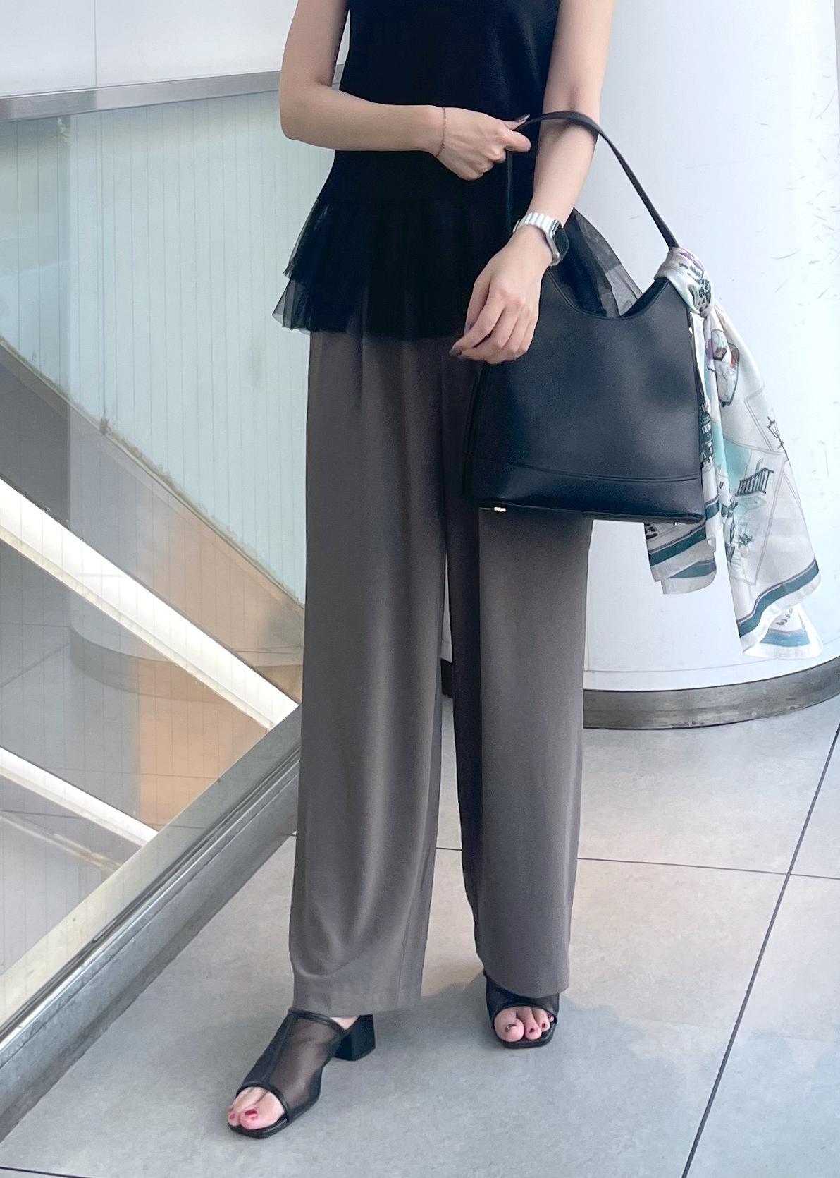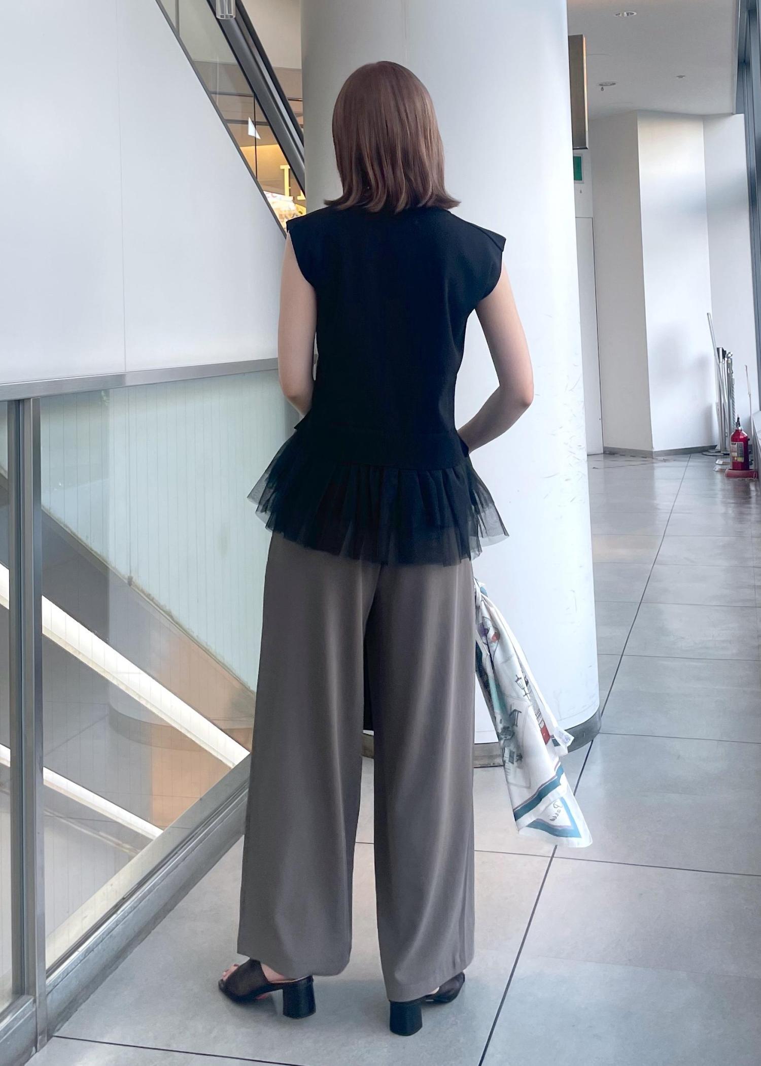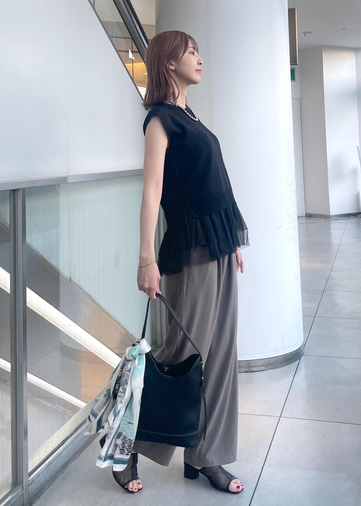まだまだ使えるノースリーブのトップスとパンツは両方夏物ですが、色の組み合わせによって秋っぽいスタイルになります。