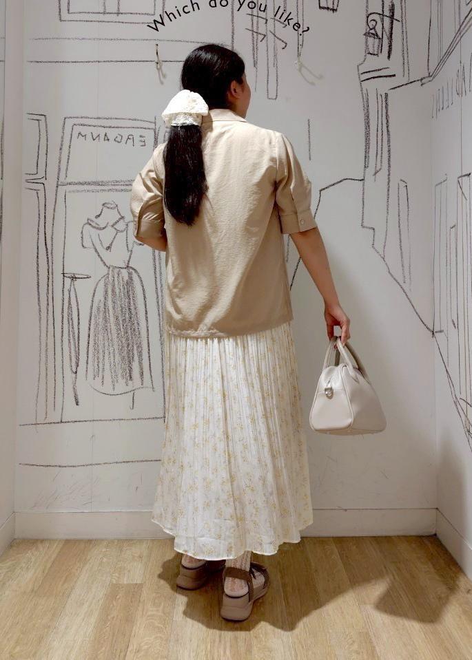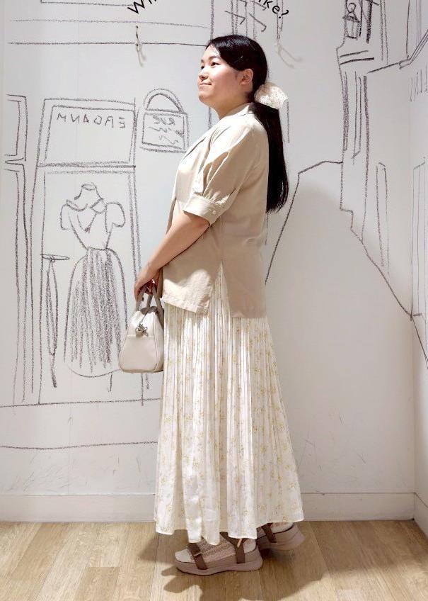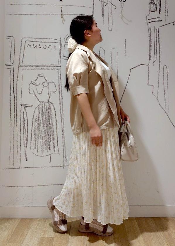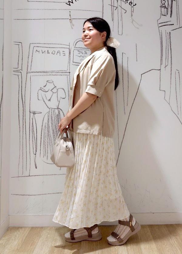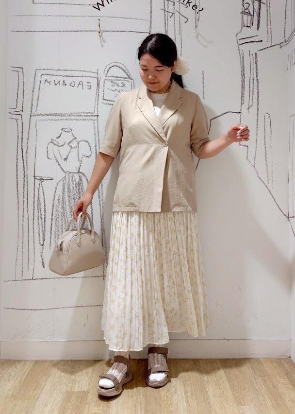ジャケットを合わせてフォーマル感もありつつ淡い色合いでふんわりした可愛いコーディネートにしました。