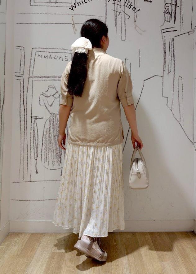 布の量がたっぷりとあるスカートですが、薄く滑らかな素材のため広がりすぎず履きやすいです。