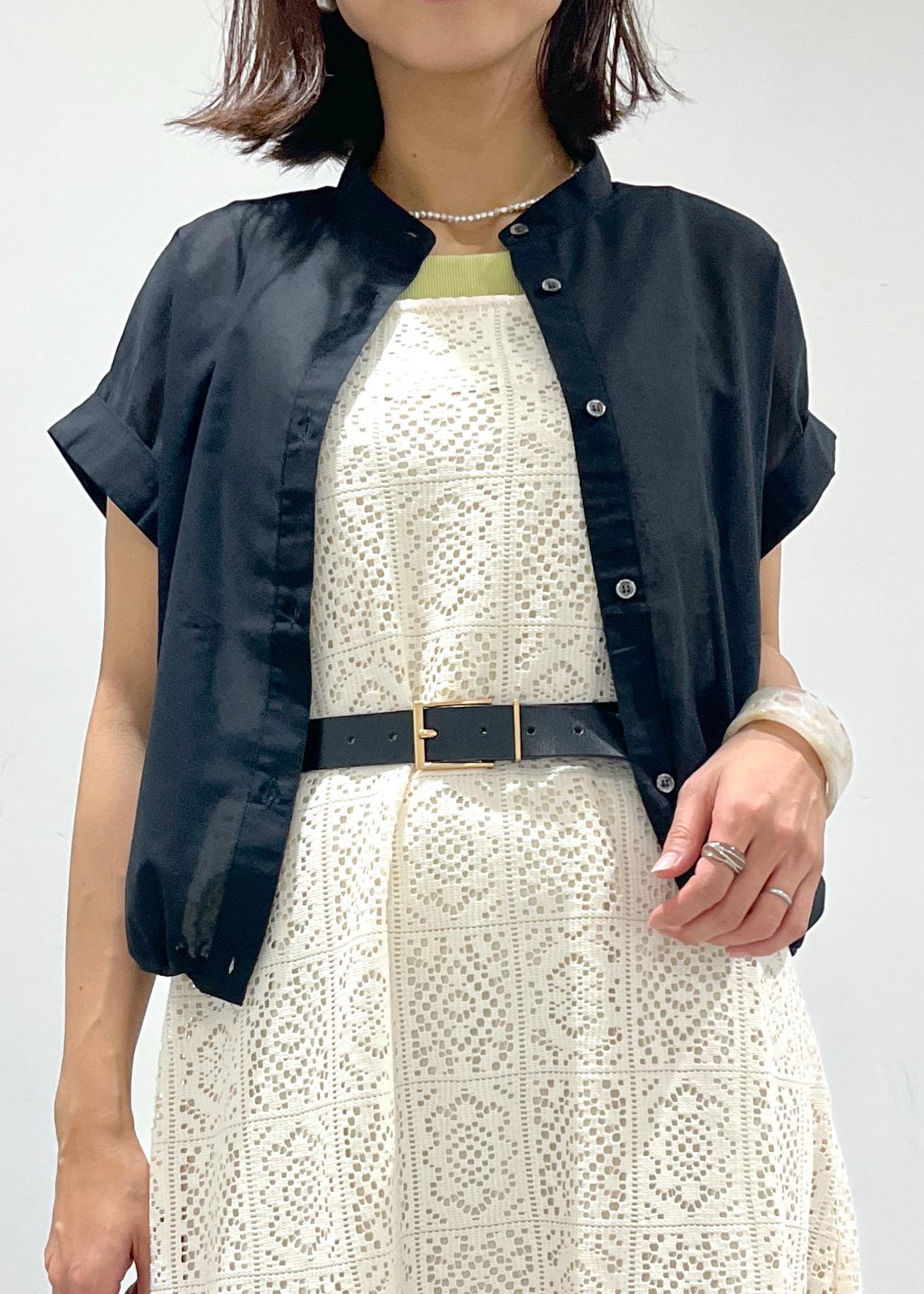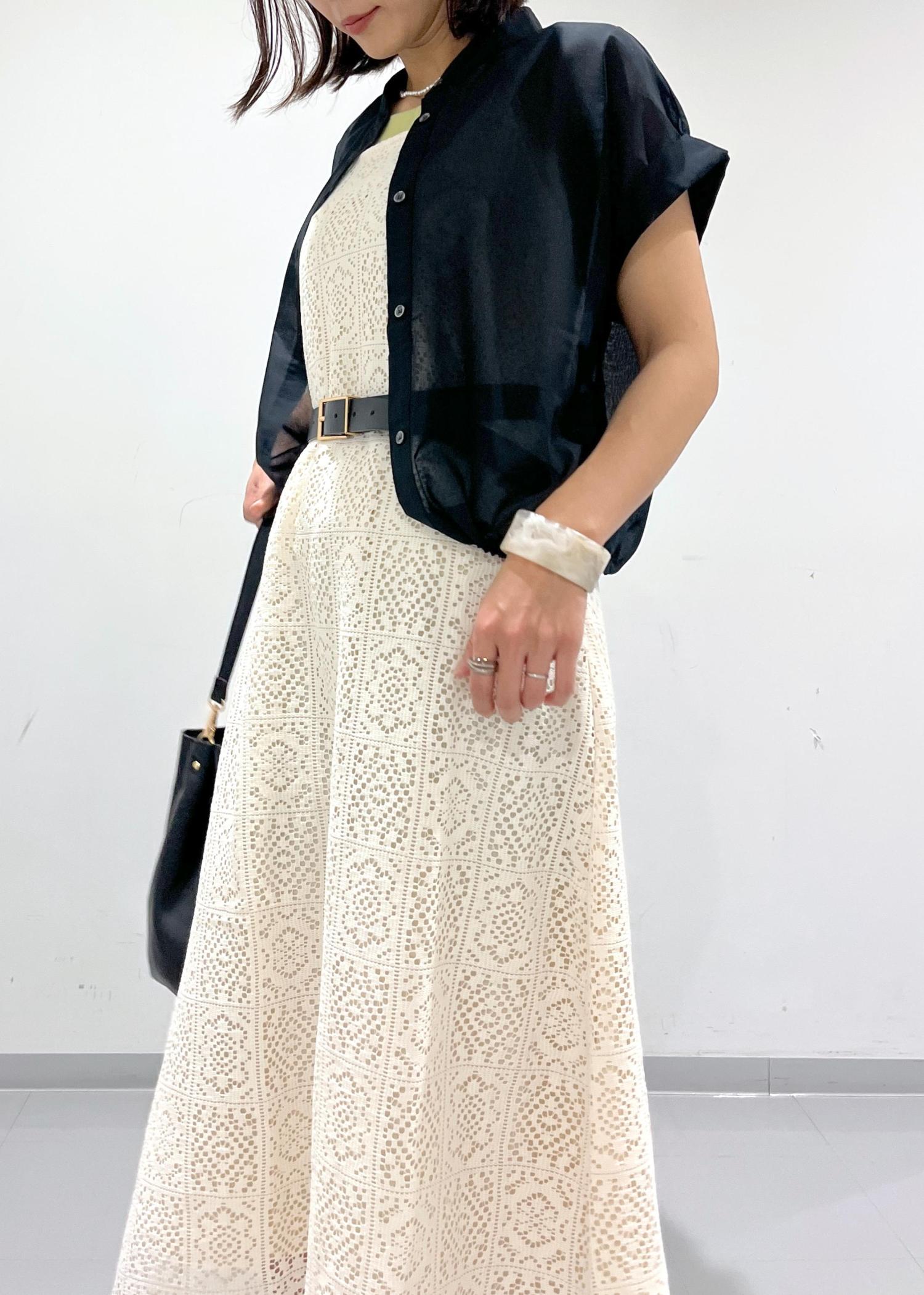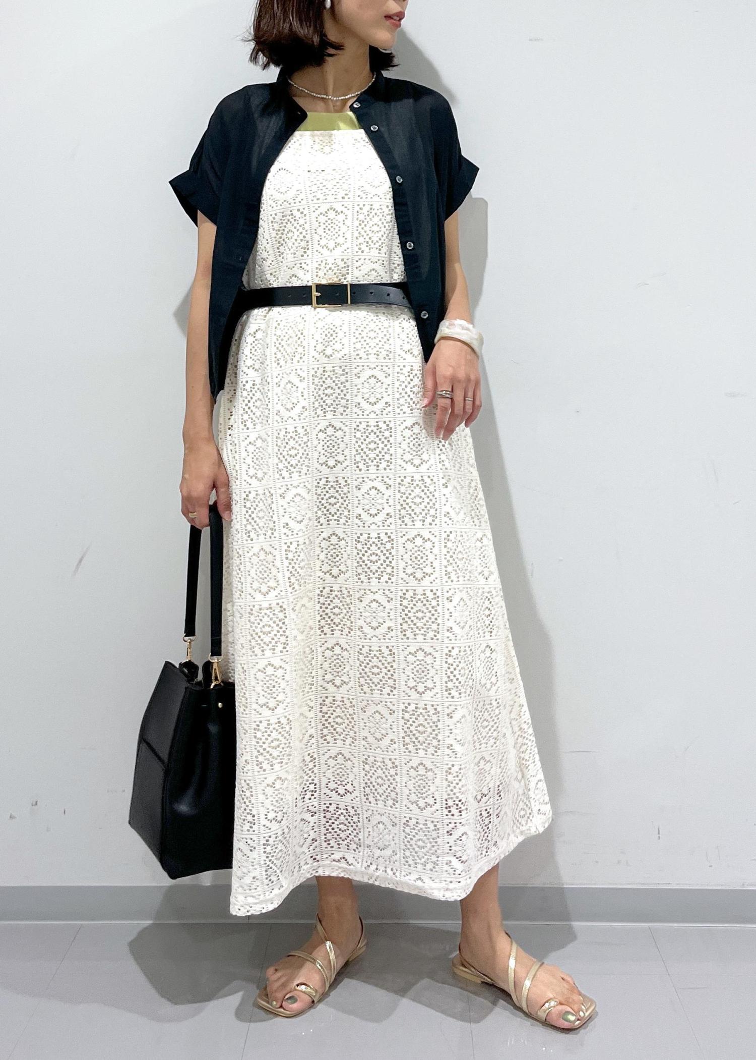 ブラックのベルトや羽織、バッグで引き締めてレースワンピでも甘くならないスタイリングに。