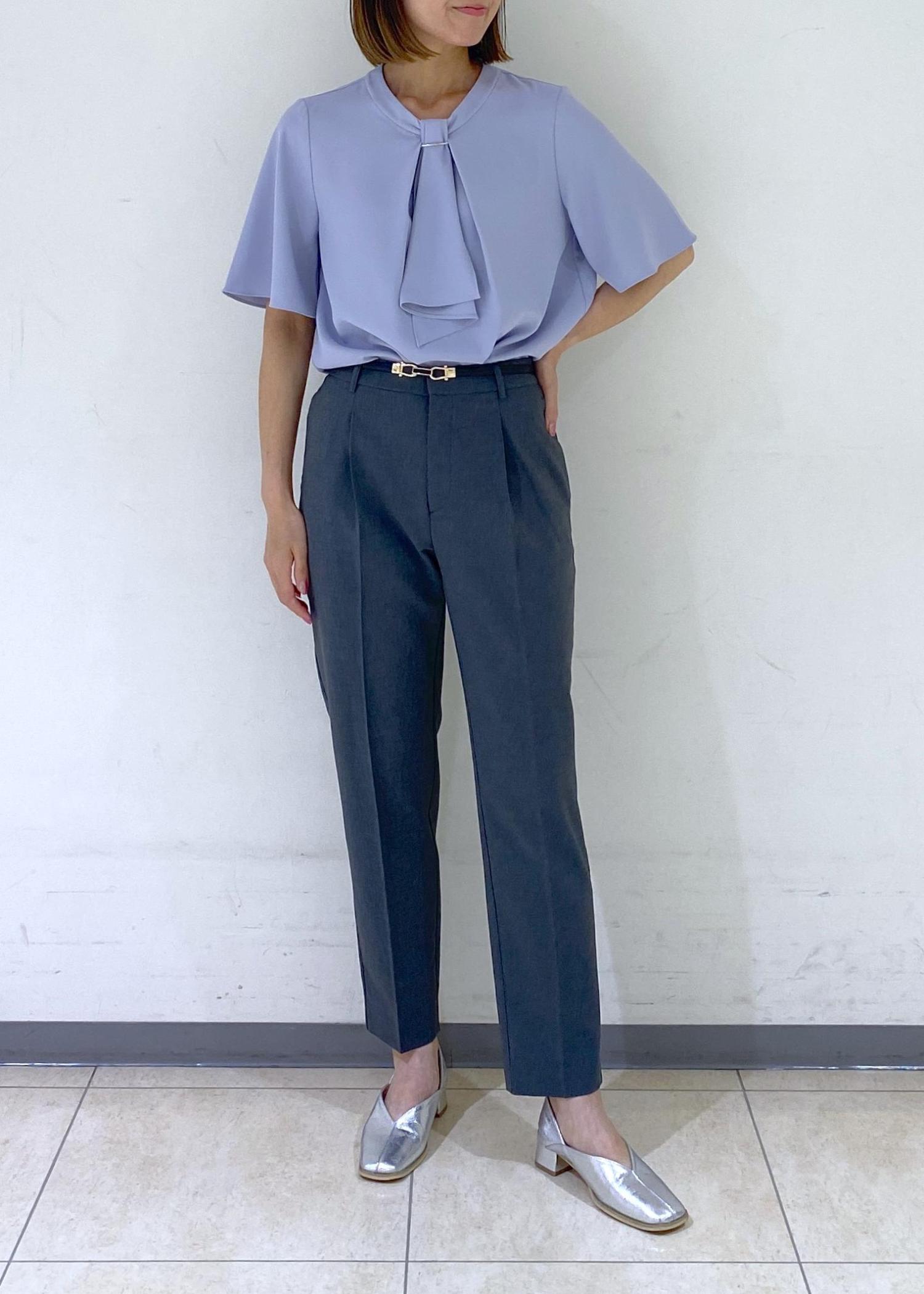 爽やかなブルーのブラウスを合わせたオフィスコーデ。