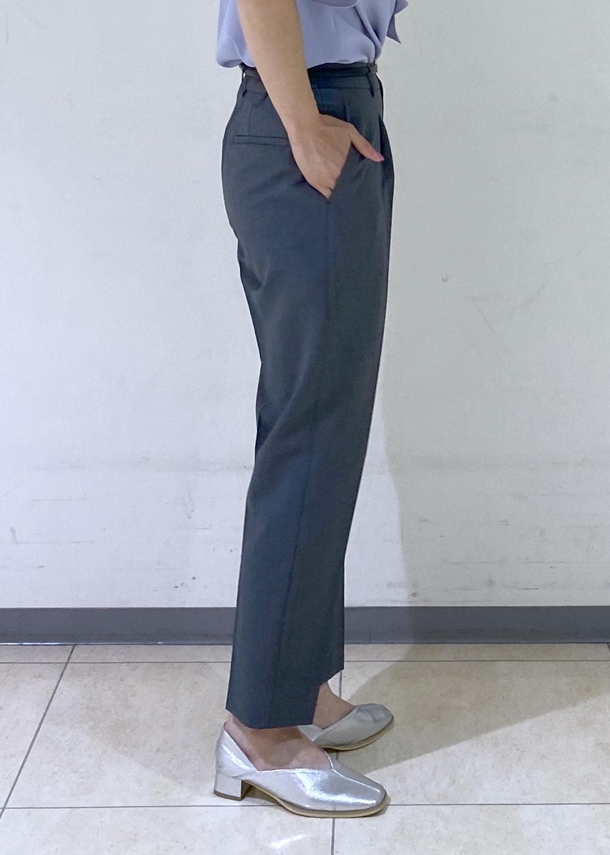 ウエストはサイドゴムで1タックが入っているので腰まわり窮屈感なく着用できます。