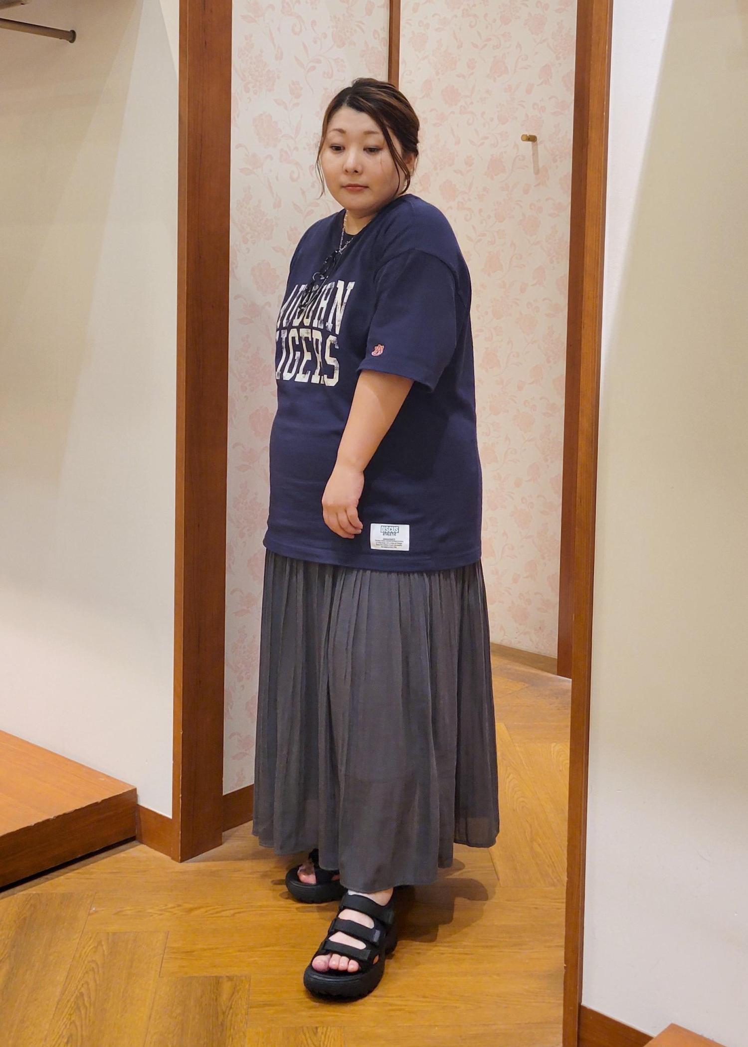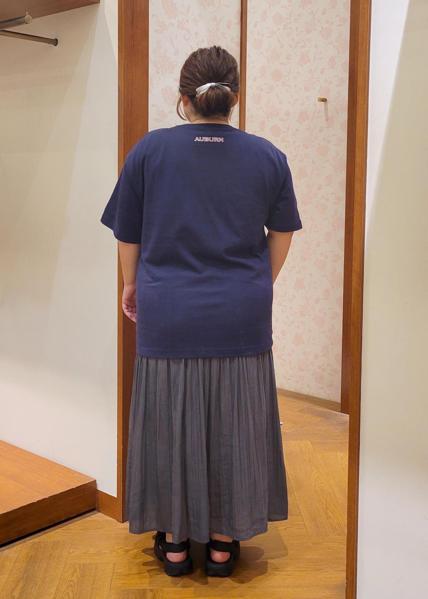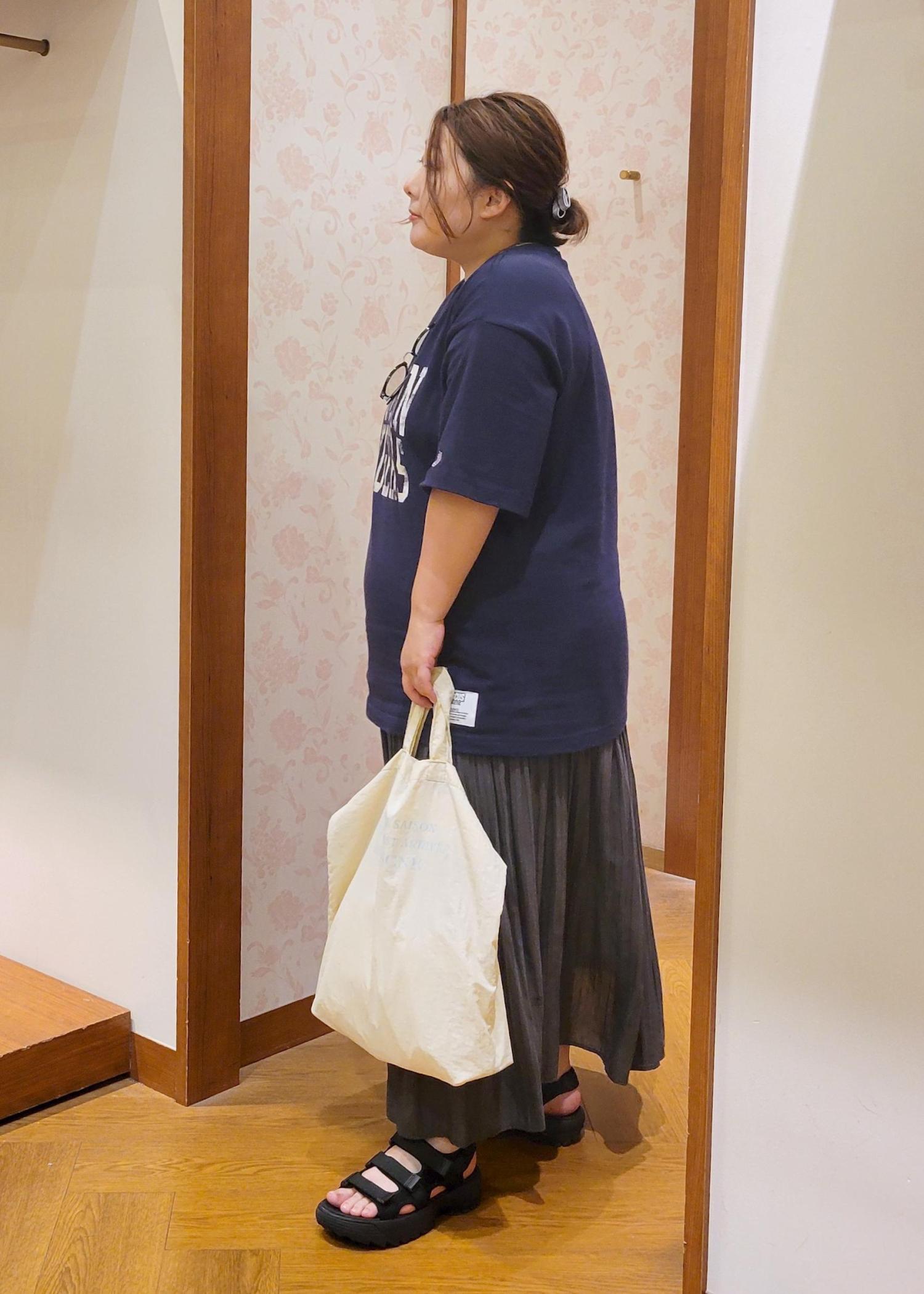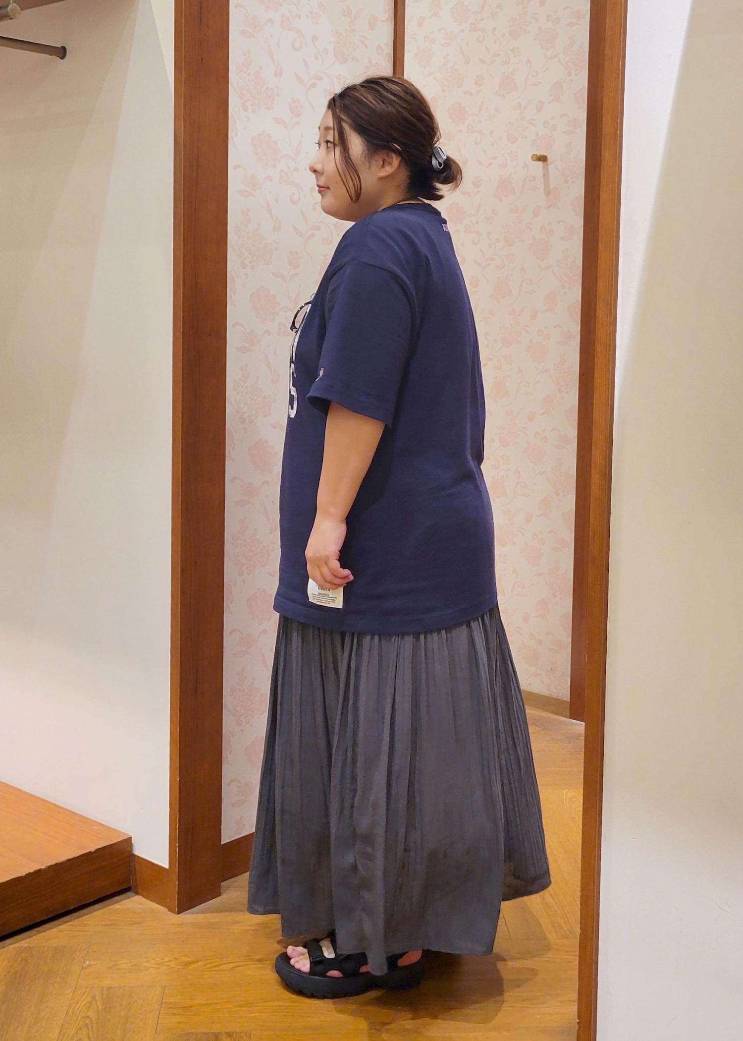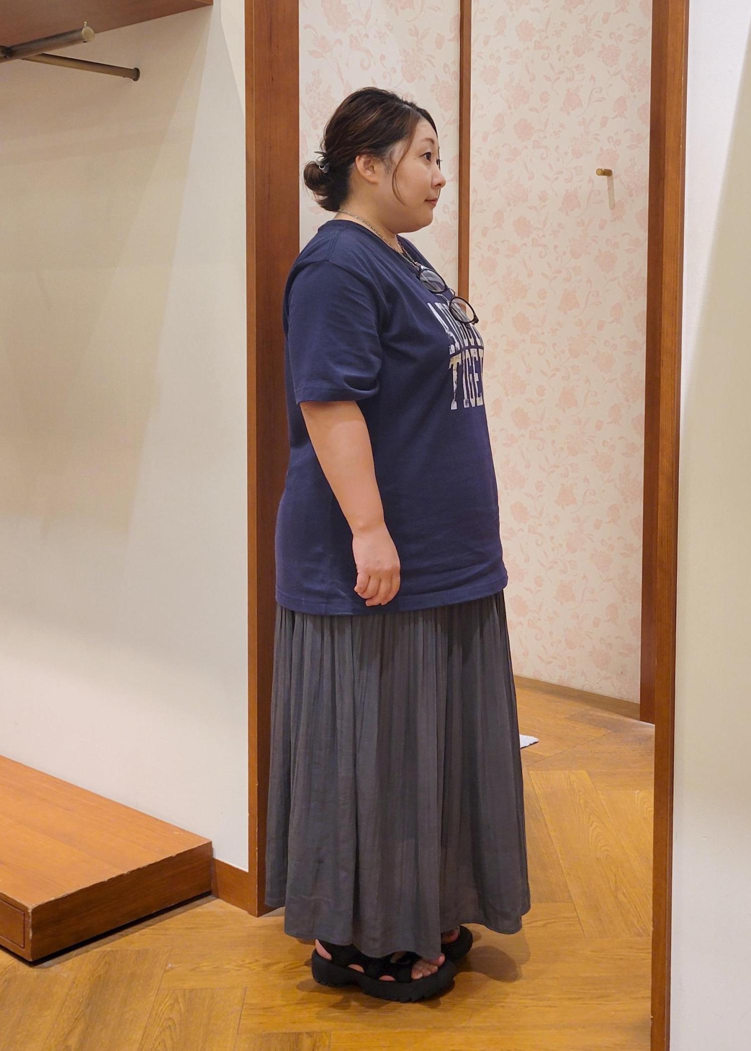 オーバーサイズで体のラインを拾わないく、着丈もお尻が隠れるので体型カバーしてくれます。