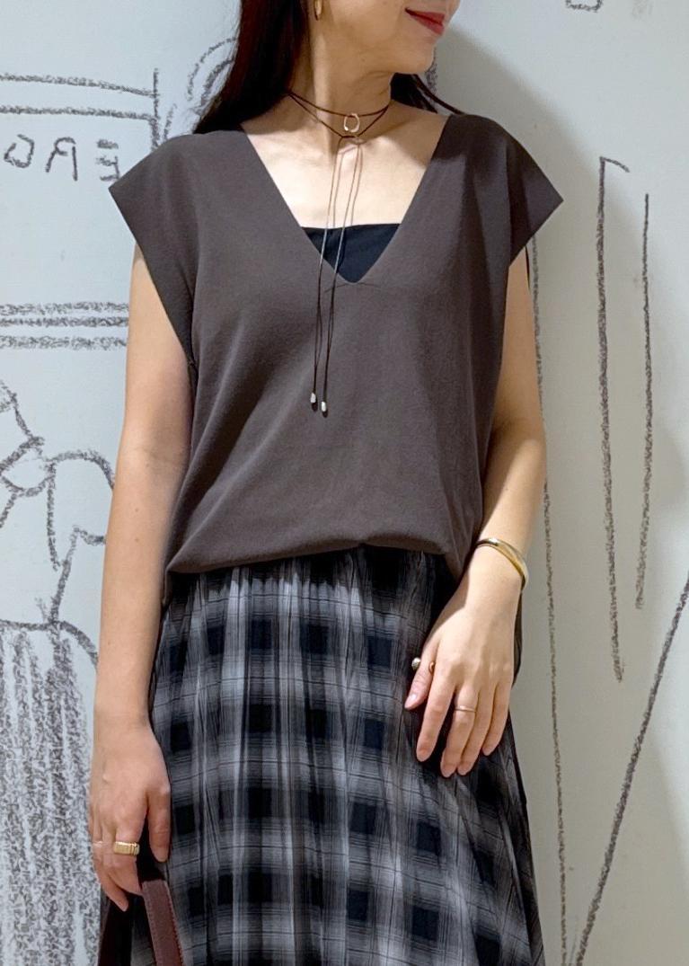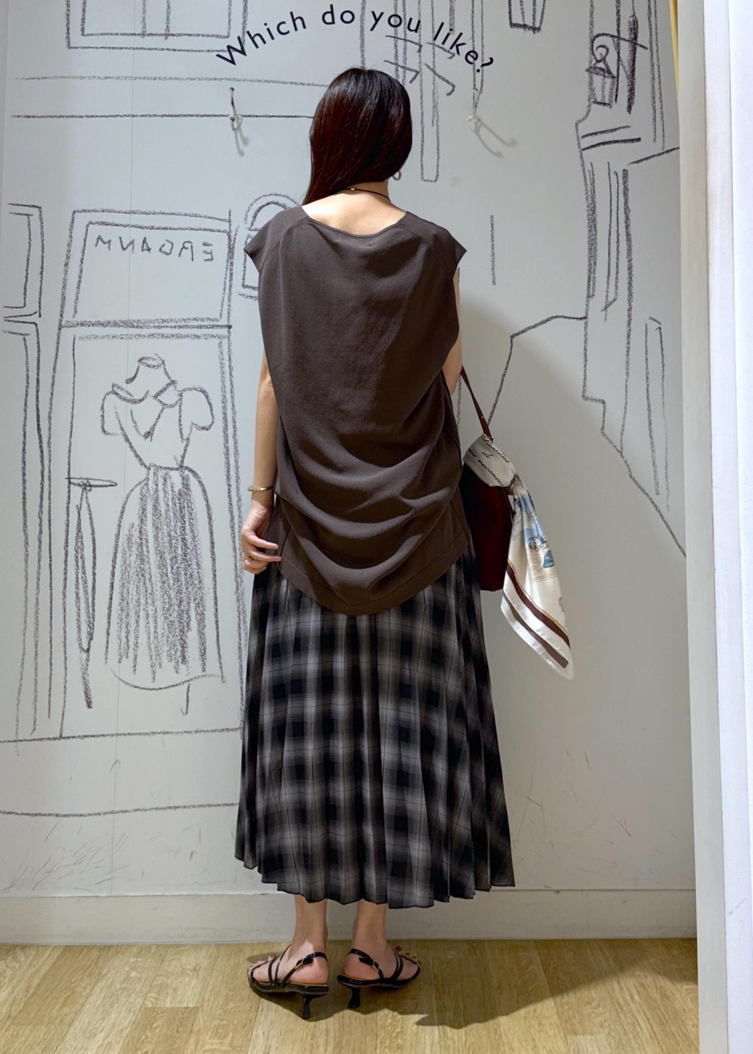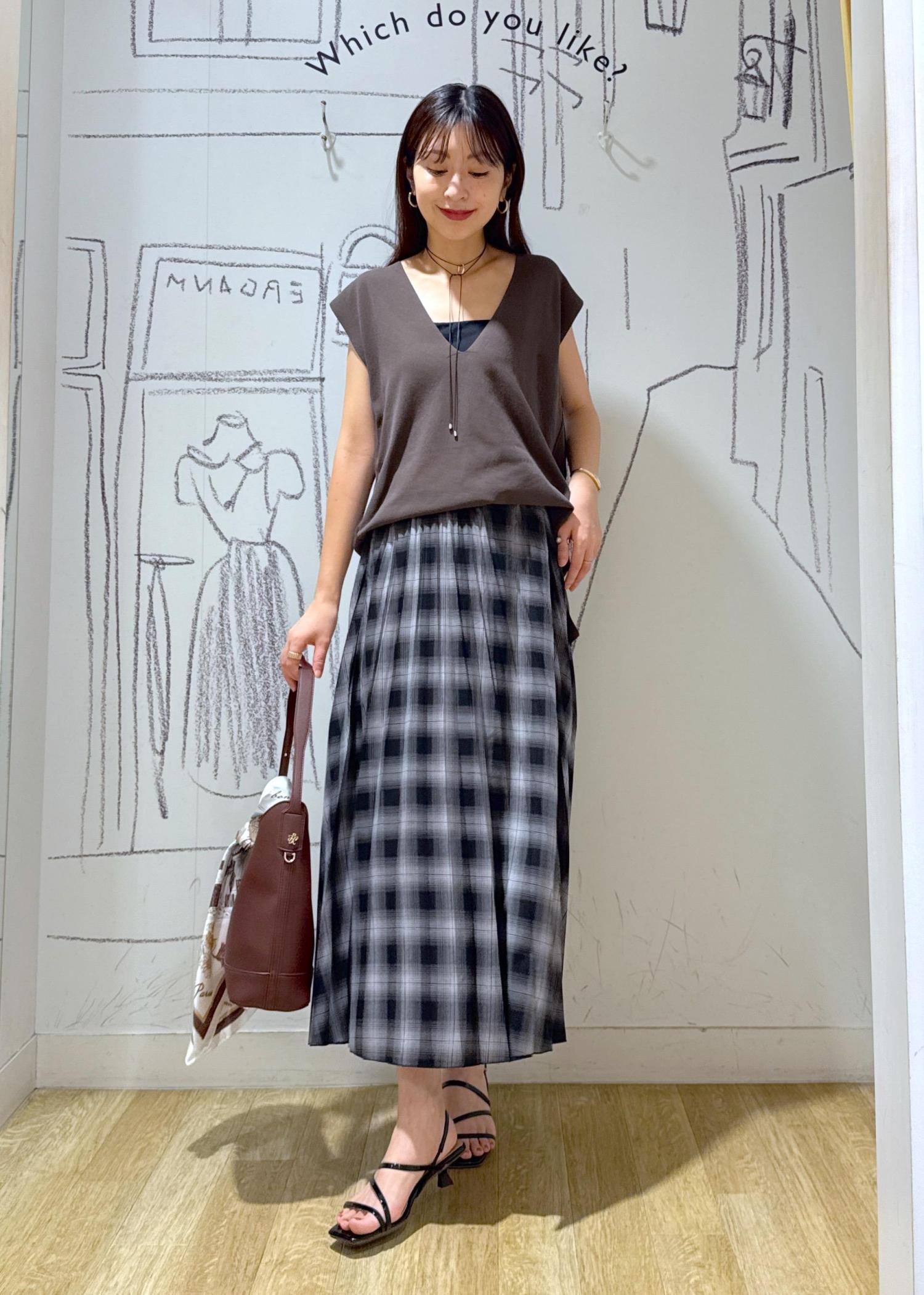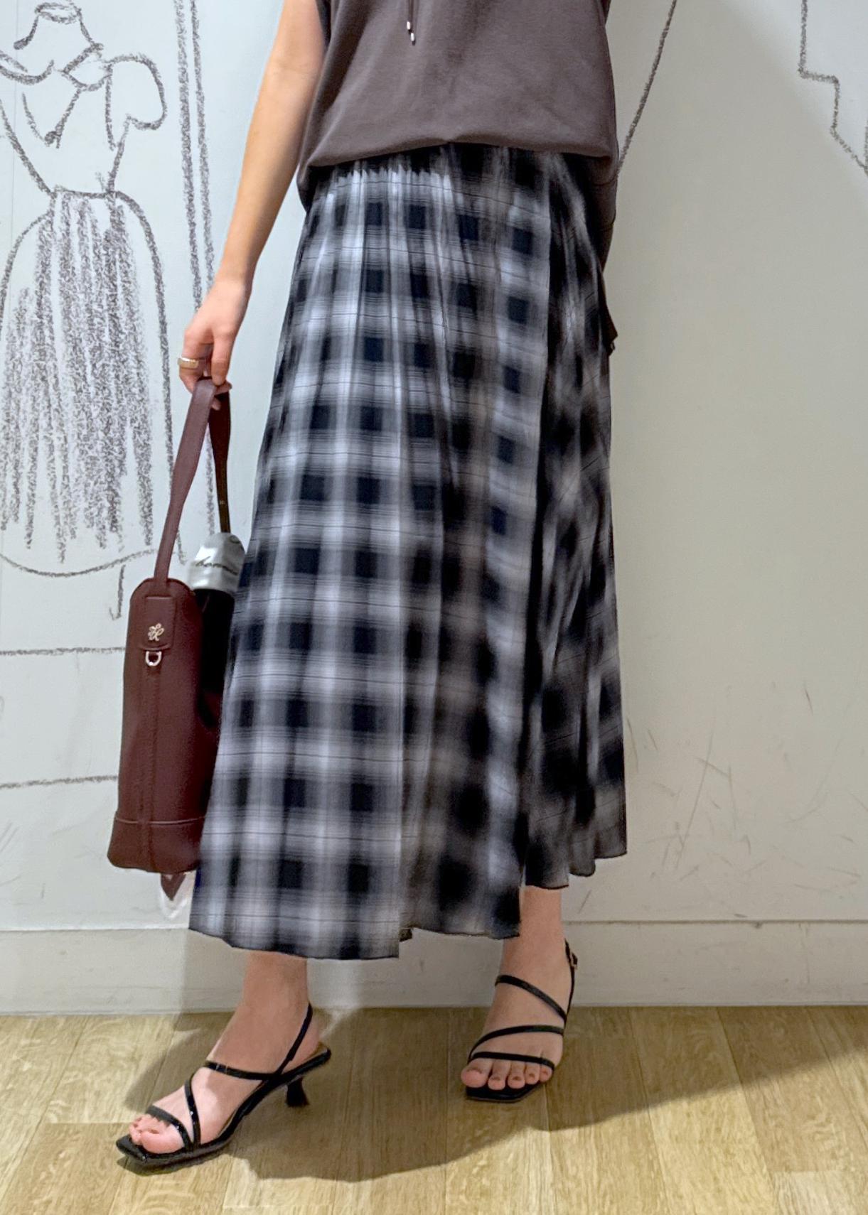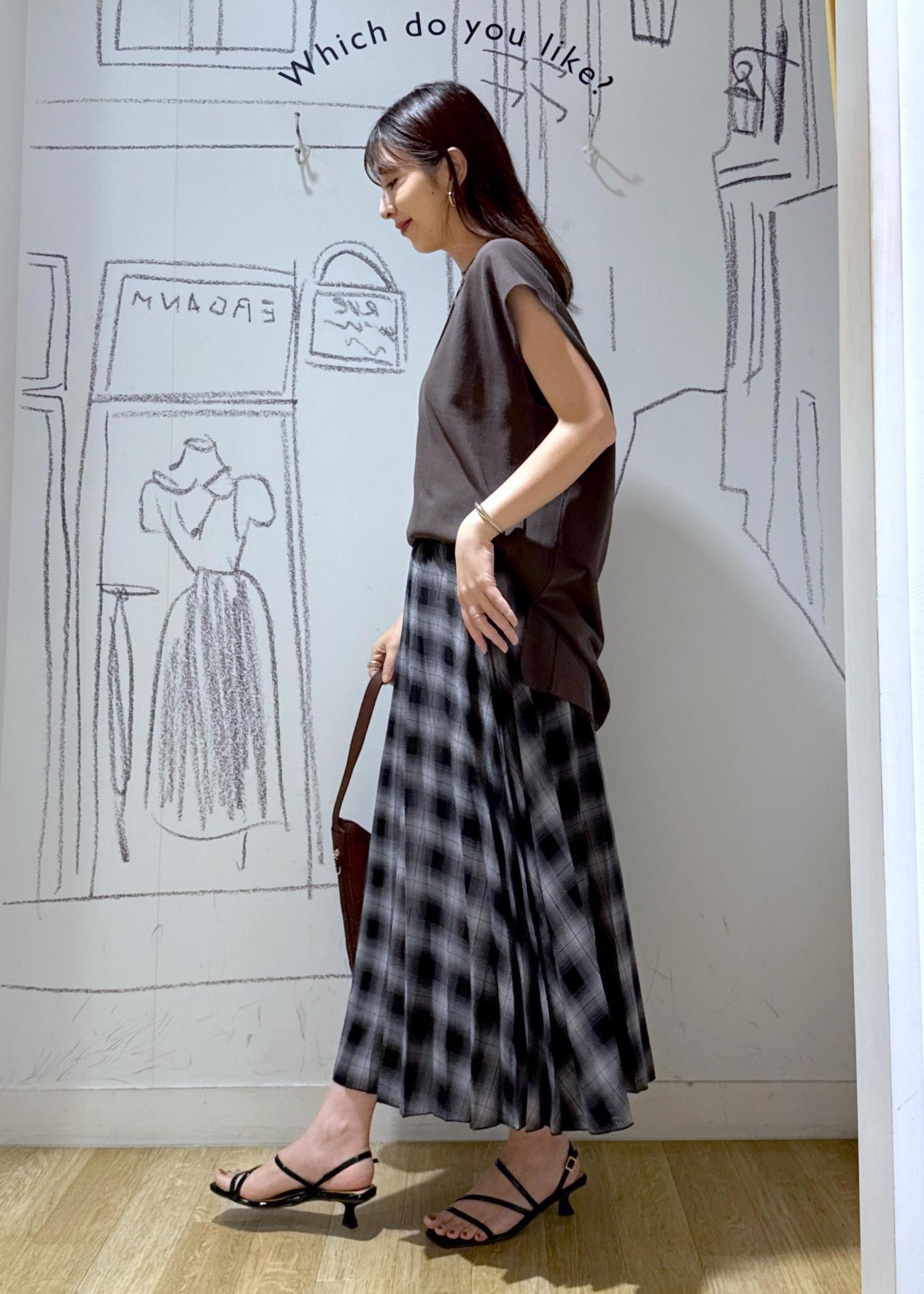 ROPÉ PICNICチェック柄プリーツスカートブラック系 / F¥4,994レビュー落ち感のあるスッキリしたシルエットです。プリーツ幅が太いのでどこかレトロな雰囲気を感じさせます。162㎝ですねに掛かる長さです。