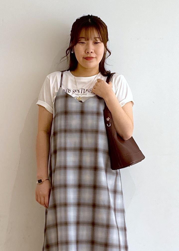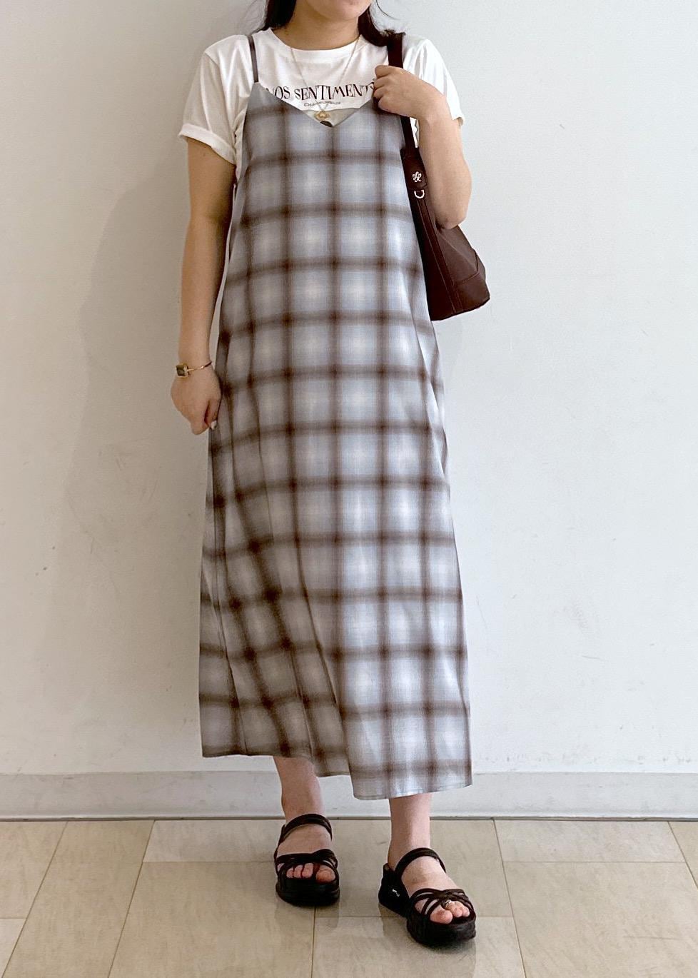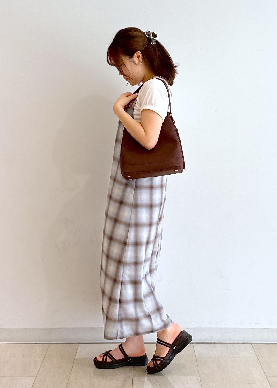爽やかなキャミワンピースにブラウンのアイテムを組み合わせることで可愛すぎない大人の雰囲気も出してくれます♪
