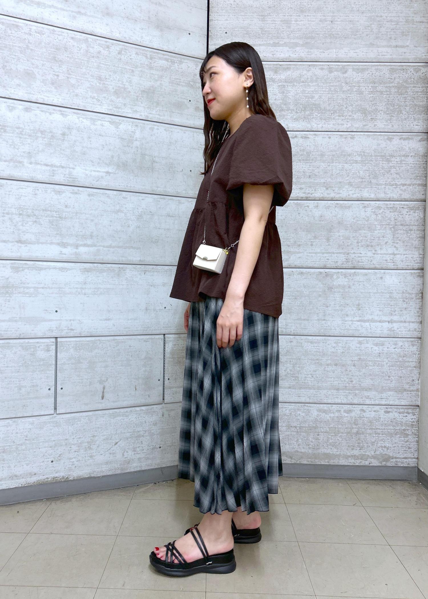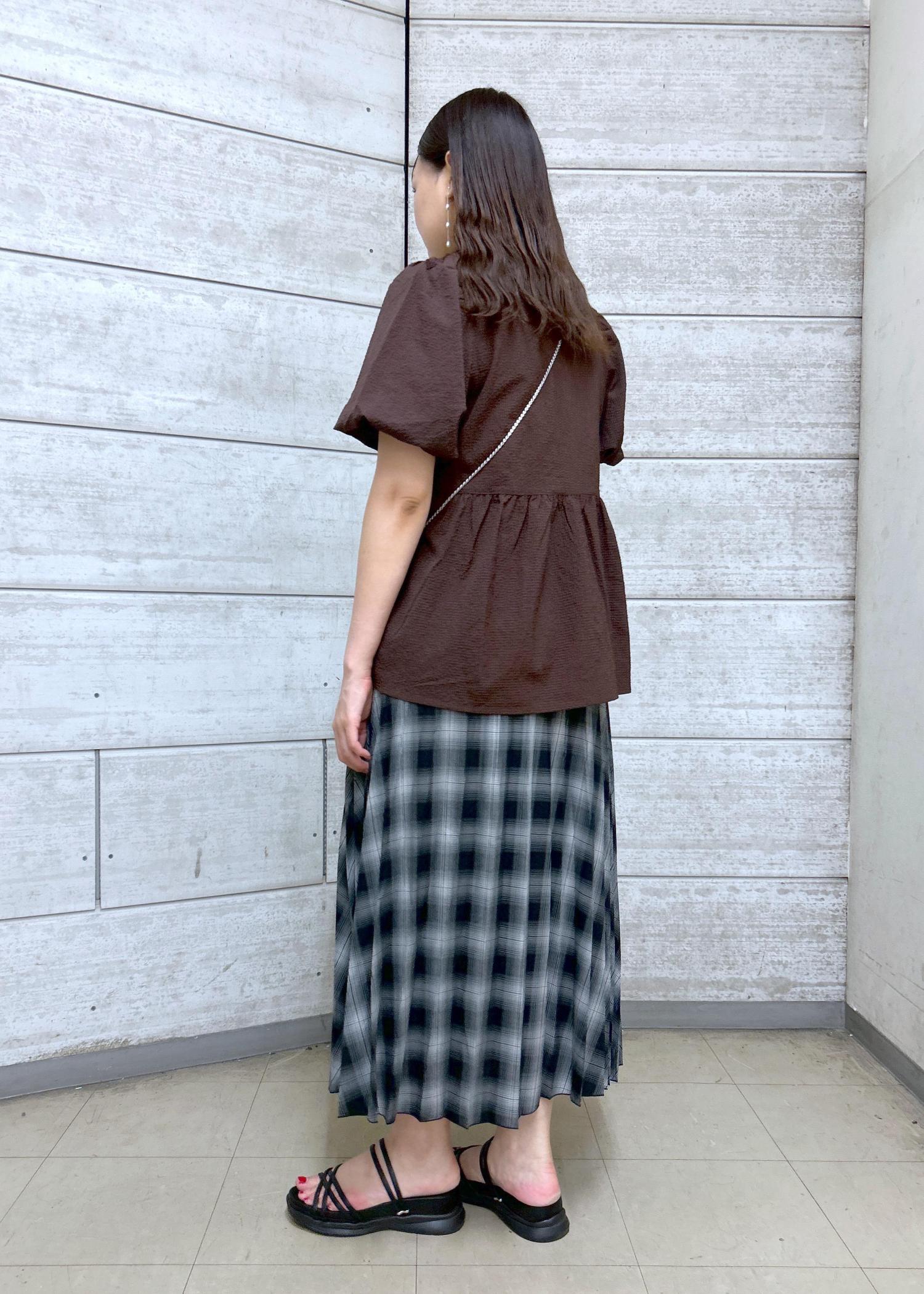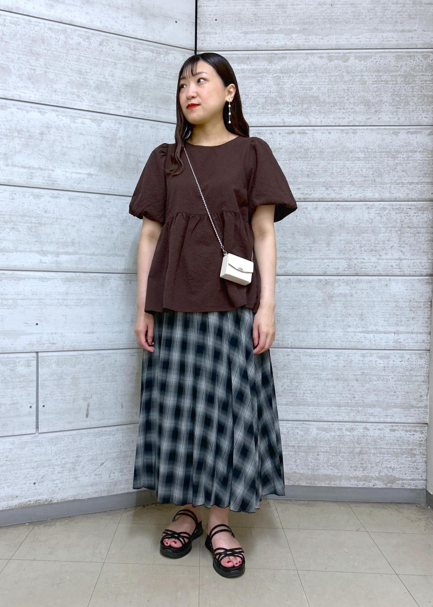 ブラウンのブラウスにチェックのスカートを合わせた秋カラーを取り入れたスタイリングです。
