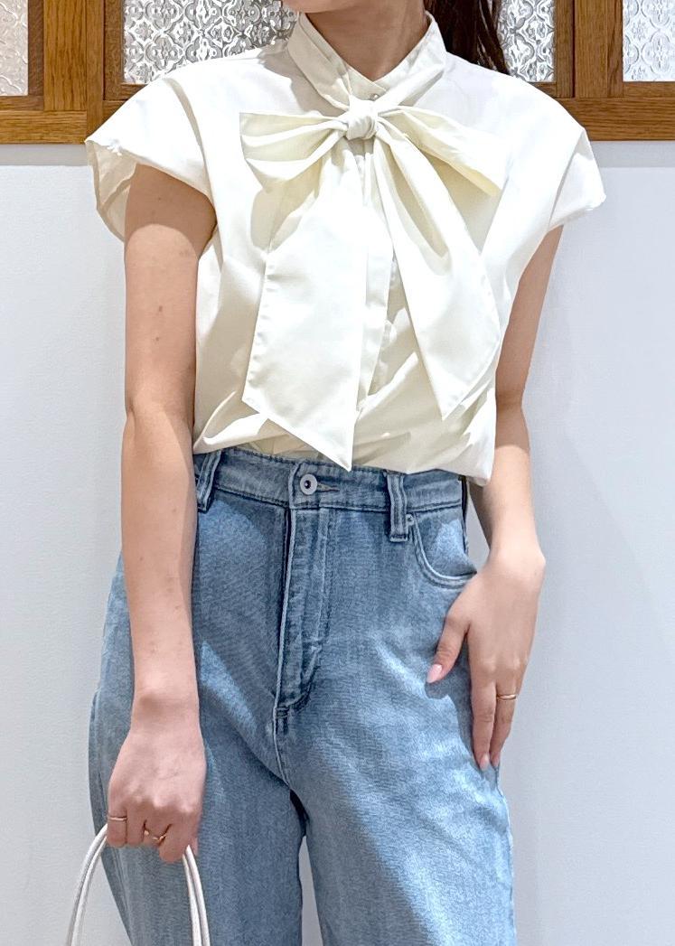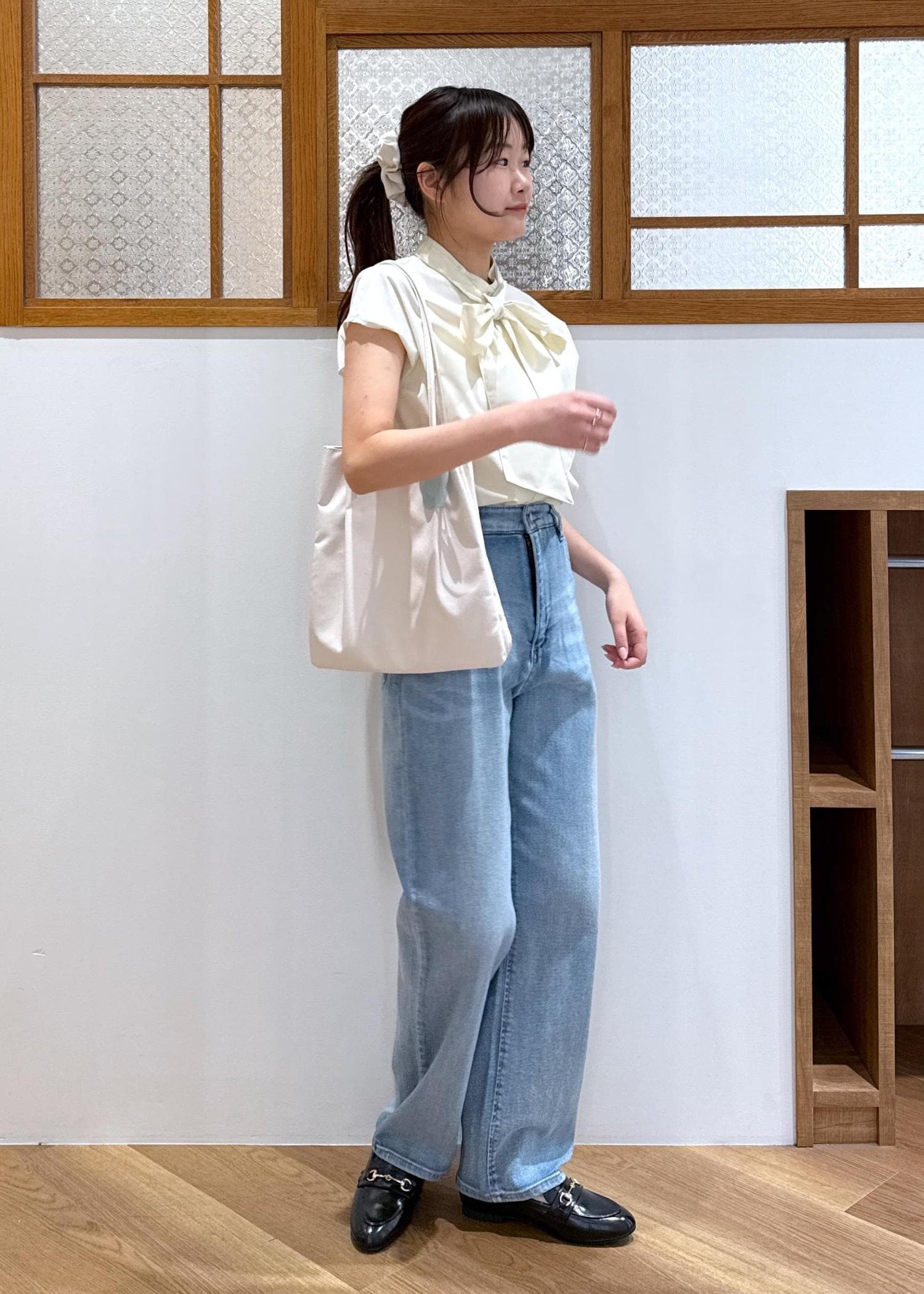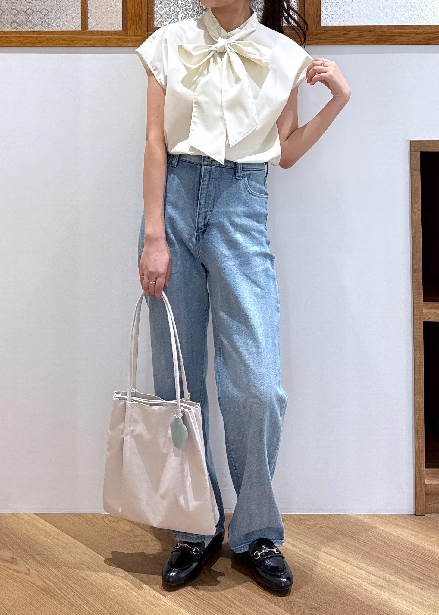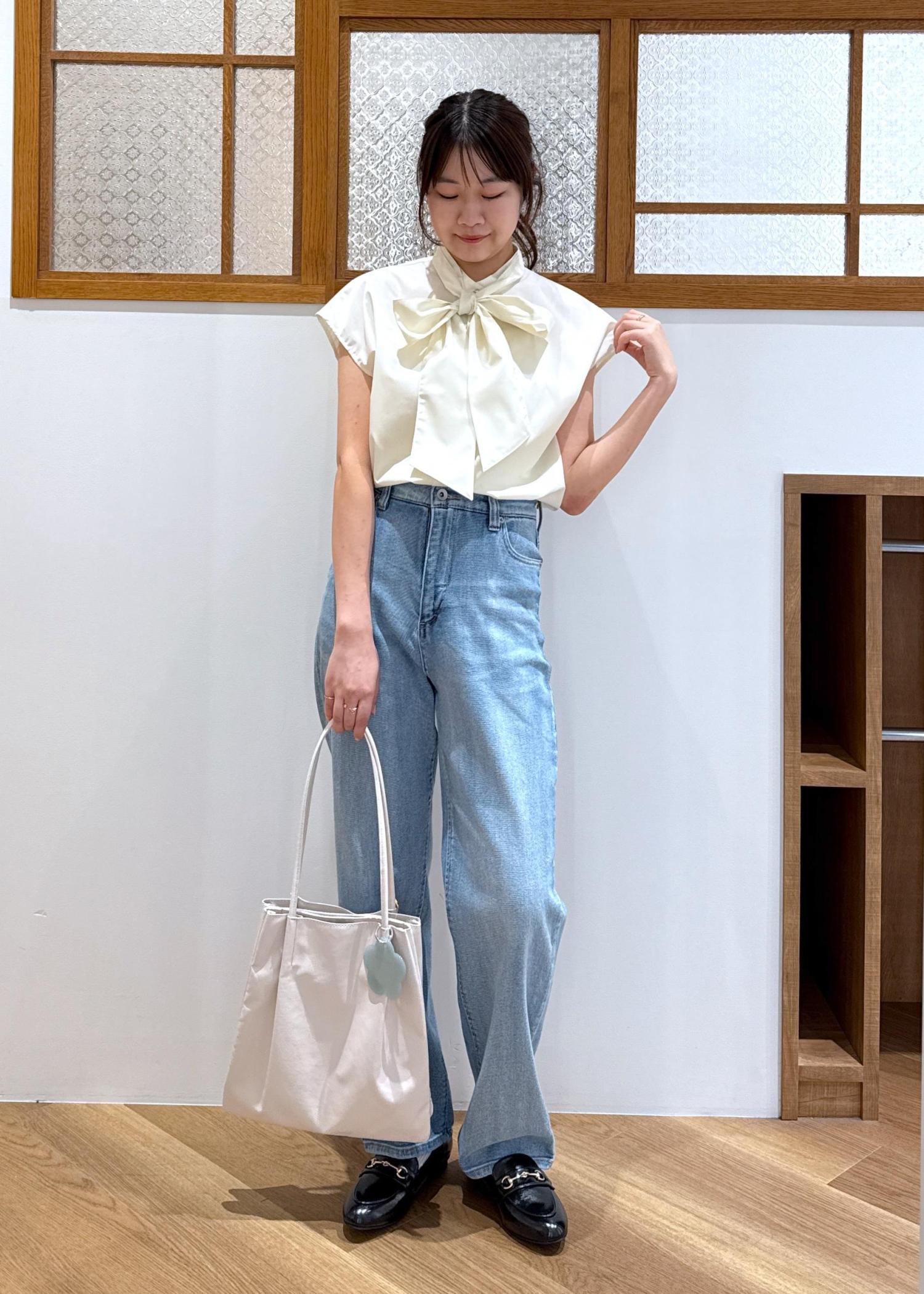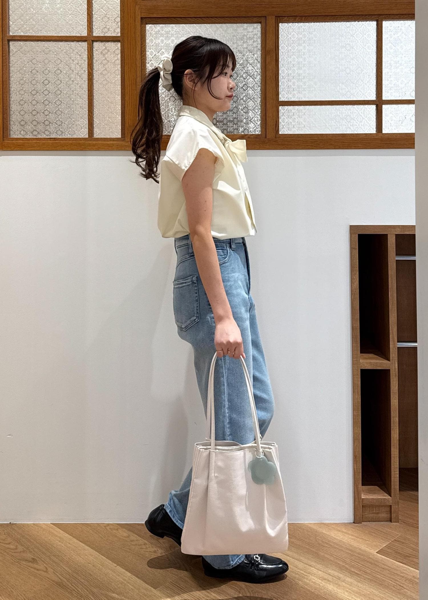 ボウタイ付きのイエローブラウスにデニムを合わせた、カジュアルさを残したガーリーコーデです。