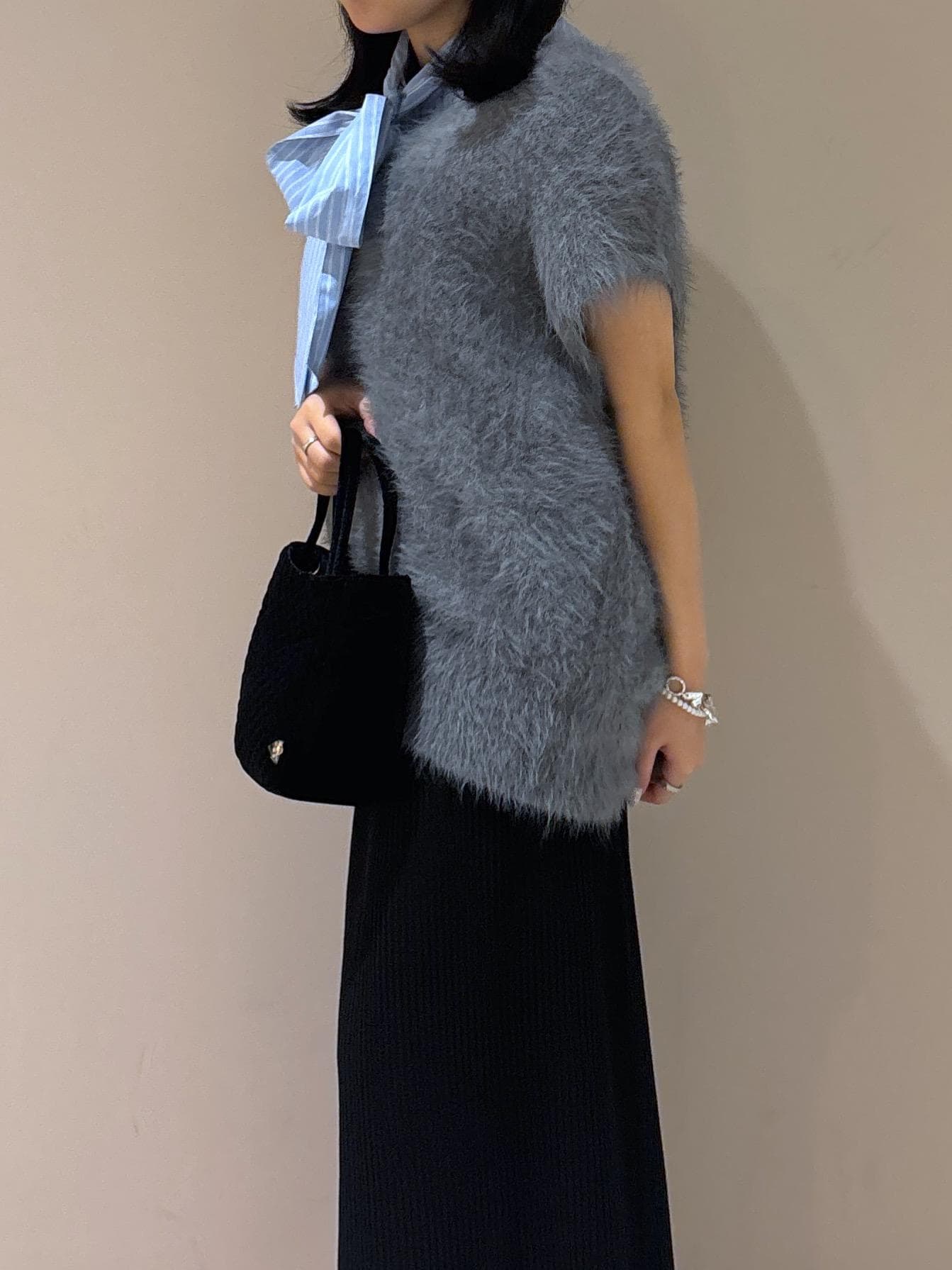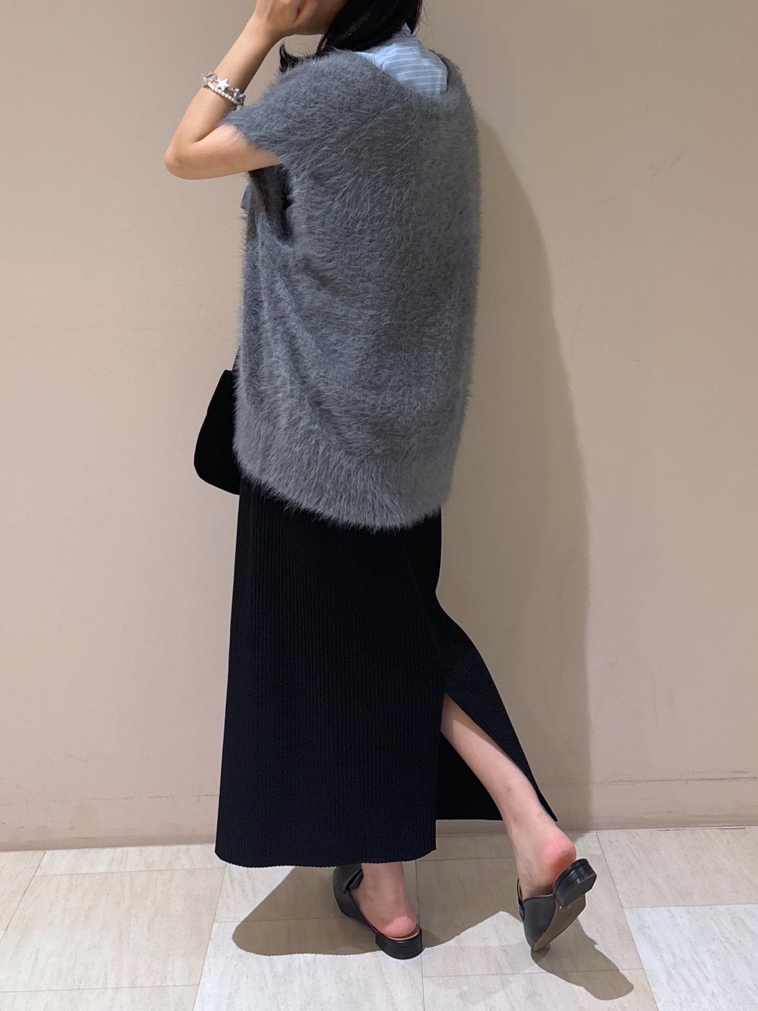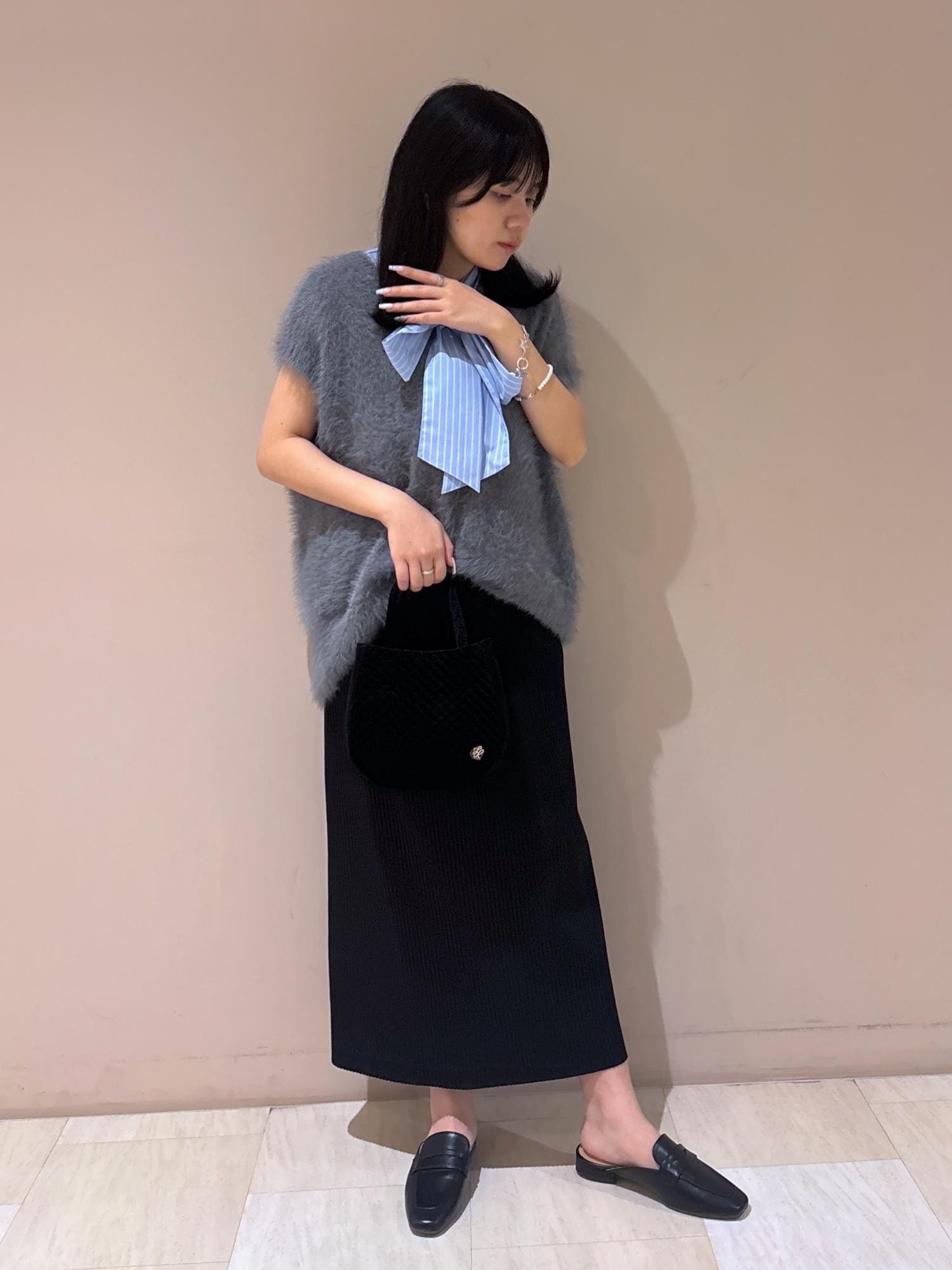リボンがアクセントなブラウスに、秋らしいファーベストを