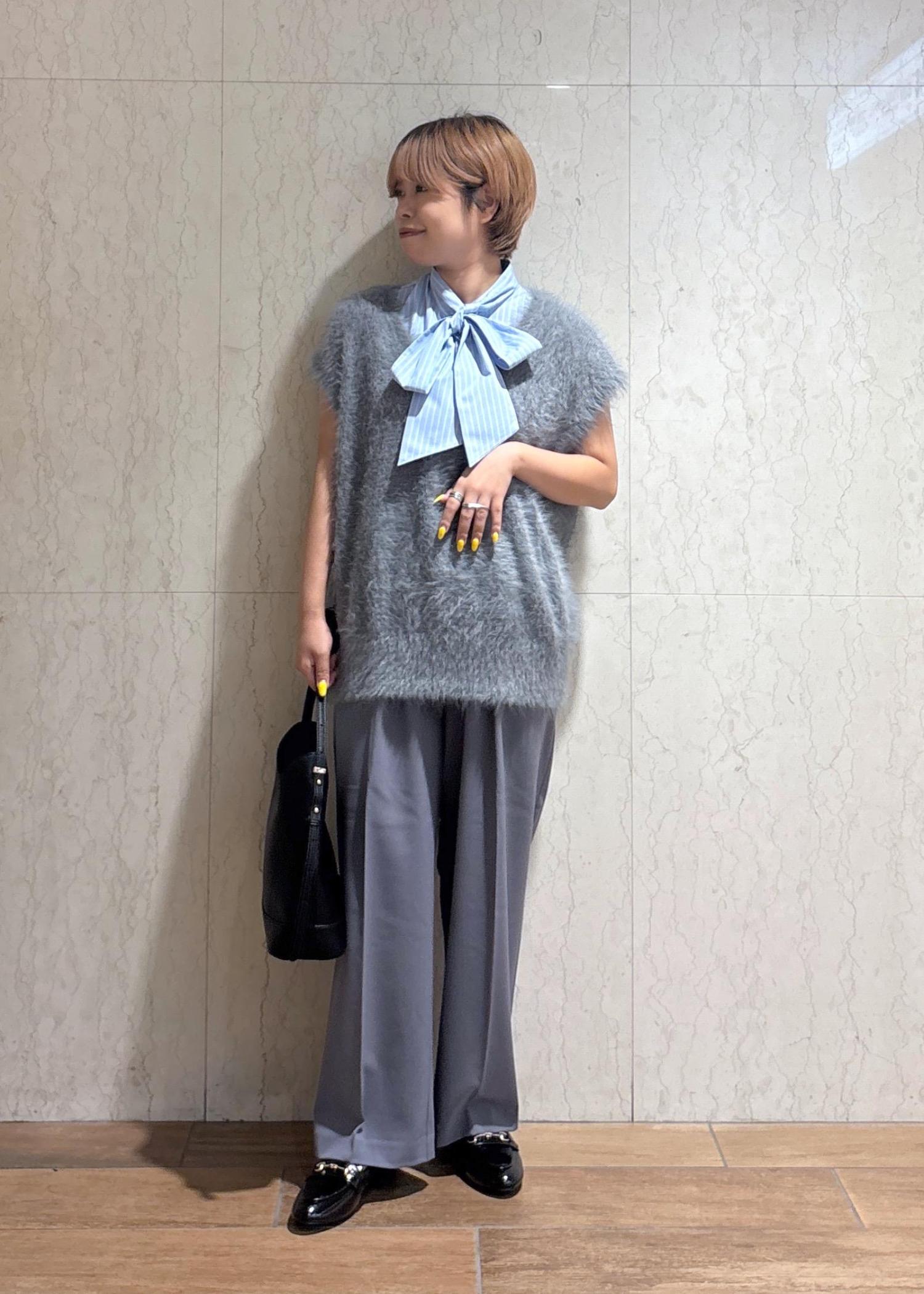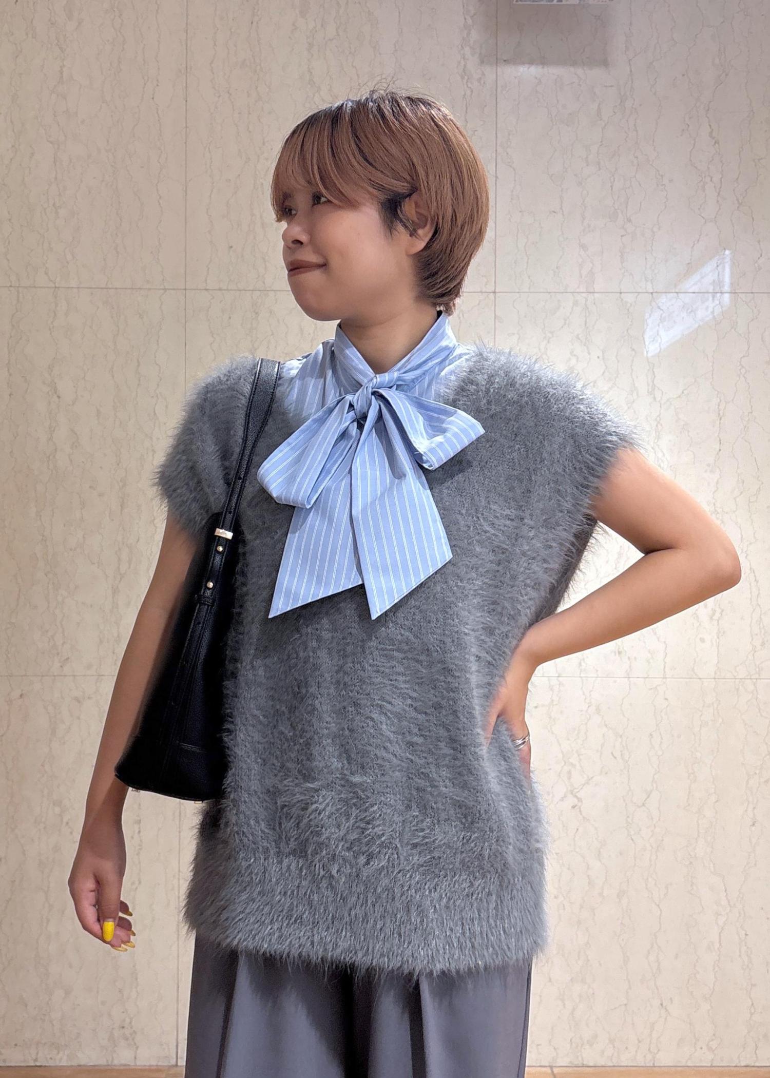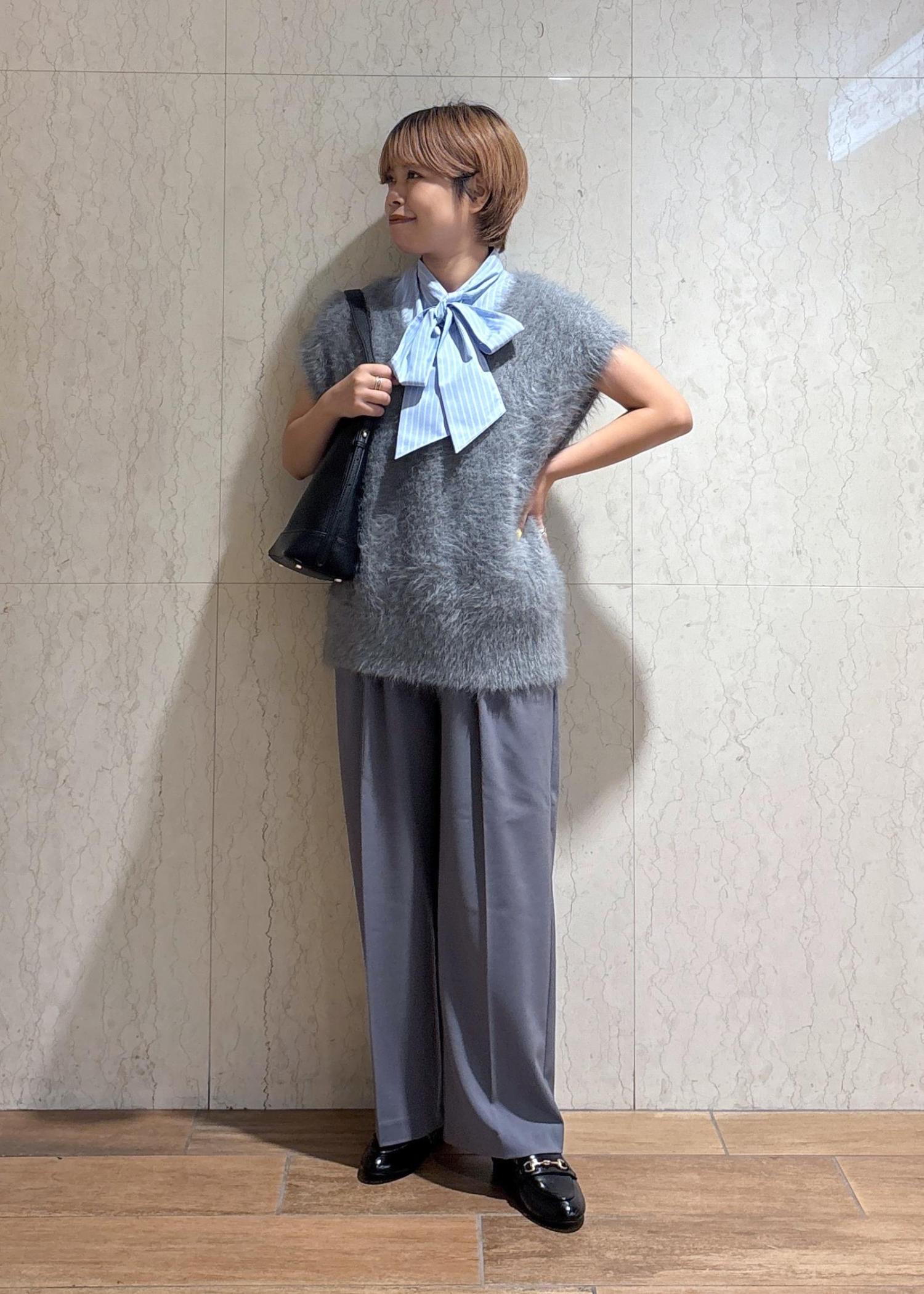 また、リボンのブラウスを着たことで、女性らしさをプラスしてみました。