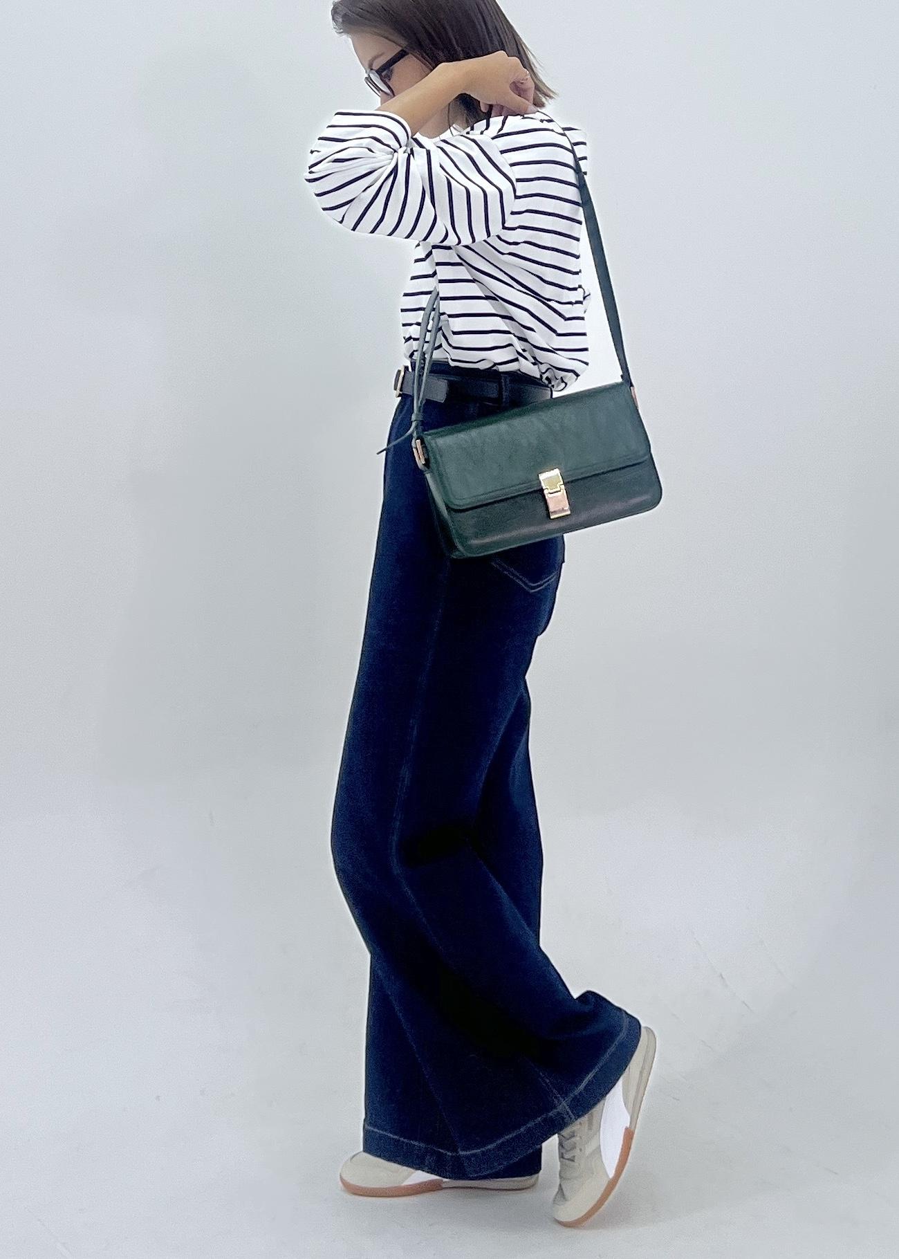 秋冬らしいこっくりしたグリーンのバッグを差し色にした、秋のシンプルカジュアルコーデです。