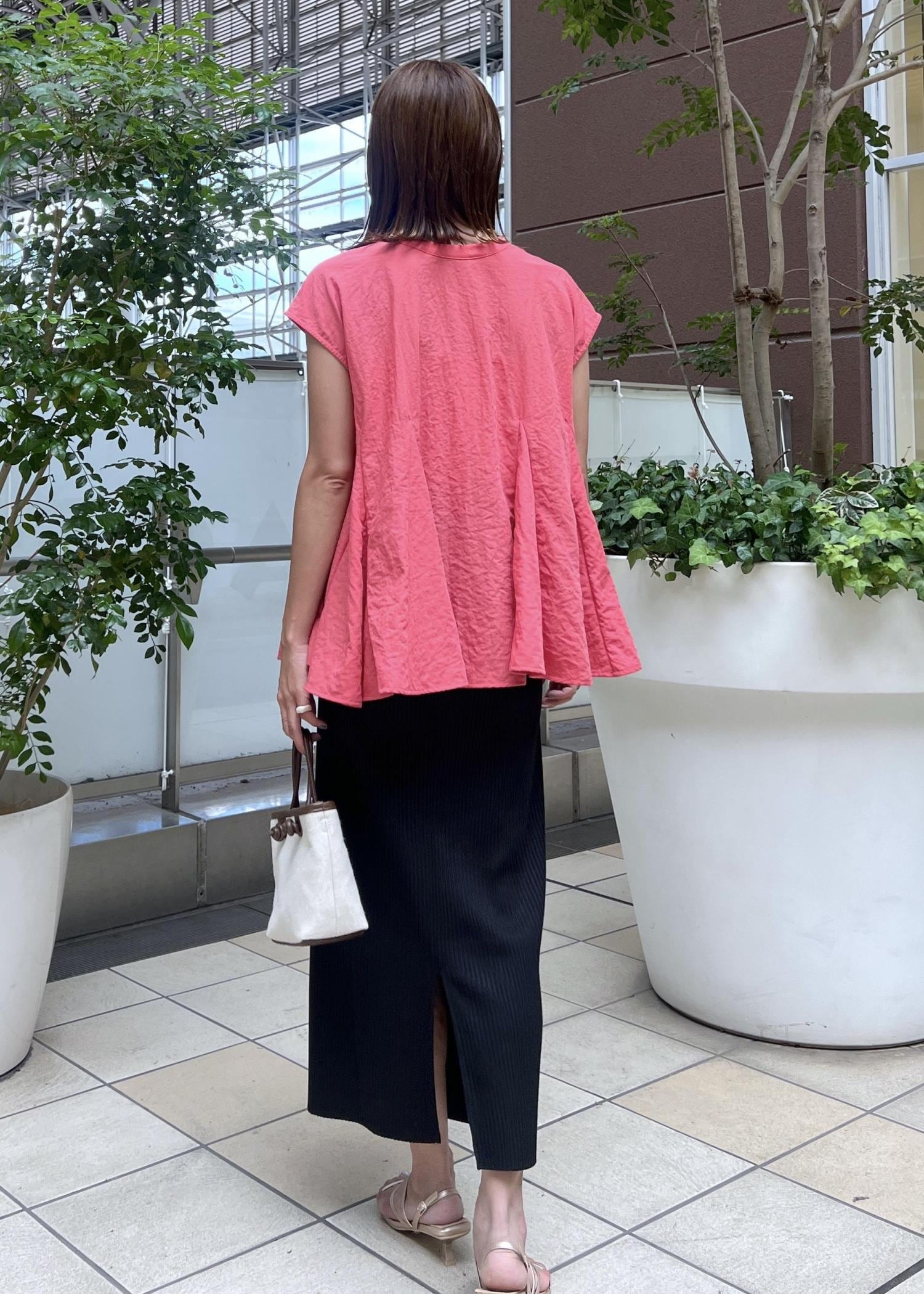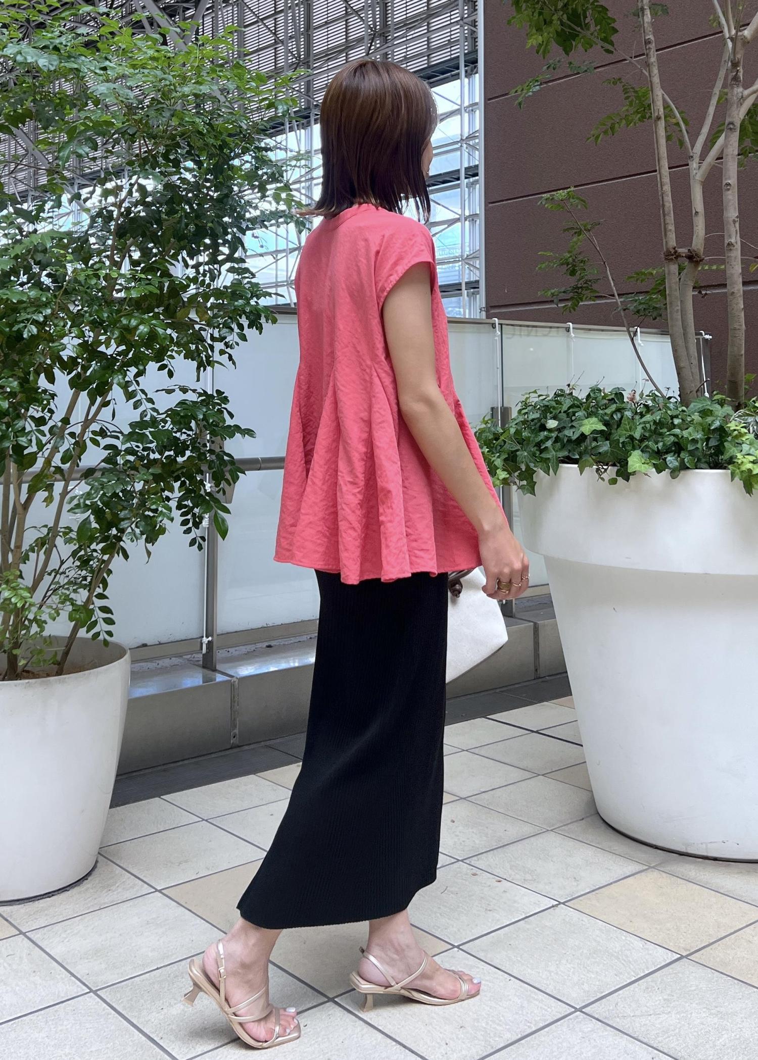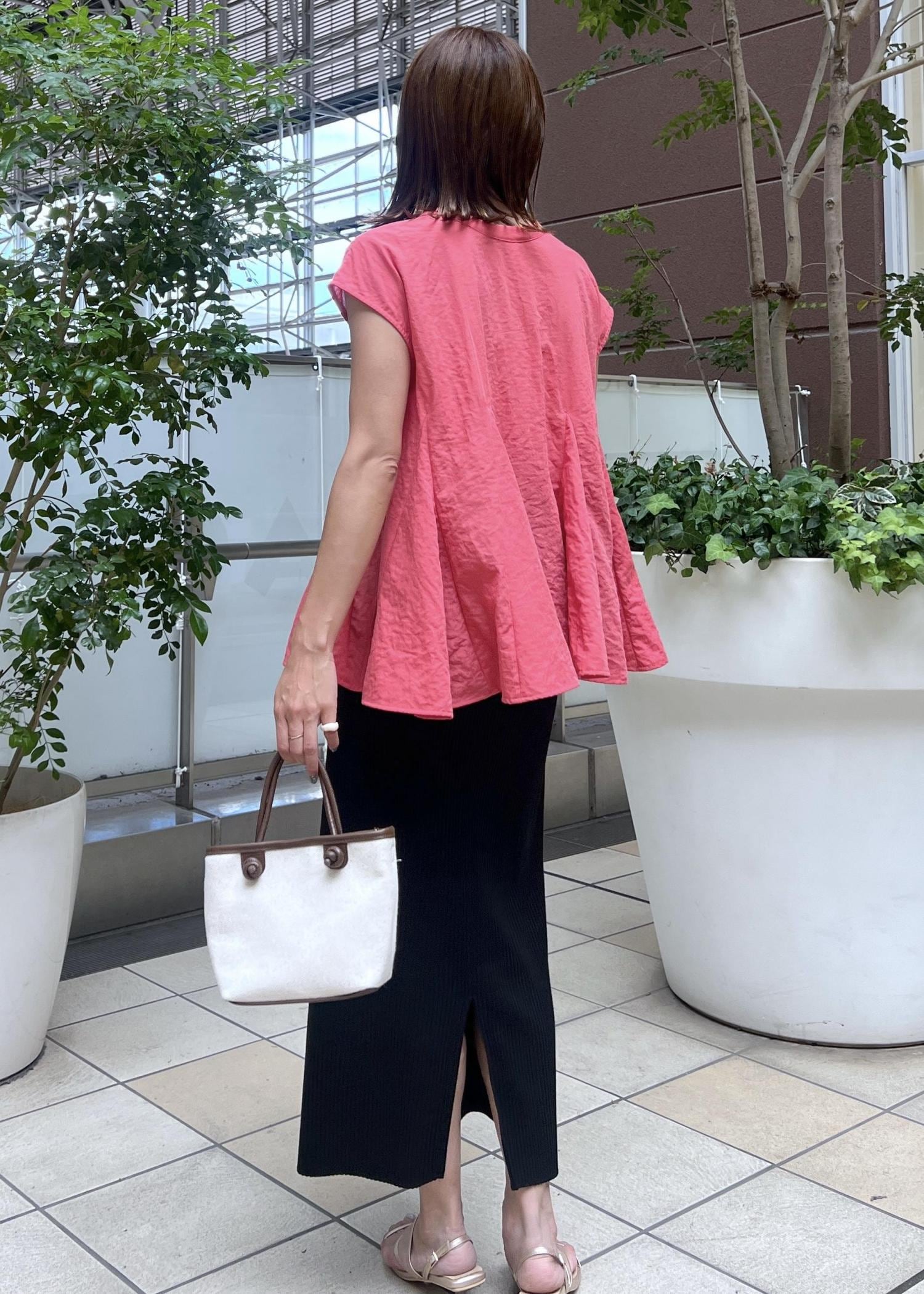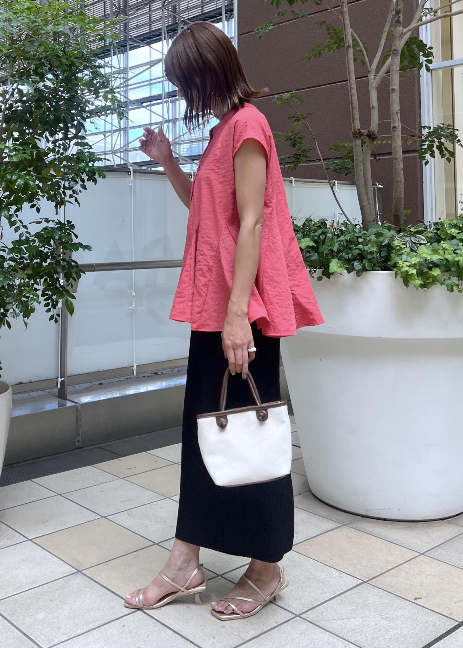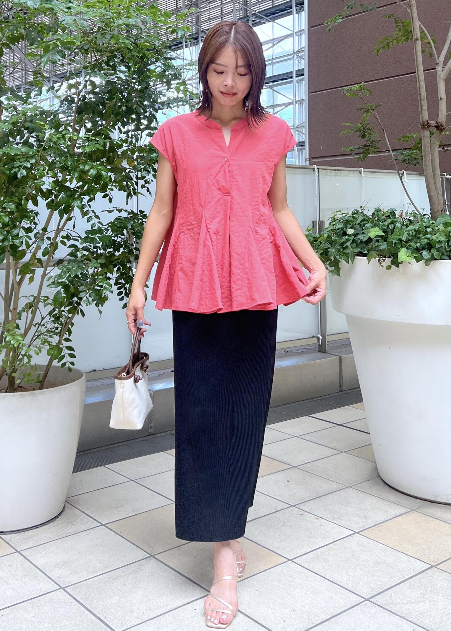 明るいレッド系のブラウスは、フレアシルエットが華やかでコーデの主役になってくれるアイテム。