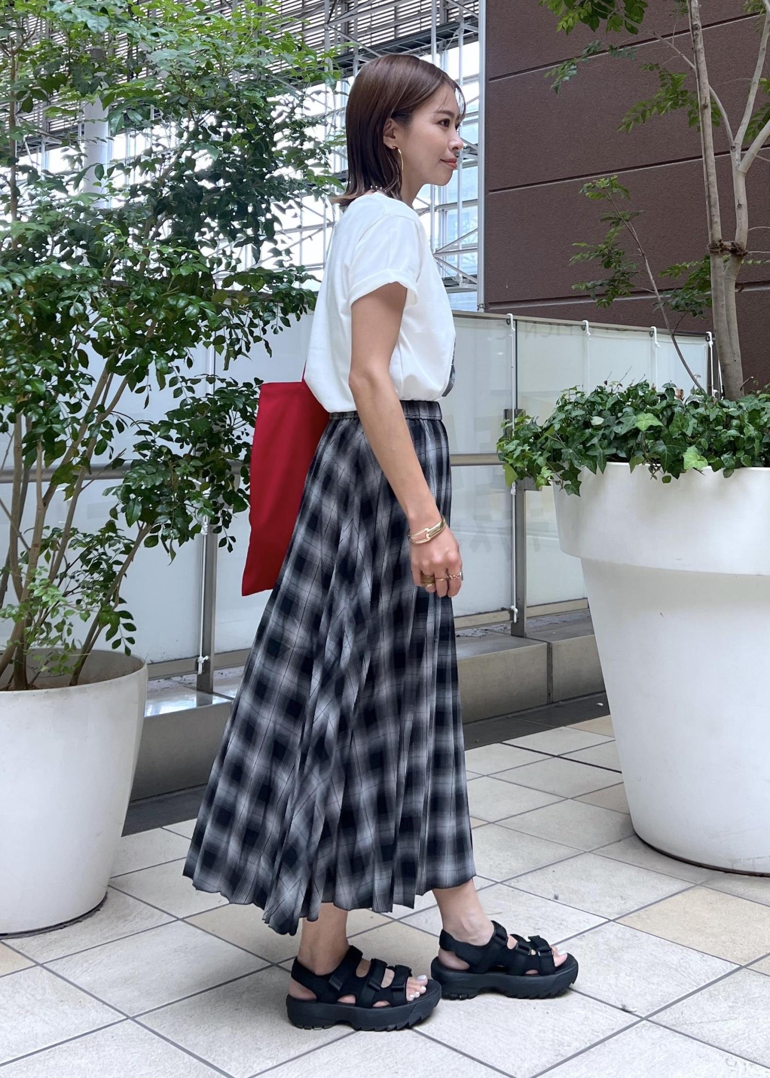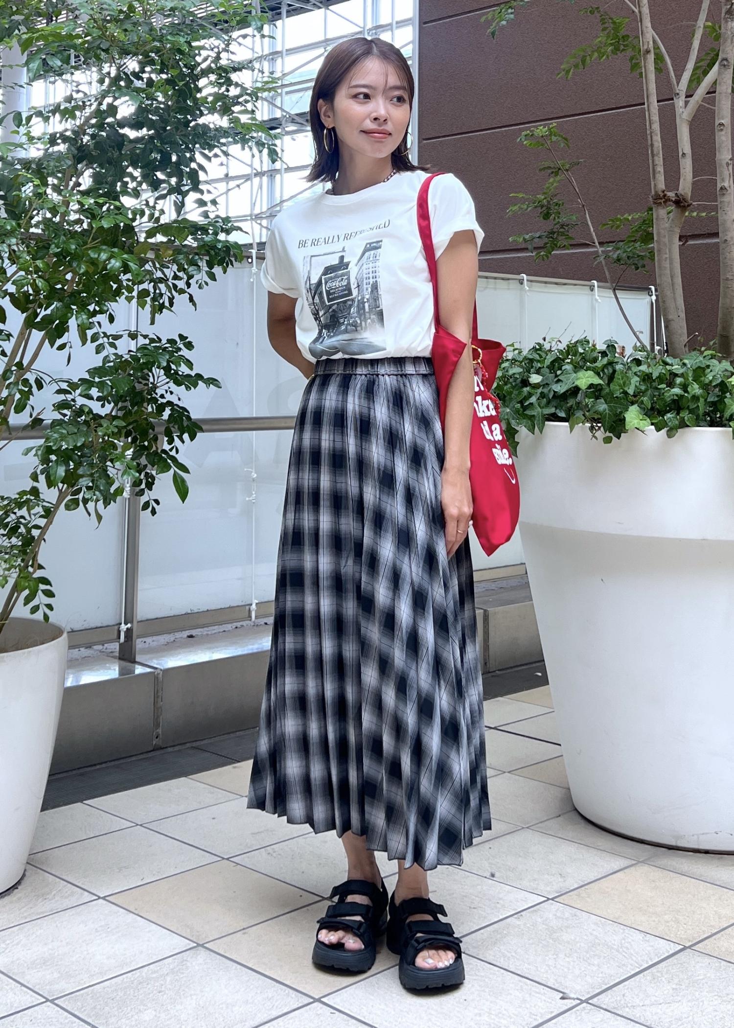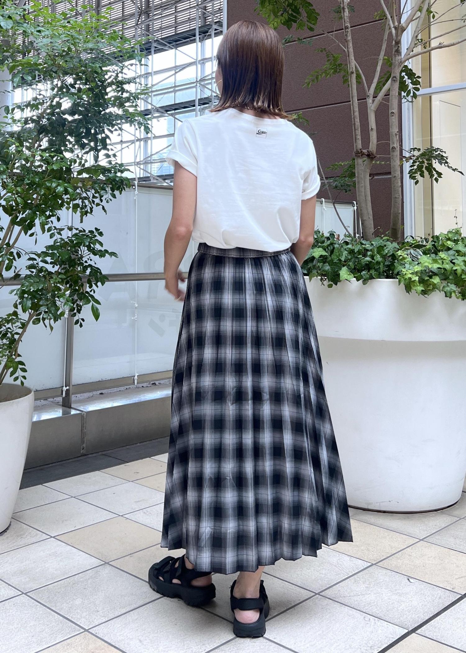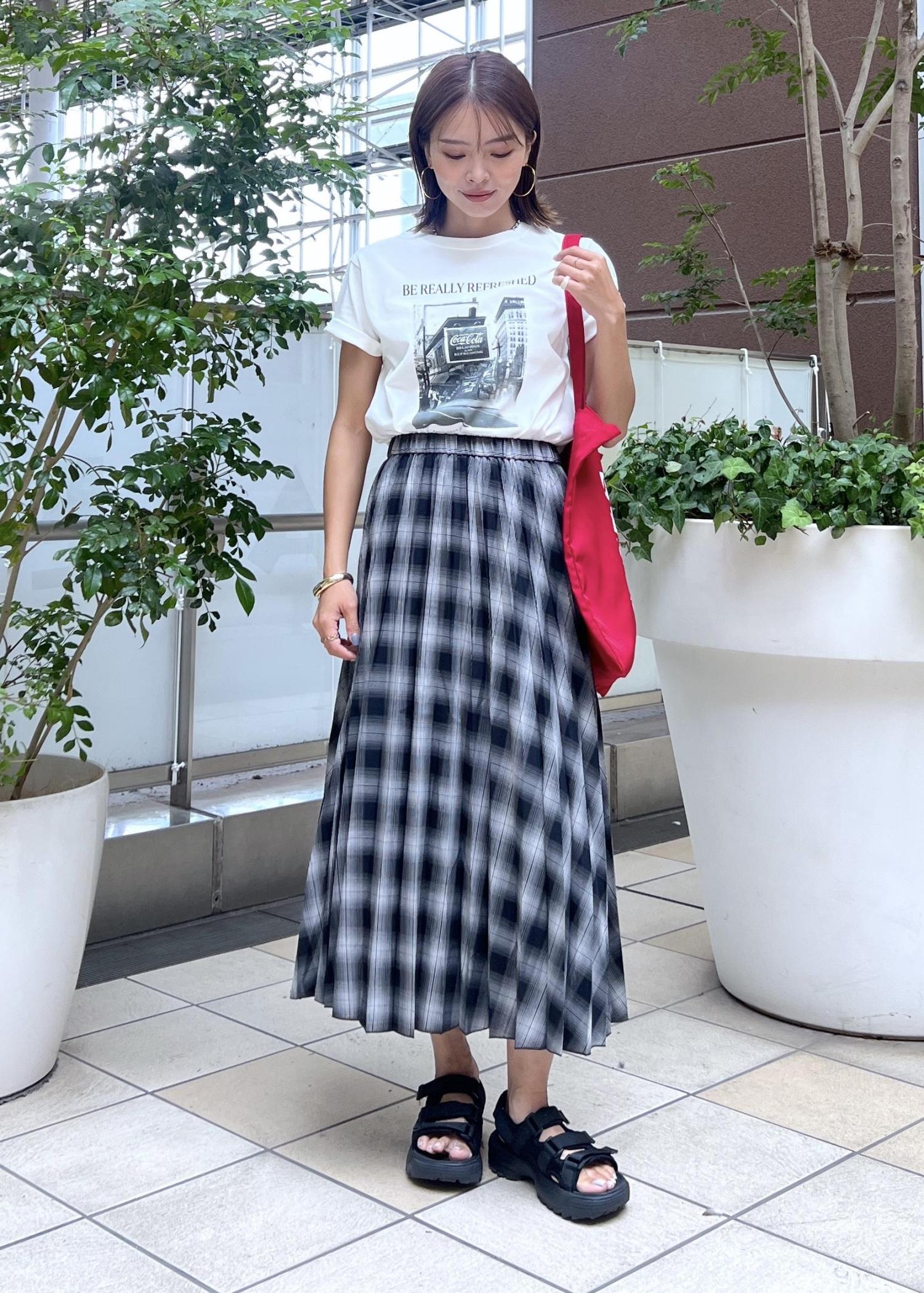 チェック柄のプリーツスカートでラフになりすぎないカジュアルスタイルにしました。