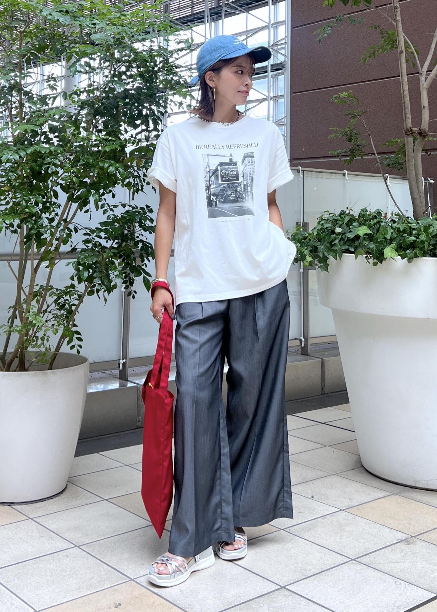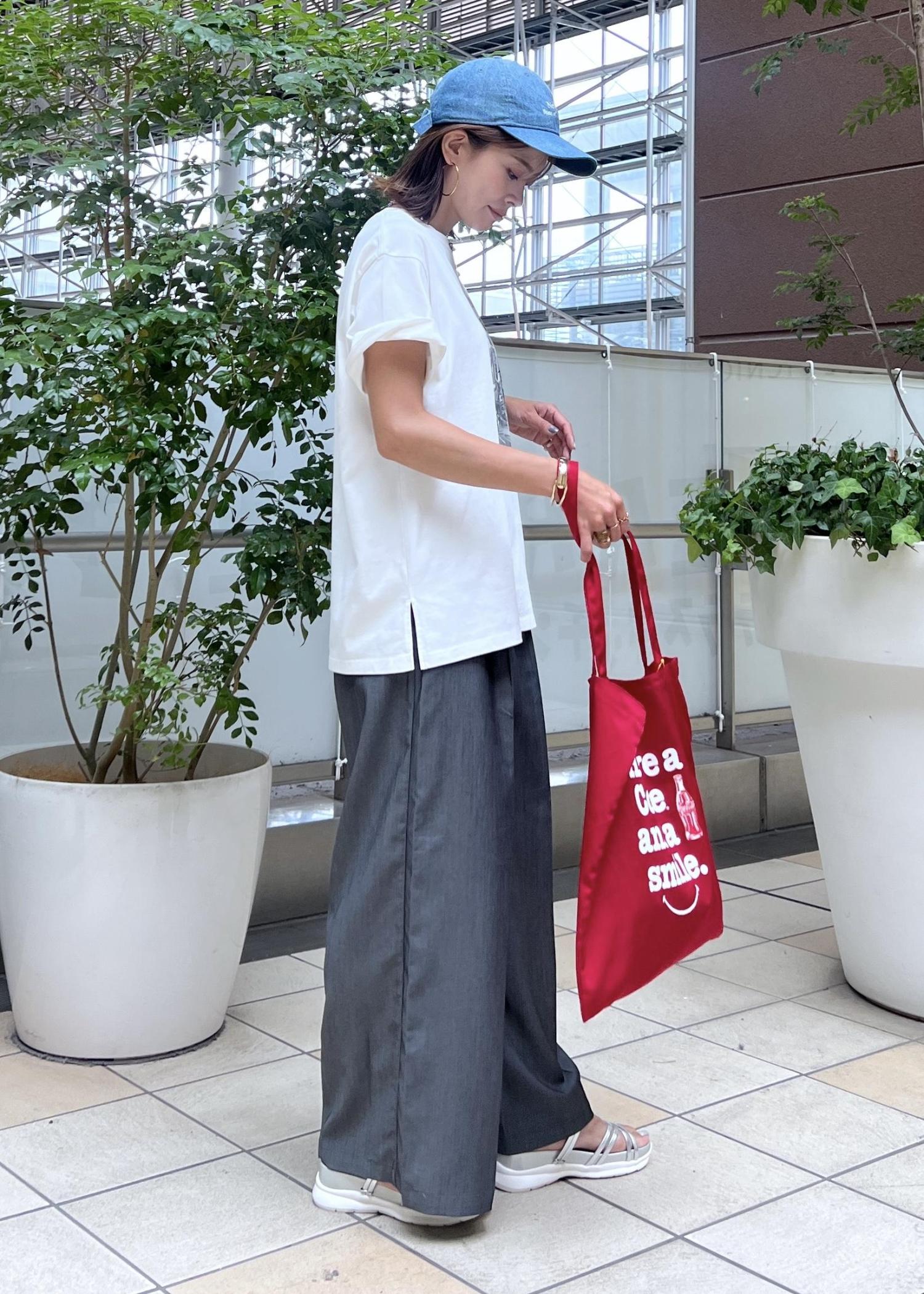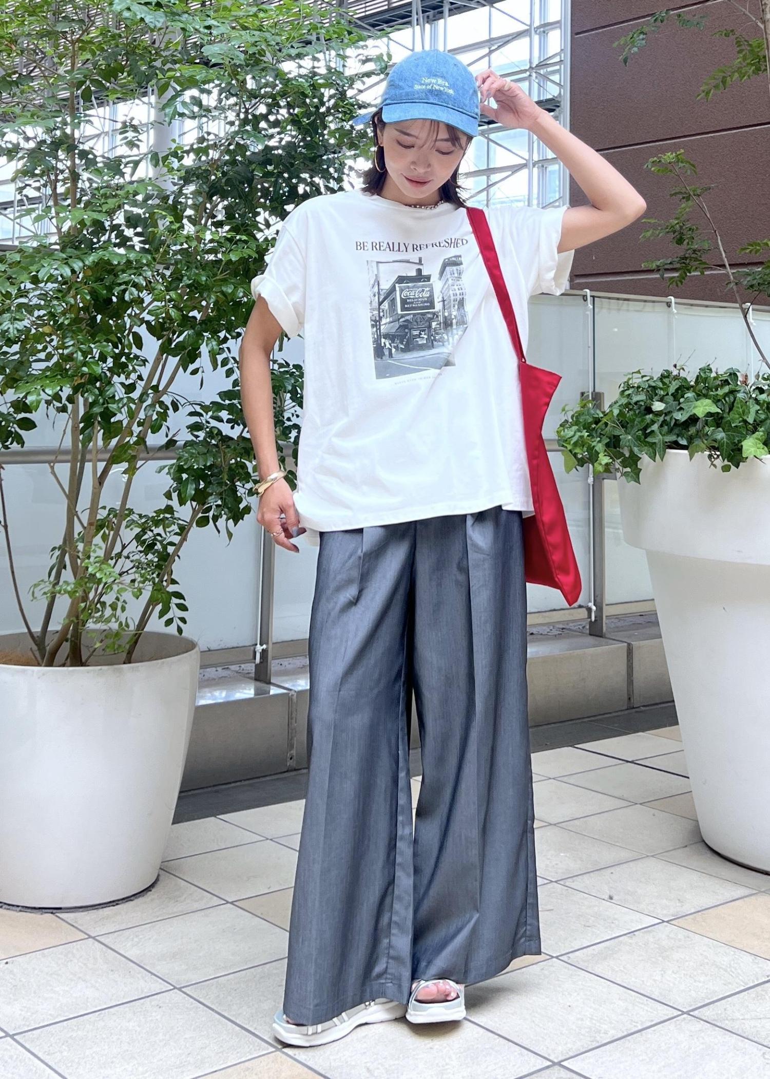 ゆったりシルエットのTシャツはあえてボトムもゆったりさせて、ラフさのあるカジュアルコーデです。
