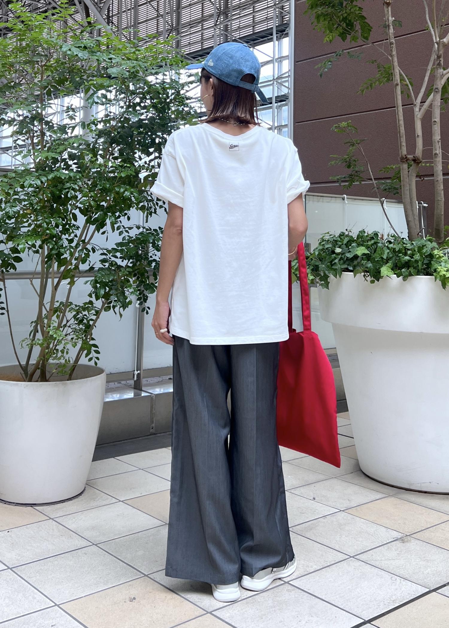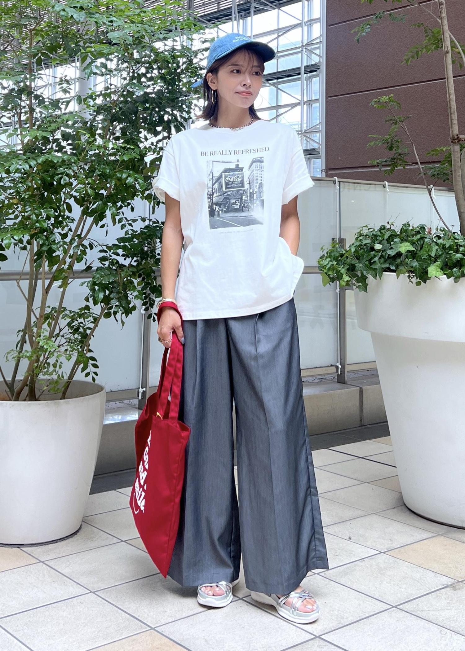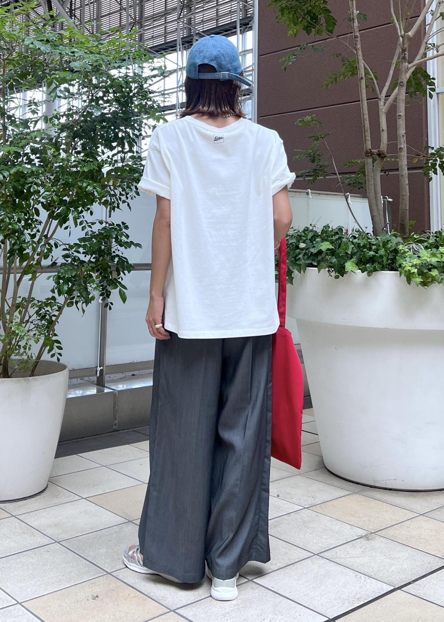 ゆったりシルエットのTシャツはあえてボトムもゆったりさせて、ラフさのあるカジュアルコーデです。
