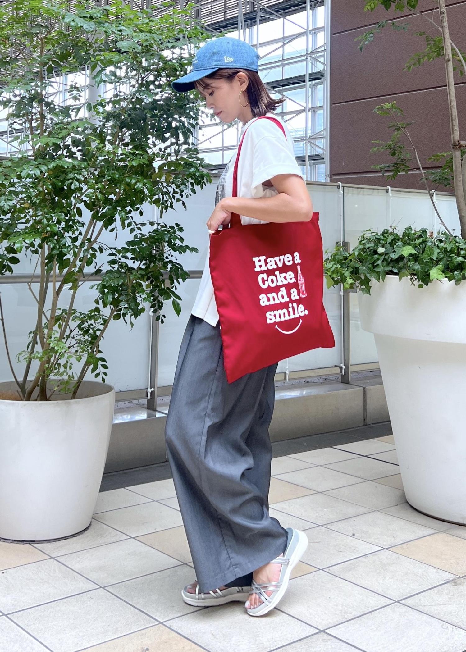 モノトーンで大人なコーデですが、差し色に赤のトートバッグとデニムキャップでラフなスタイリングにしました。