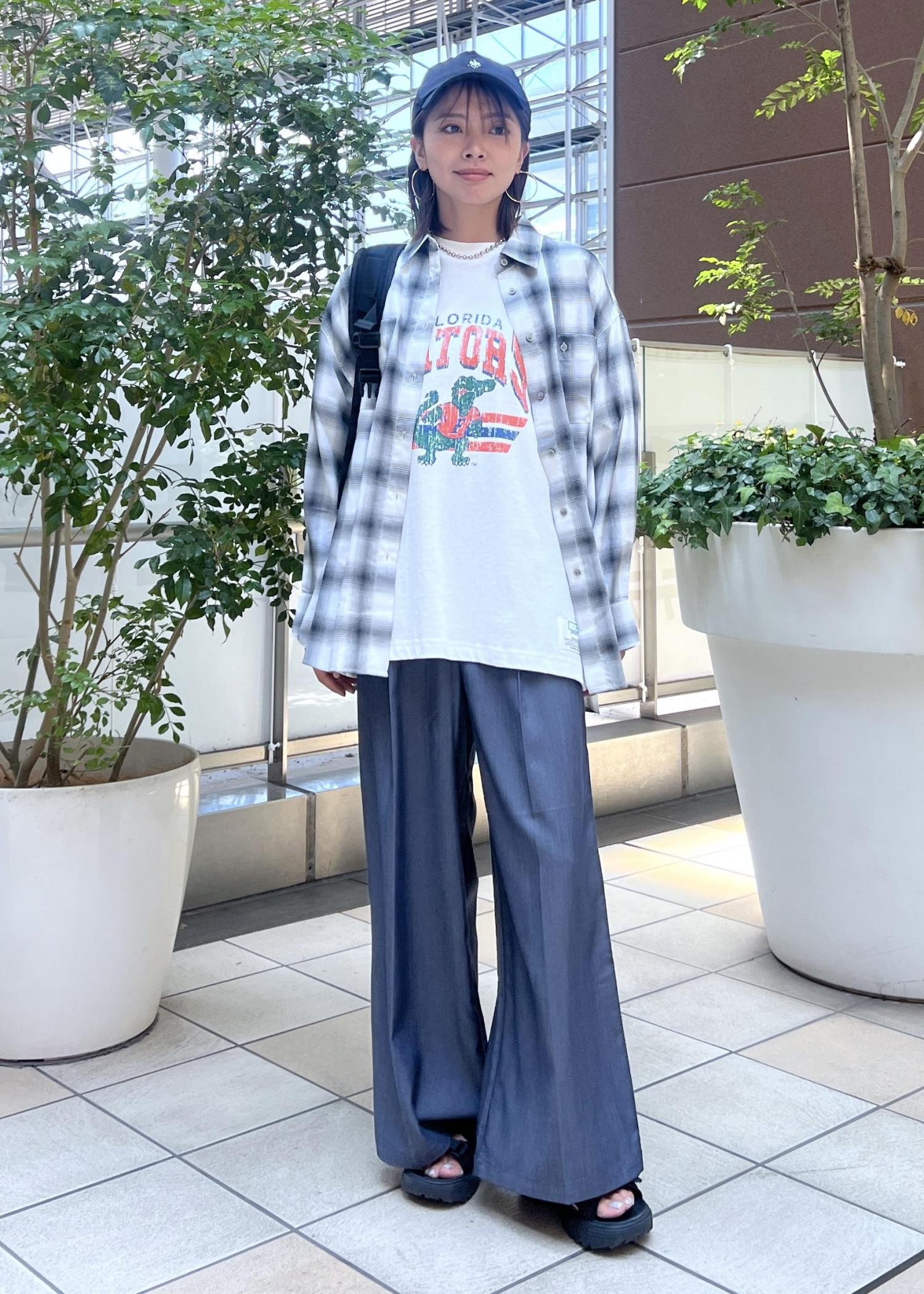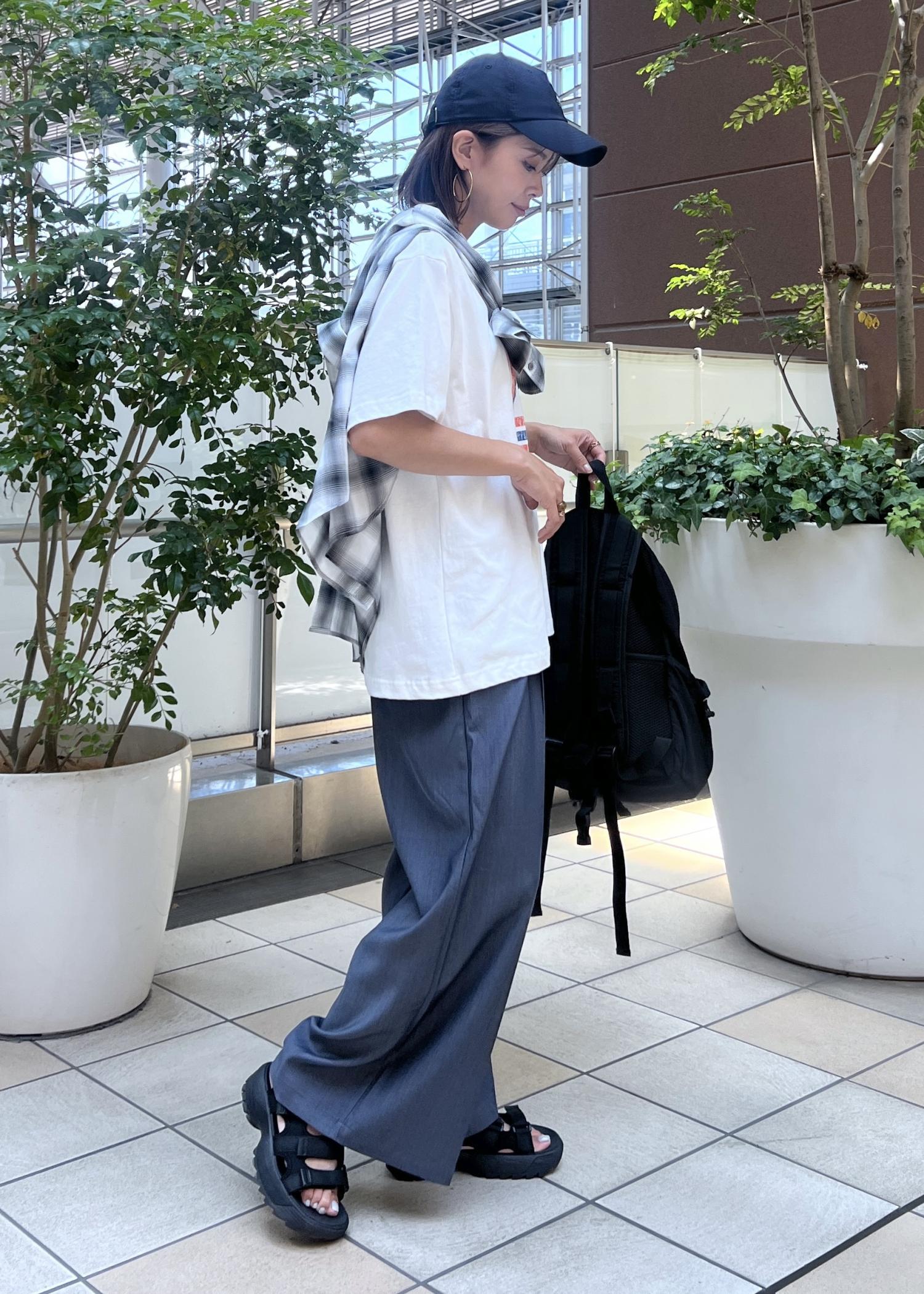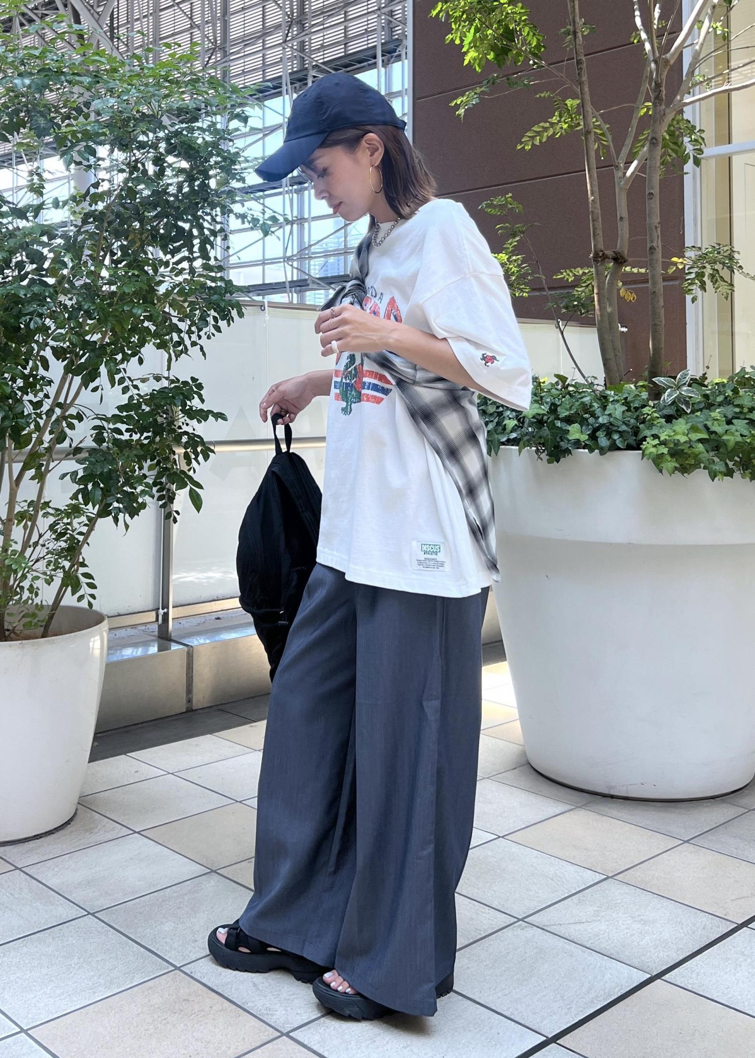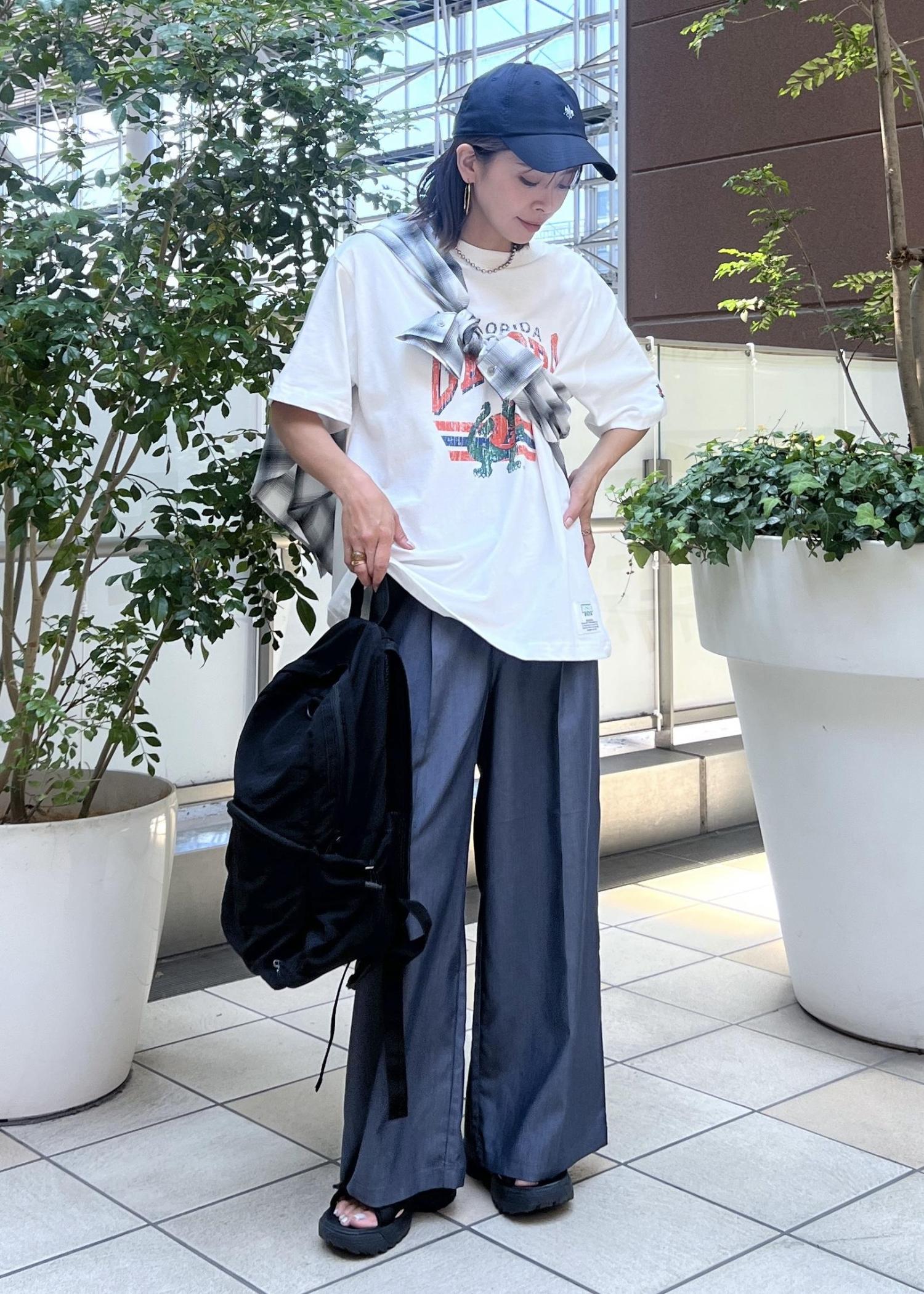 ゆったり着心地楽ちんなオーバーサイズのTシャツは、あえてワイドパンツを合わせてメンズライクな着こなしに。