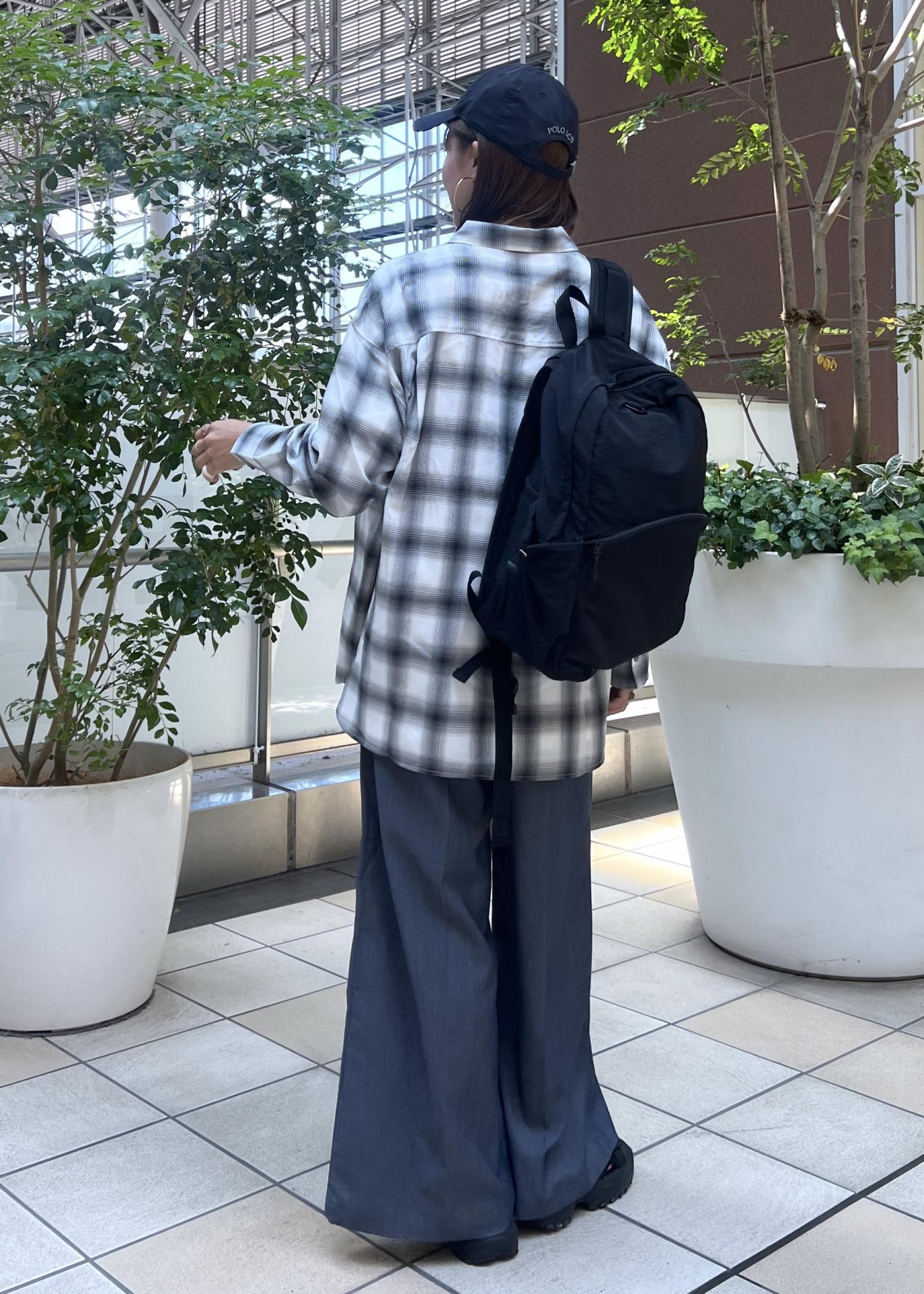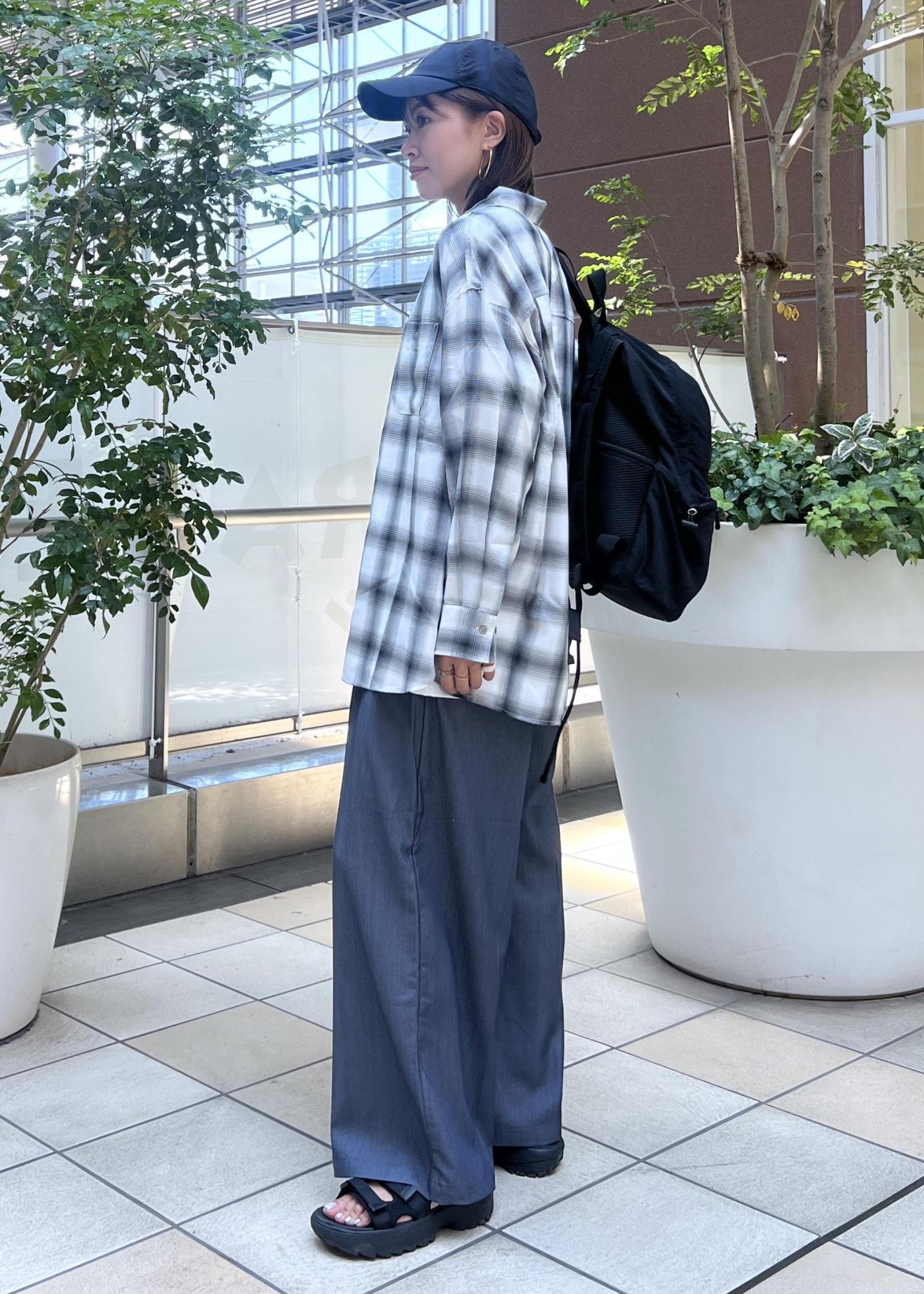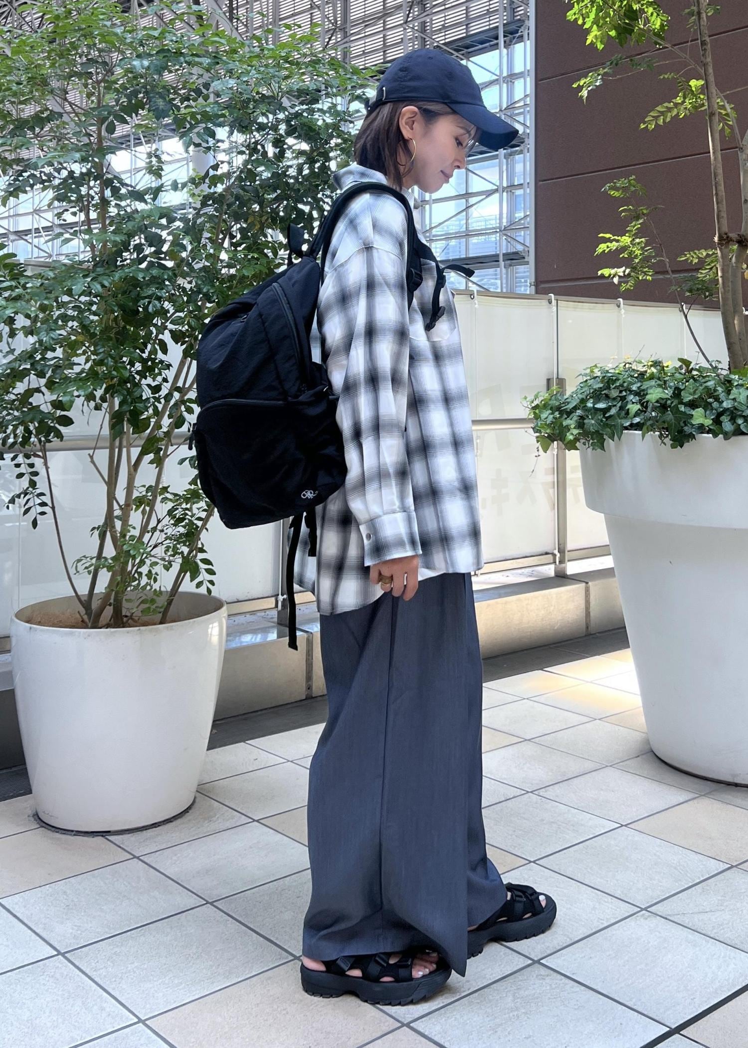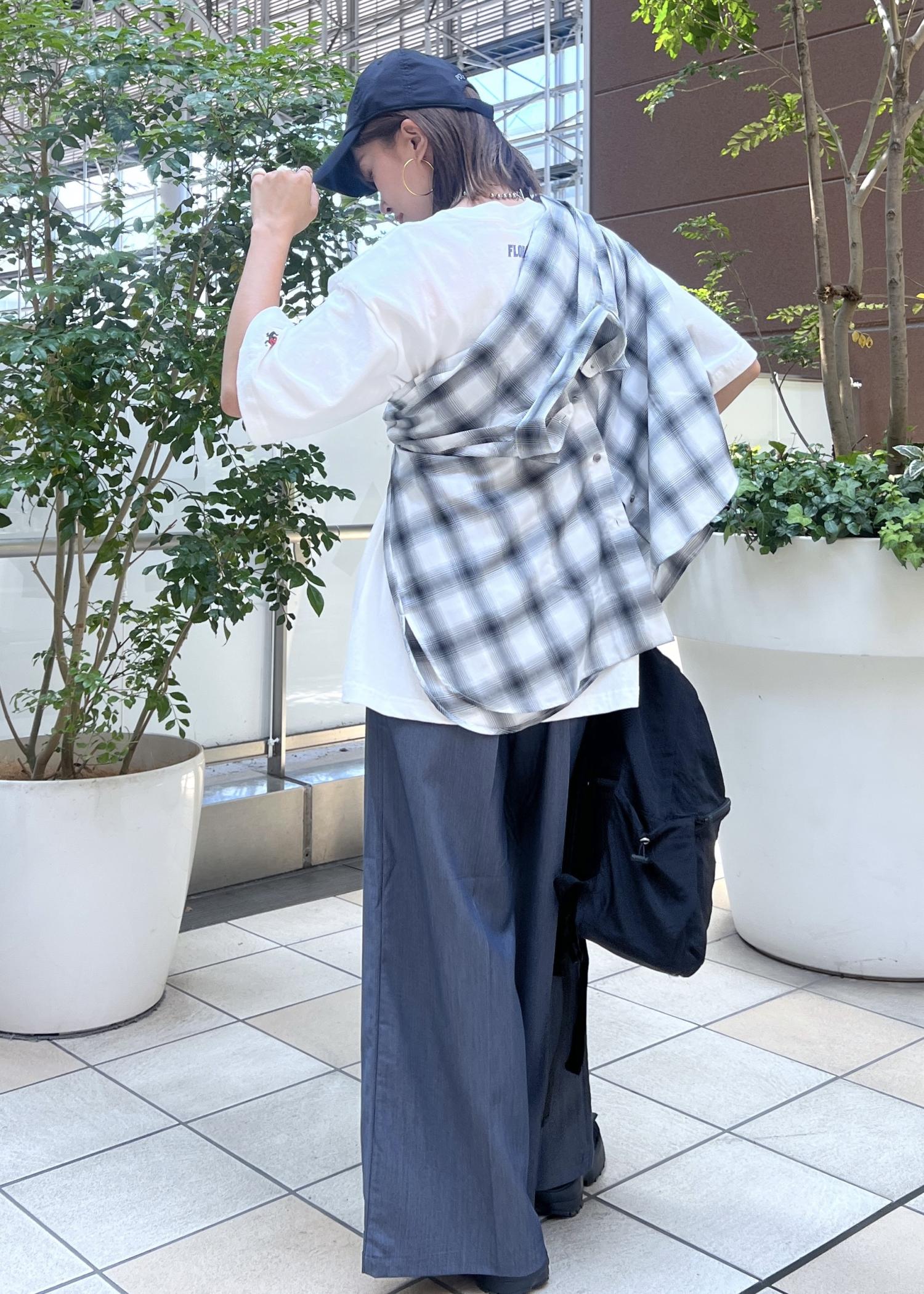 羽織にも使いやすいチェックシャツは、暑い日には肩にかけてコーデのワンポイントに◎。