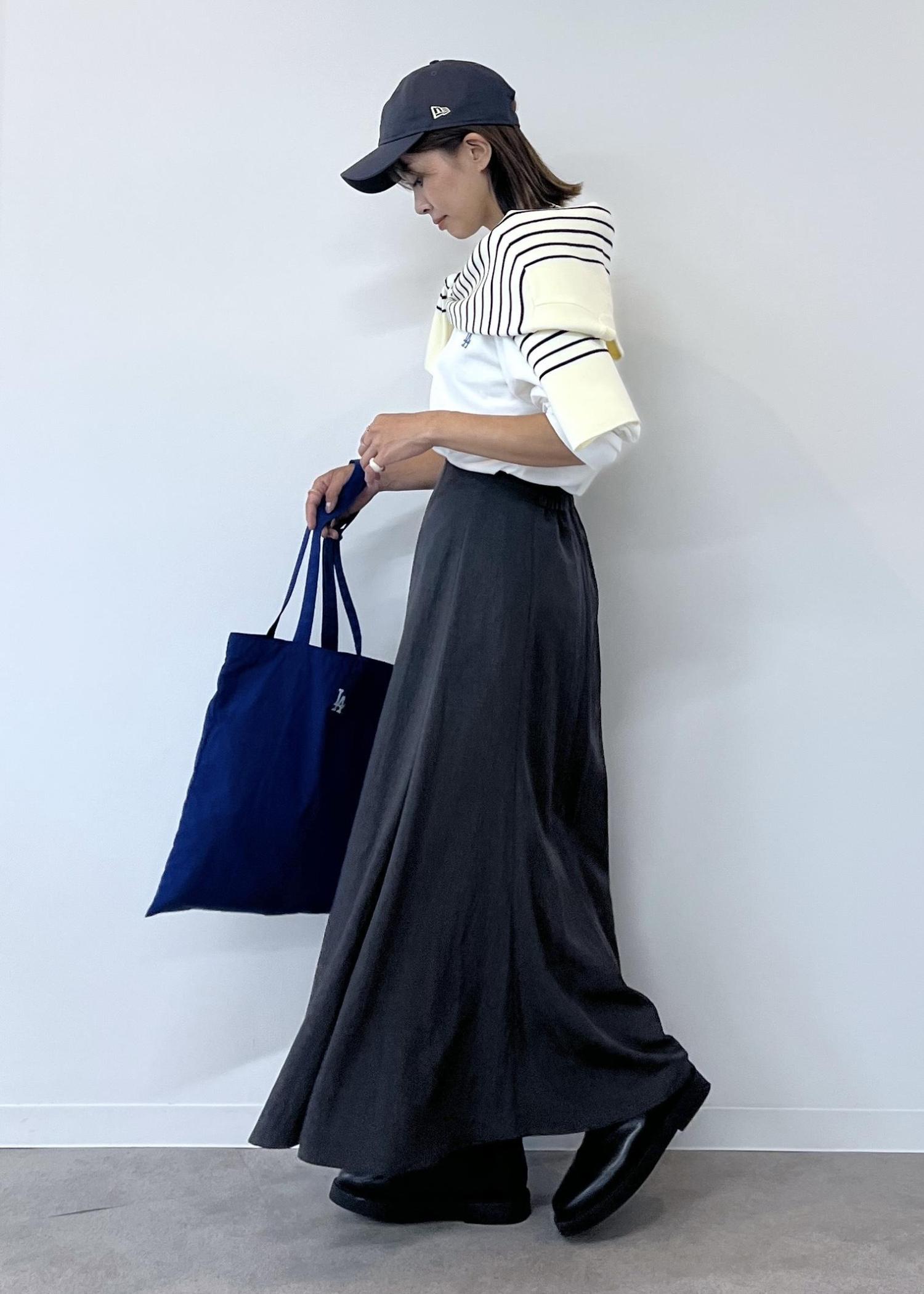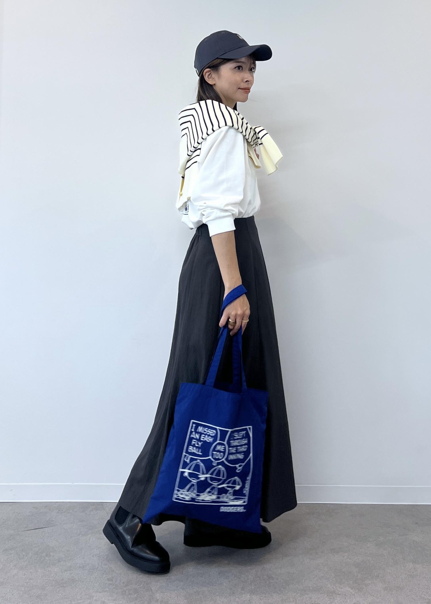 トートバッグとキャップもチームを合わせて、統一感のある大人カジュアルコーデです。