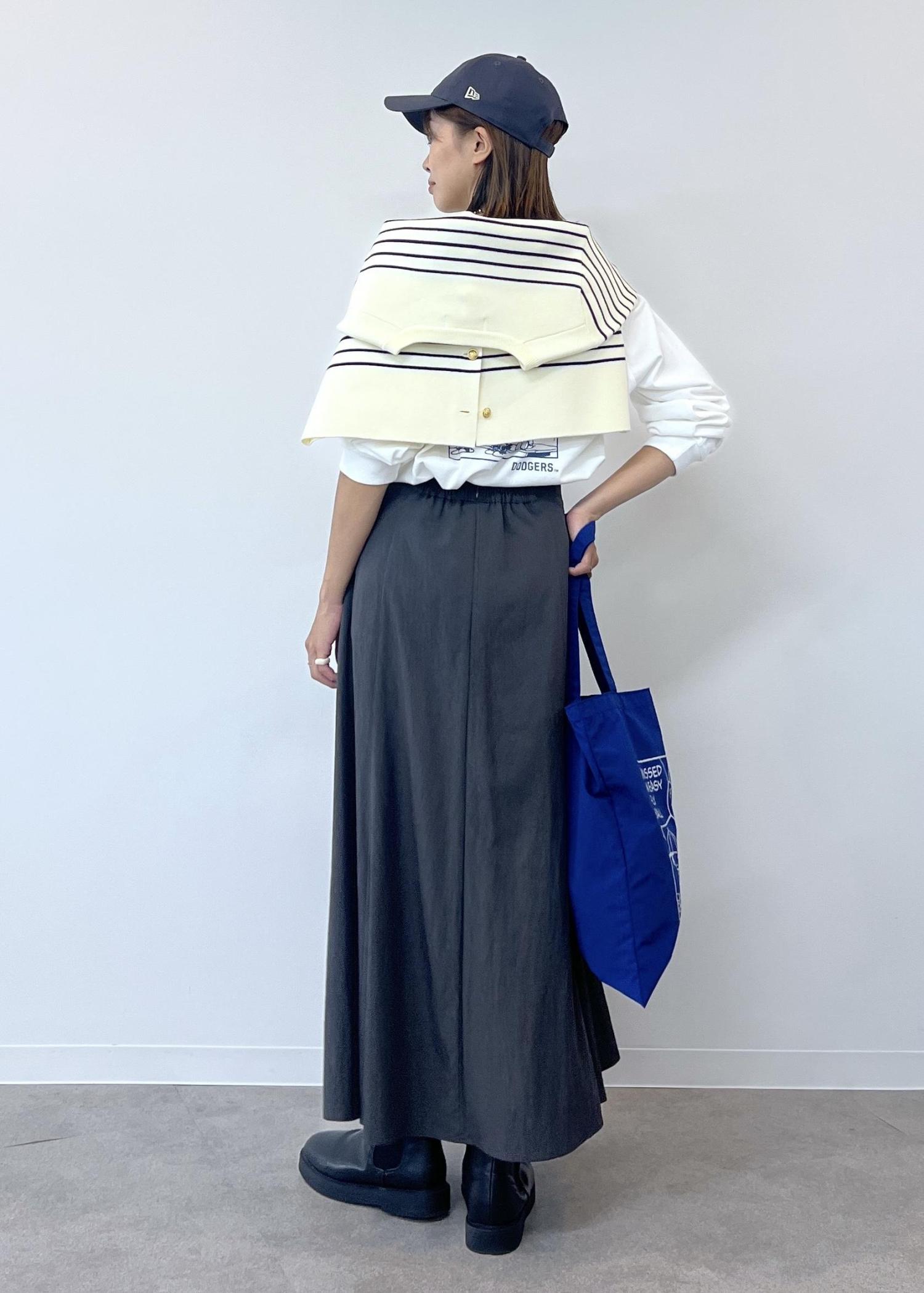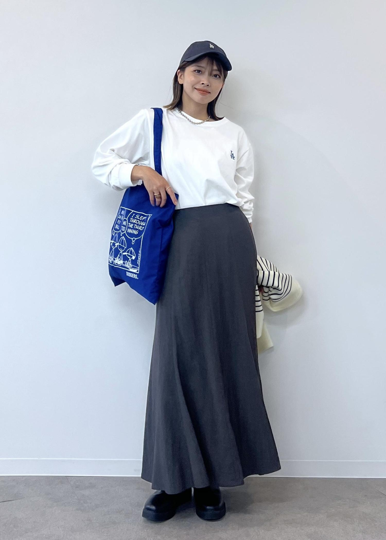 カジュアルになりすぎないようにマーメイドラインのスカートで、女性らしさのあるスタイリングにしました。