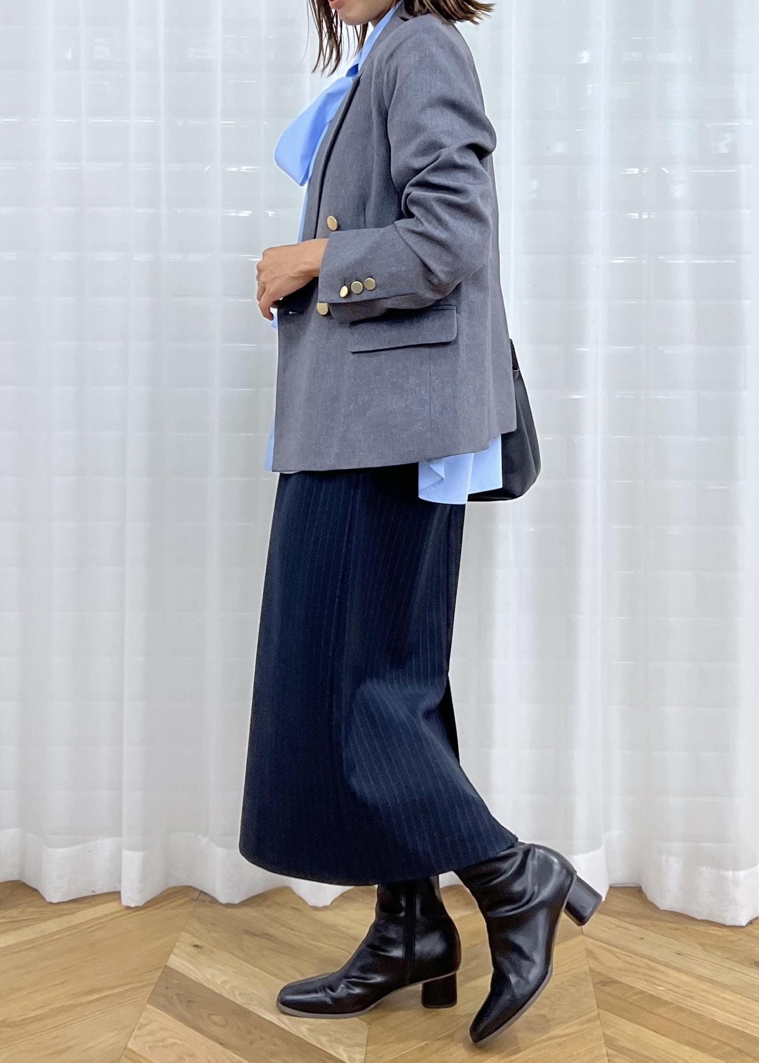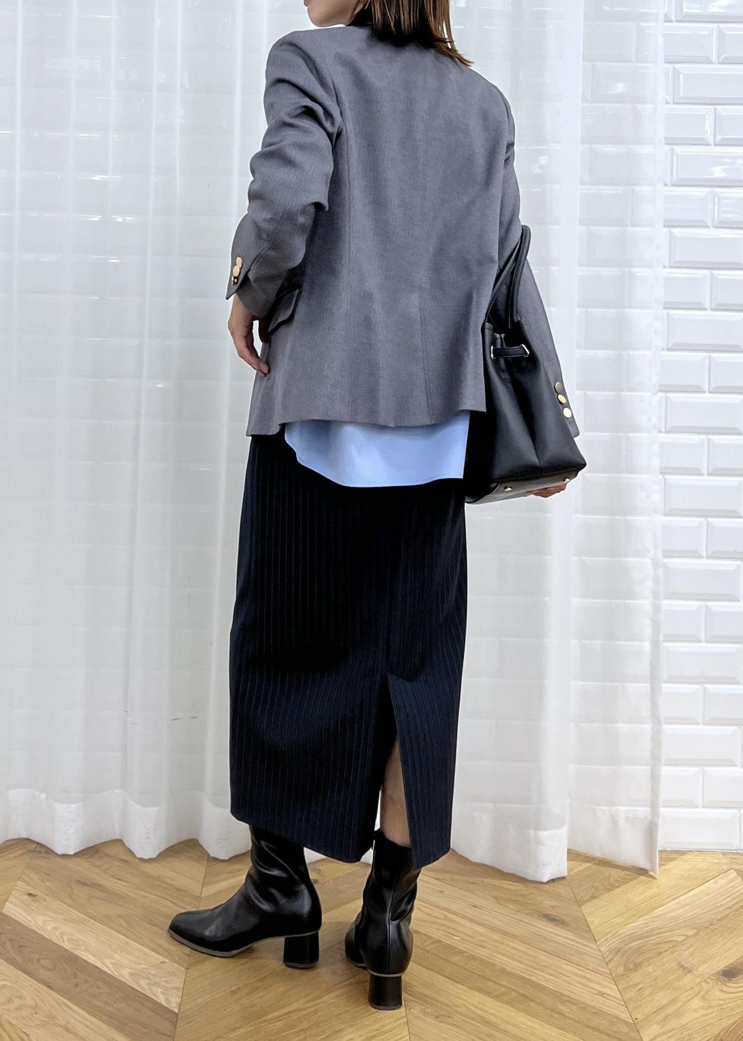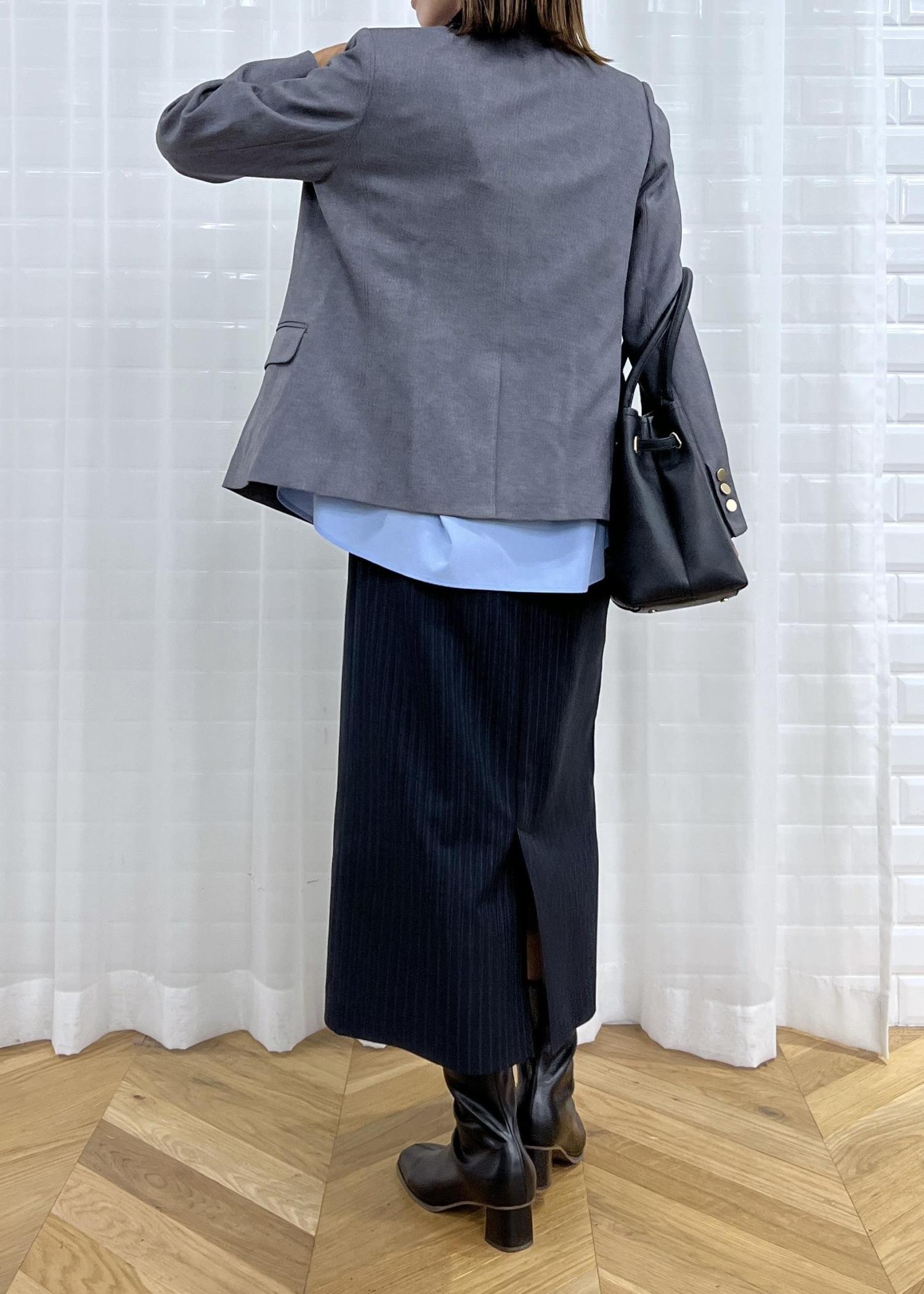 シックな雰囲気にマッチするグレーのジャケットは、アイラインスカートできれいめカジュアルにも。