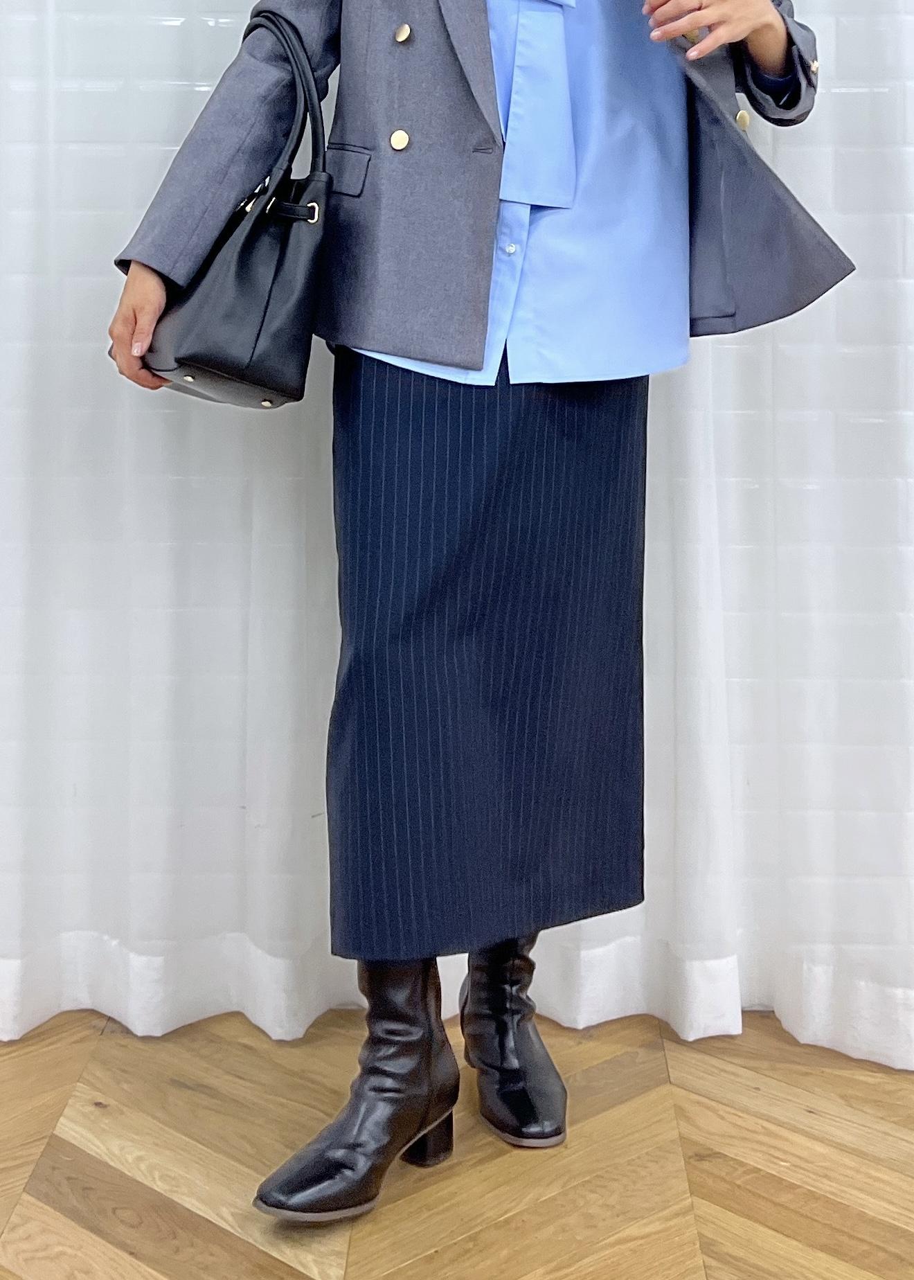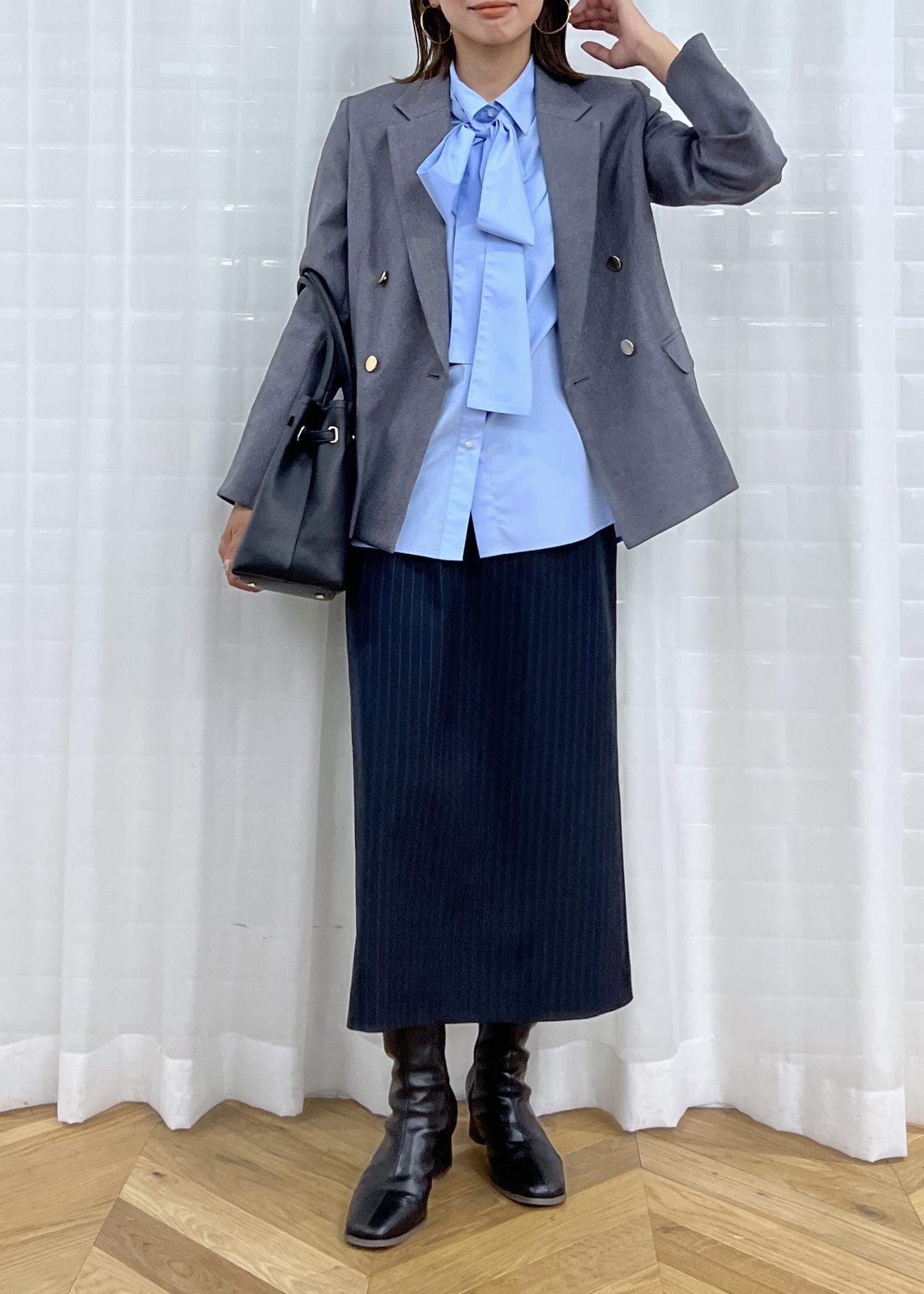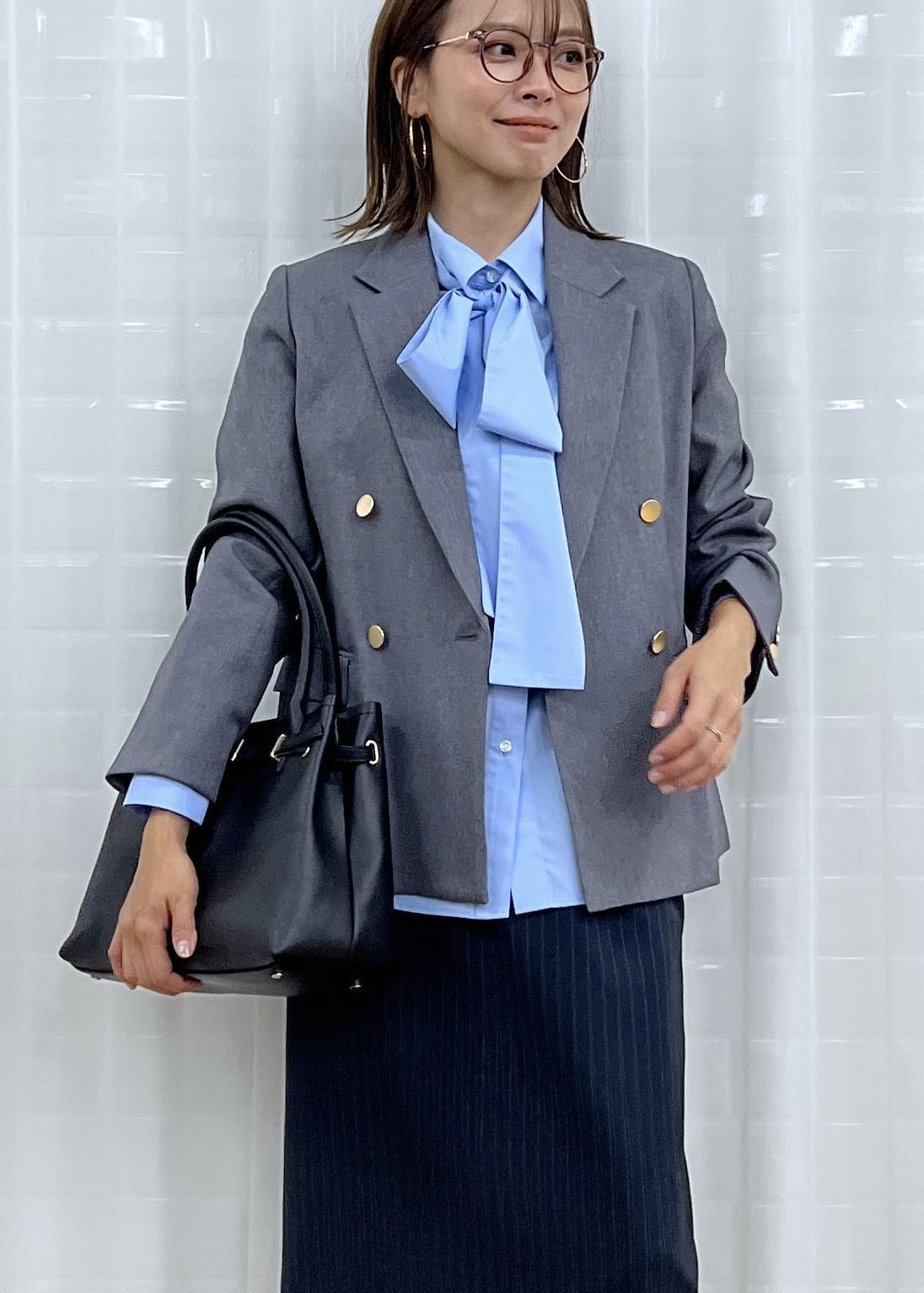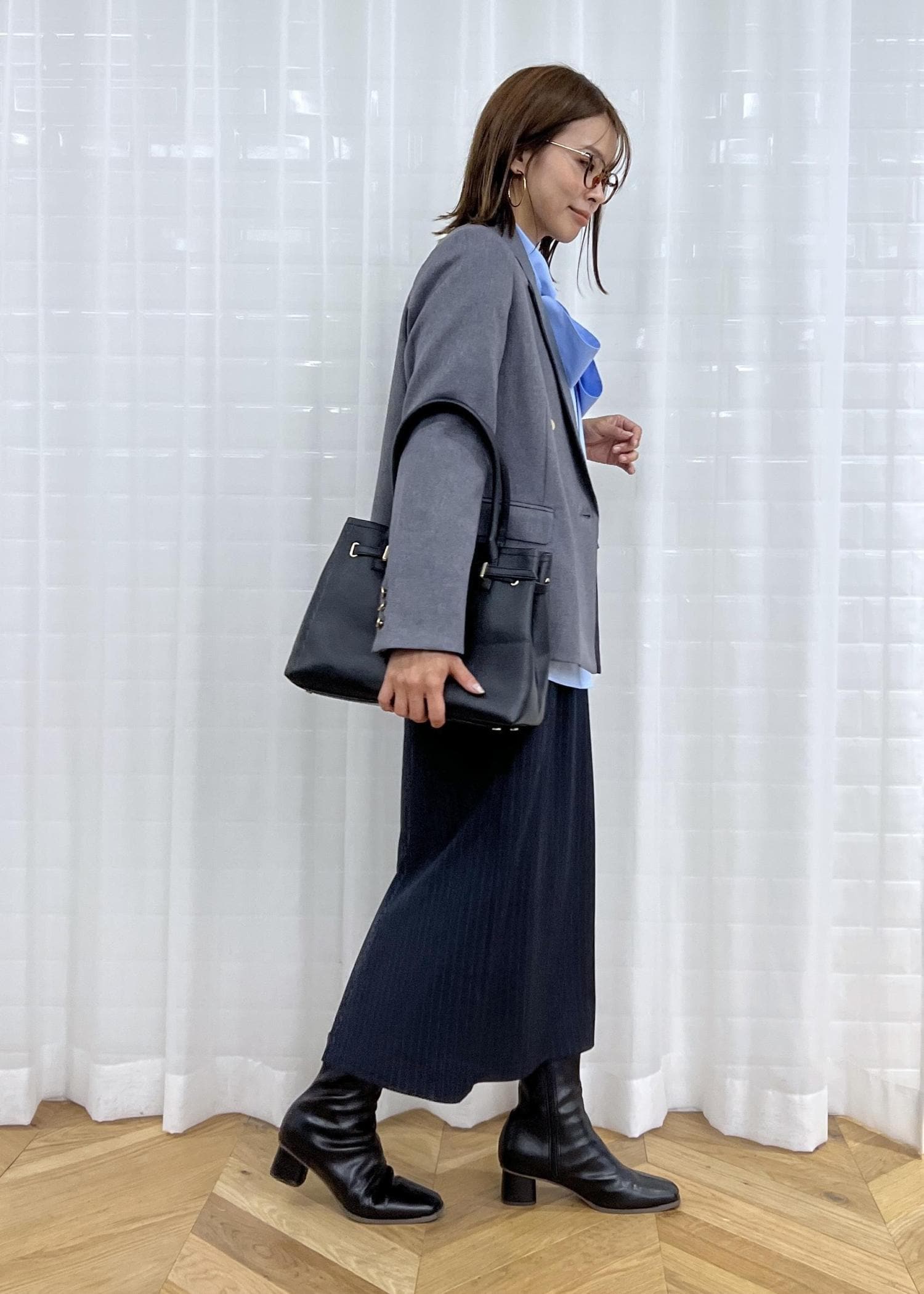 シックな雰囲気にマッチするグレーのジャケットは、アイラインスカートできれいめカジュアルにも。