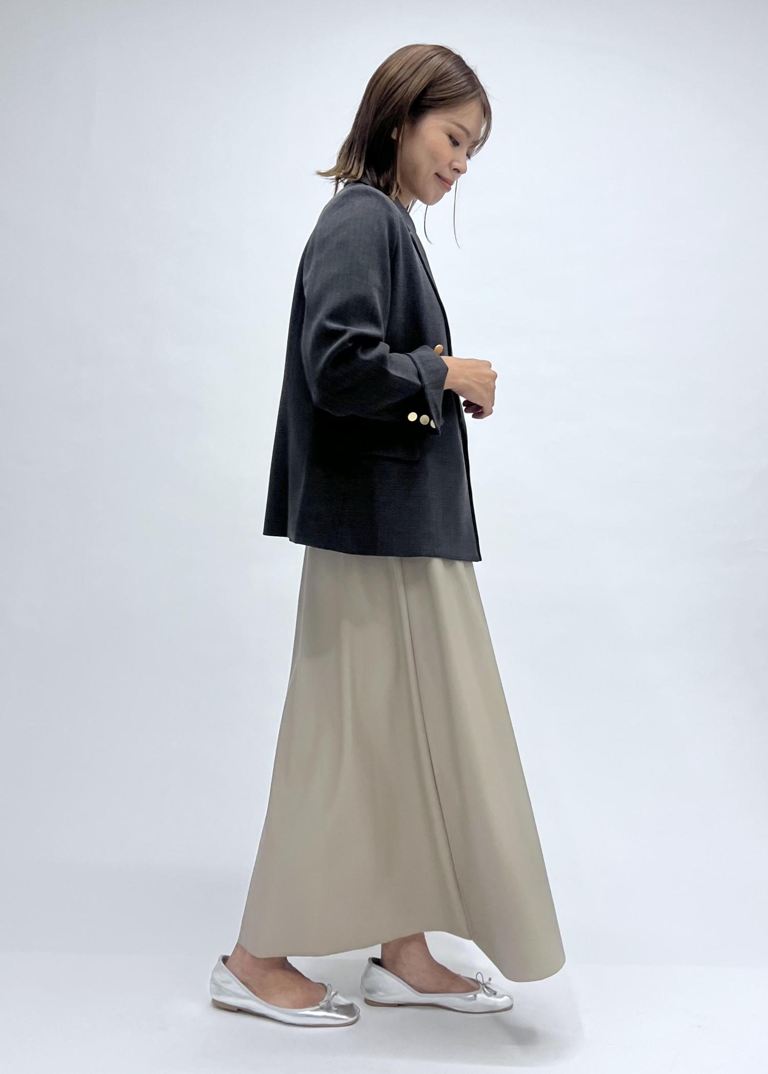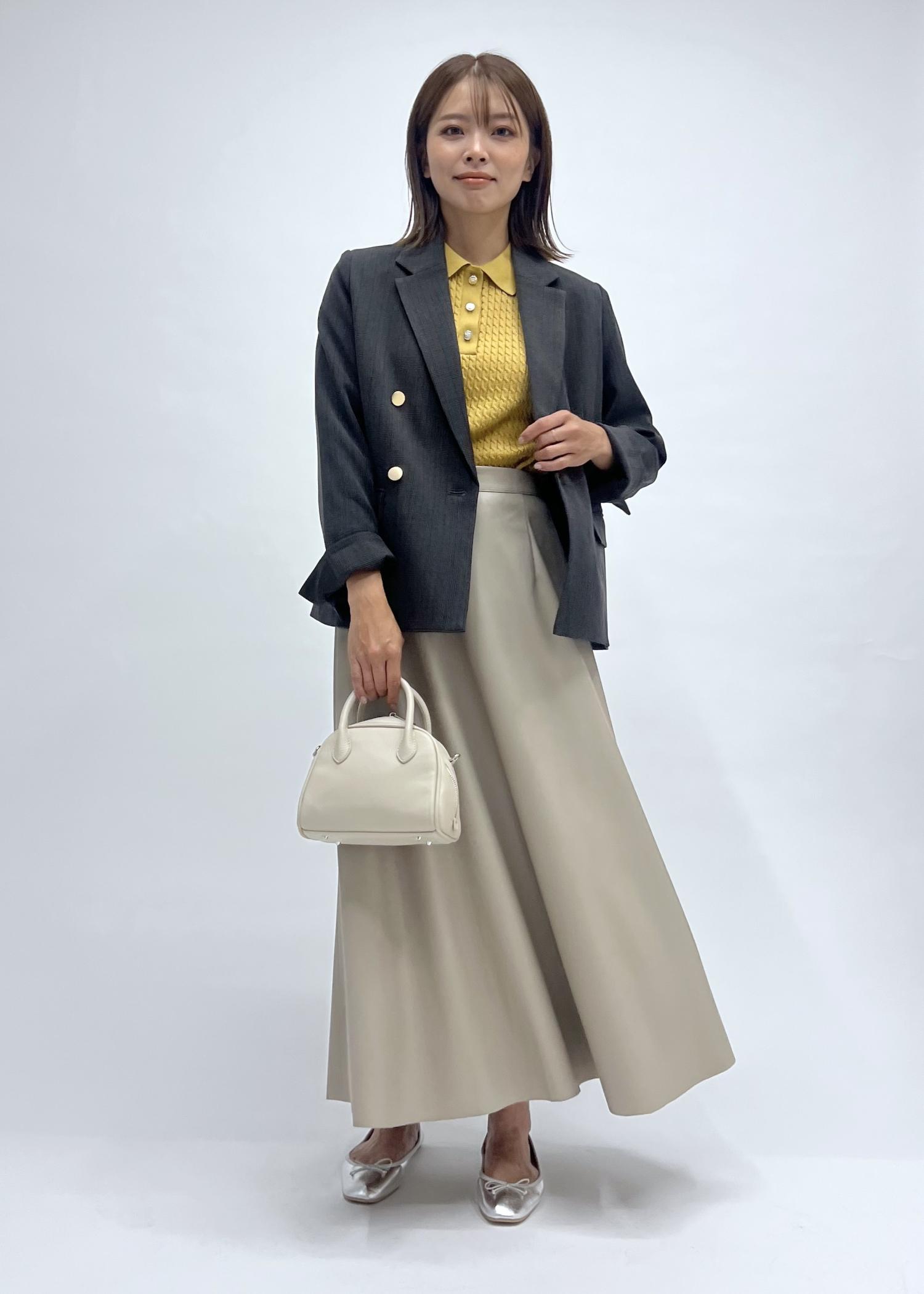 レザースカートはジャケットに合わせればきちんと見えも叶えてくれます。
