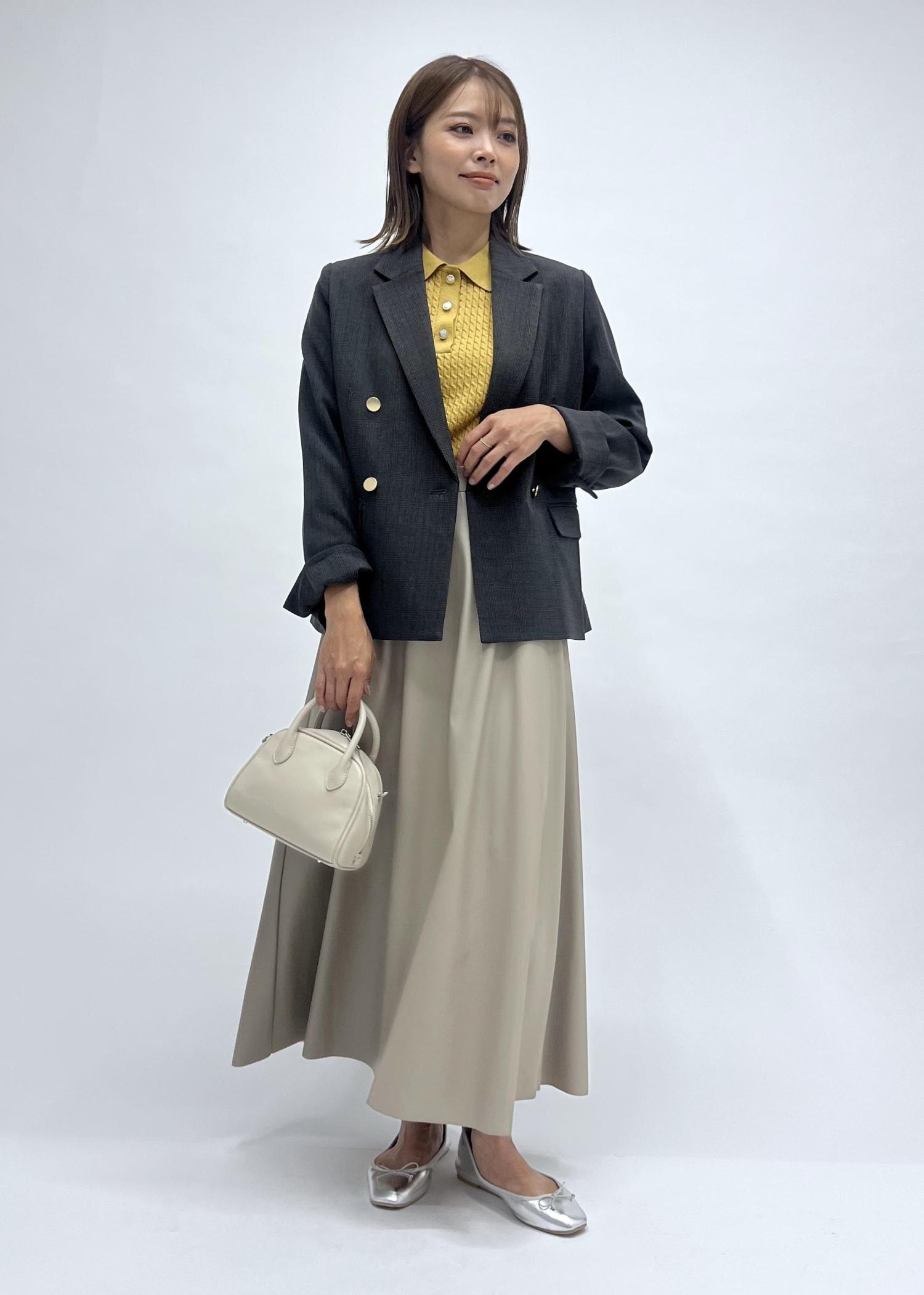 重たく見えないようにインナーにマスタードイエローのポロシャツをインして、秋らしさを感じるカラーコーデにしました。