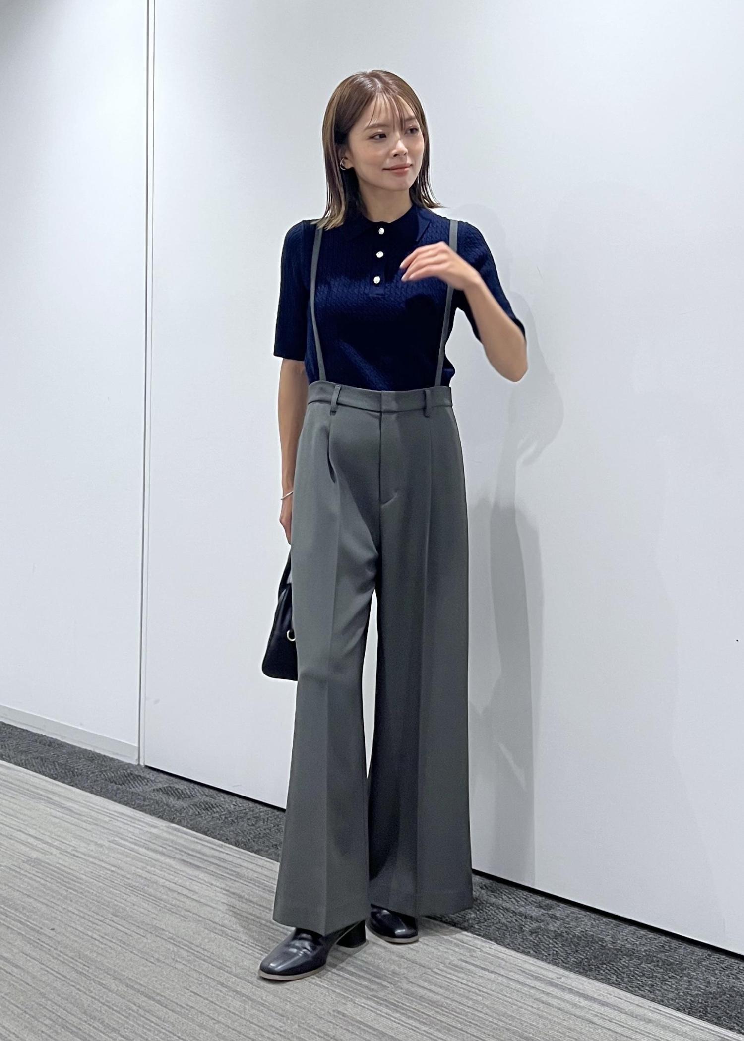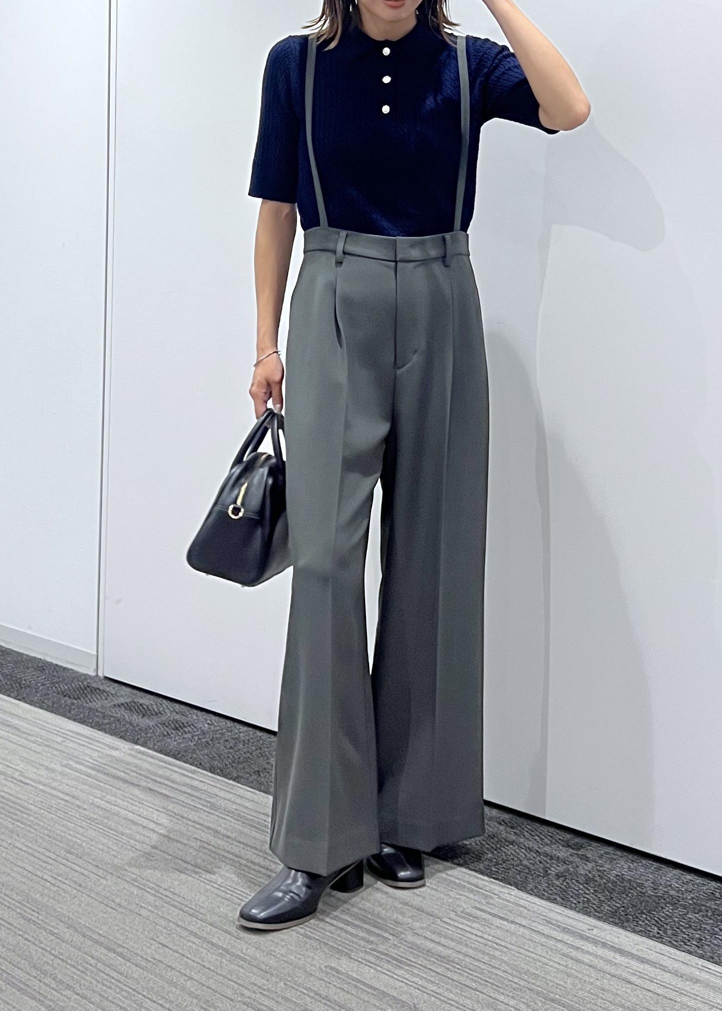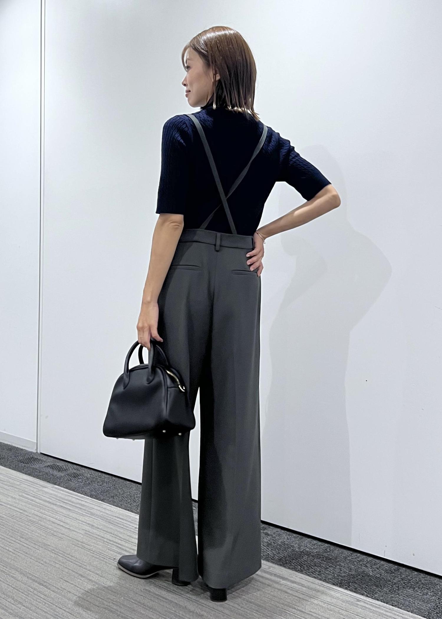 サスペンダー付きのワイドパンツを合わせて、きれいめカジュアルなスタイリングにしました。