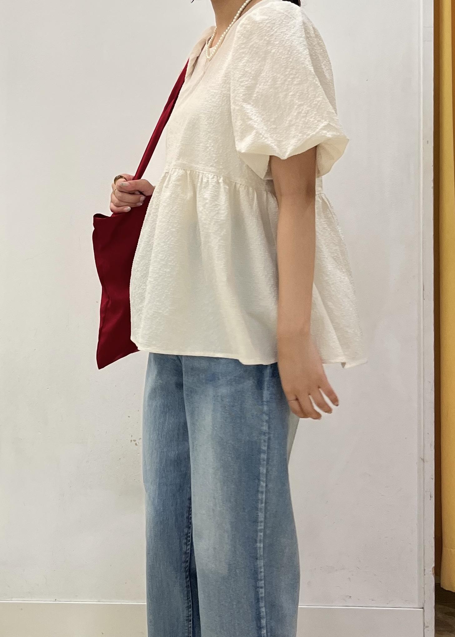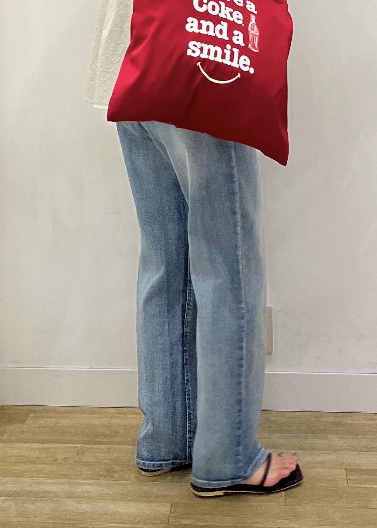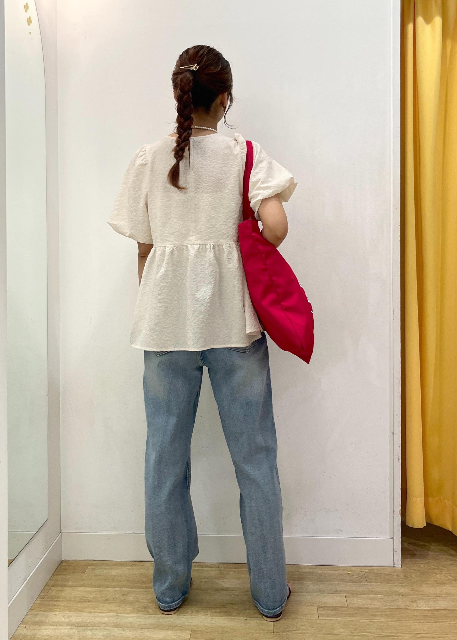 ペプラムブラウスにデニムパンツを合わせたきれいめカジュアルコーデ♪レッドカラーのトートバッグもアクセントになります✨