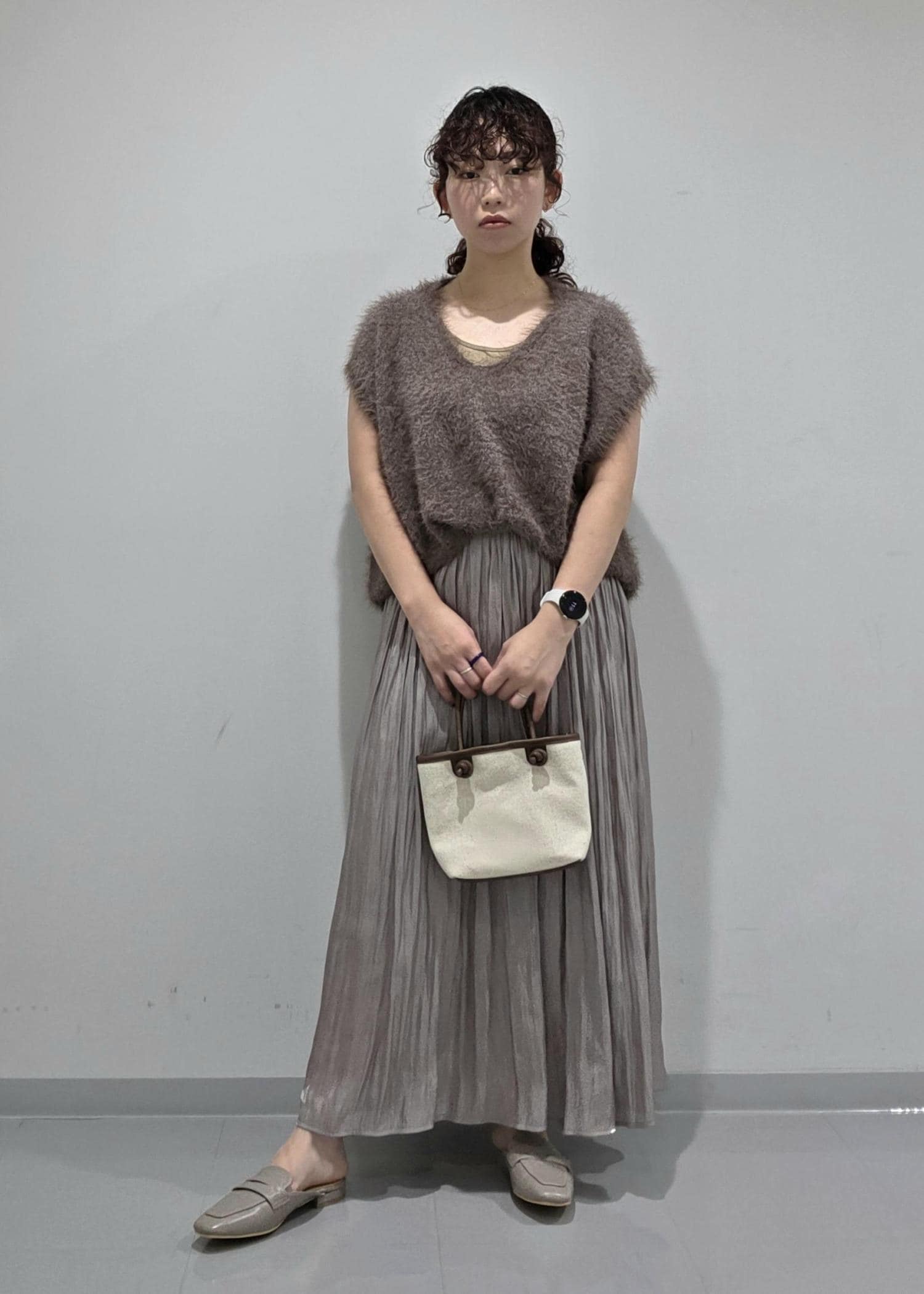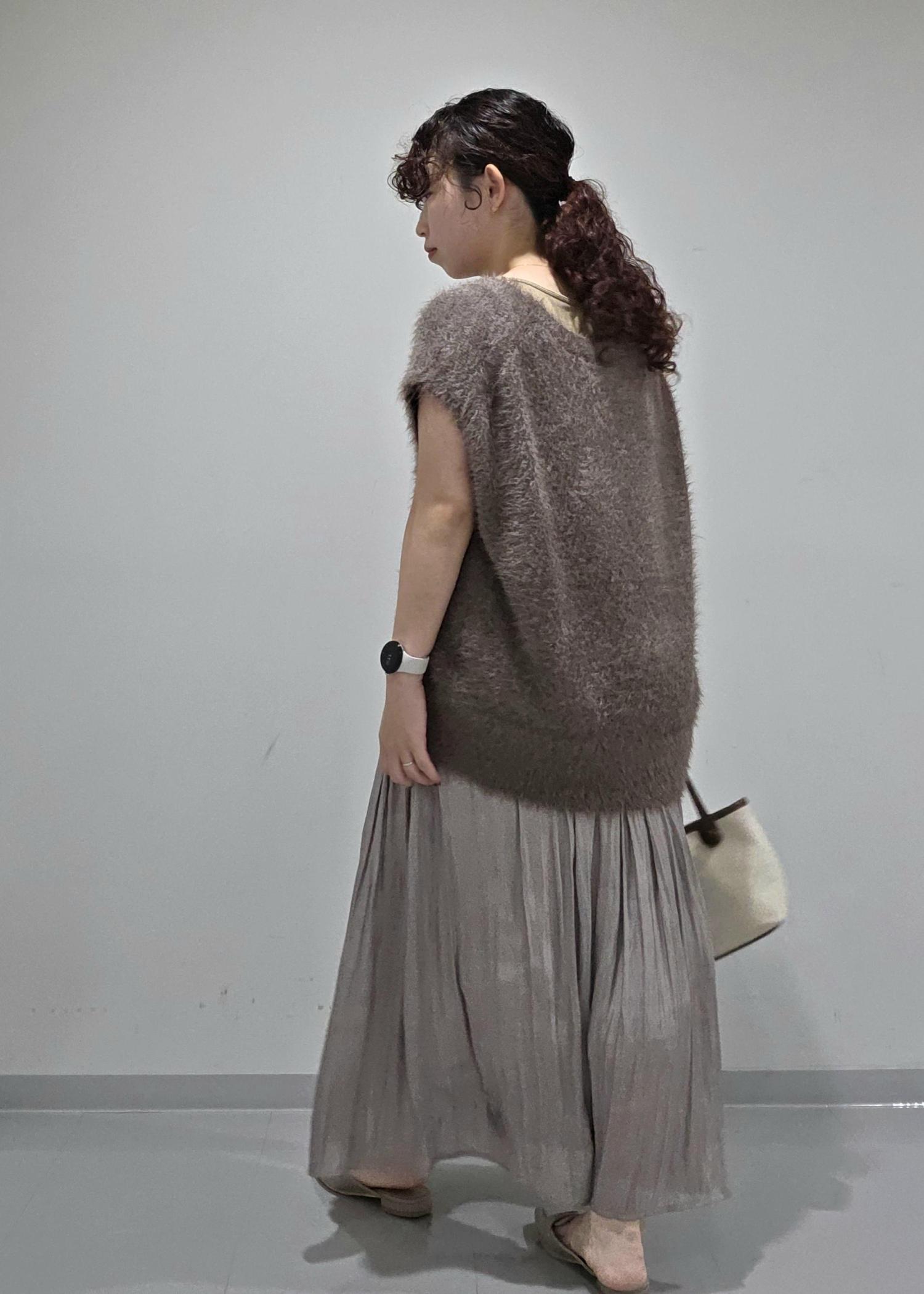 新作のシャギーニットベストをツヤ感のあるスカートと合わせて女性らしいスタイリング!
