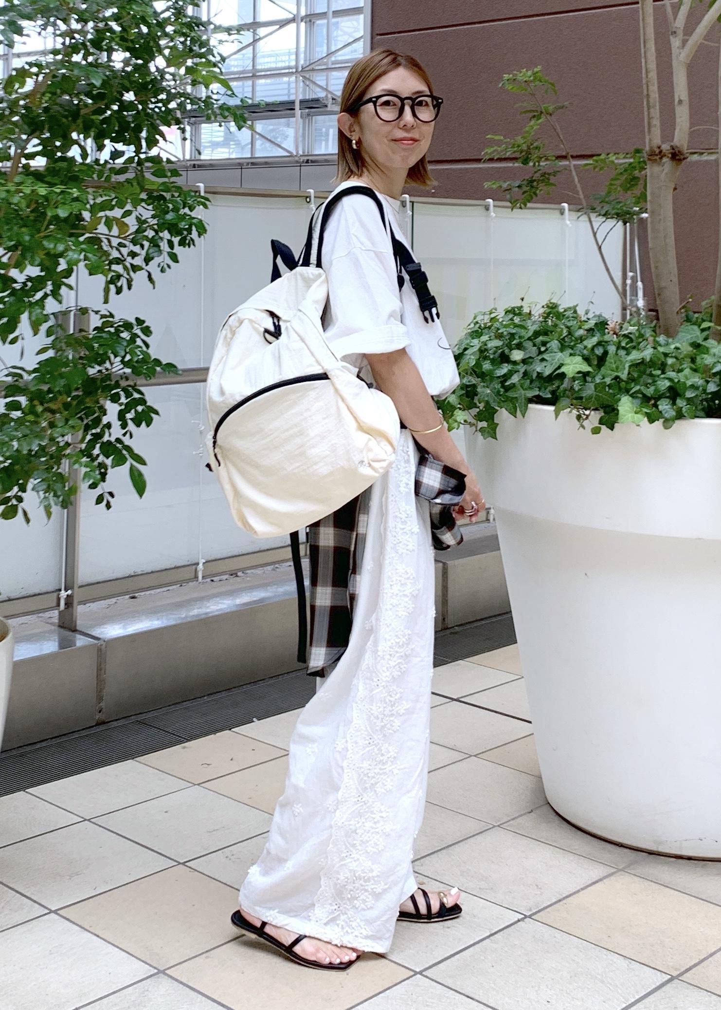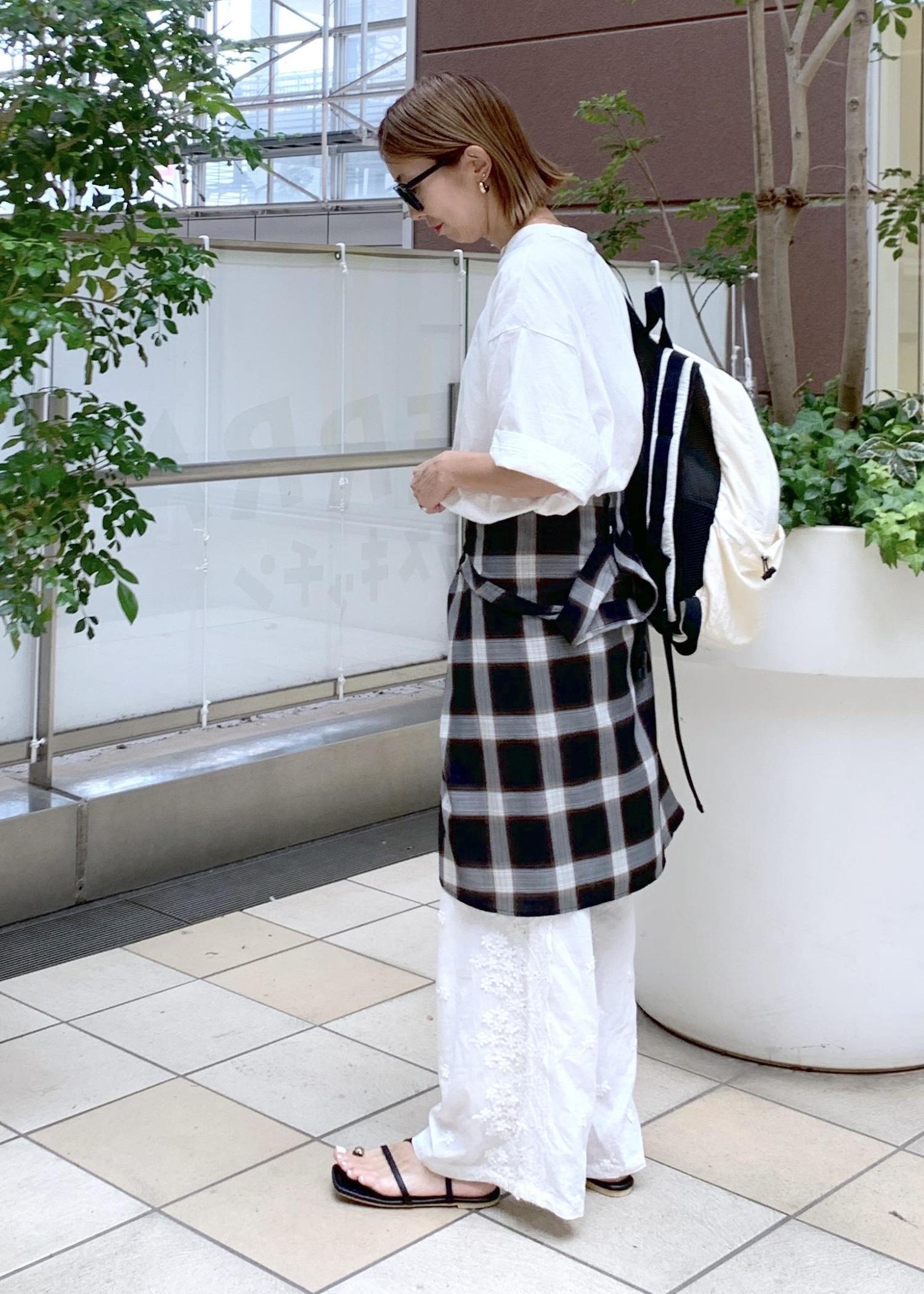 オールホワイトコーデにオンブレチェックシャツがポイントの大人カジュアルスタイリング。