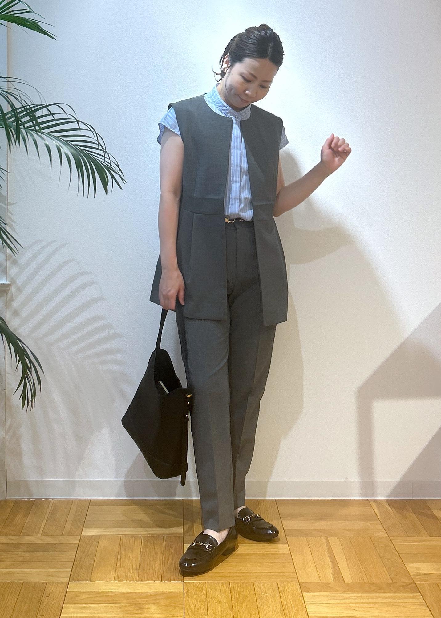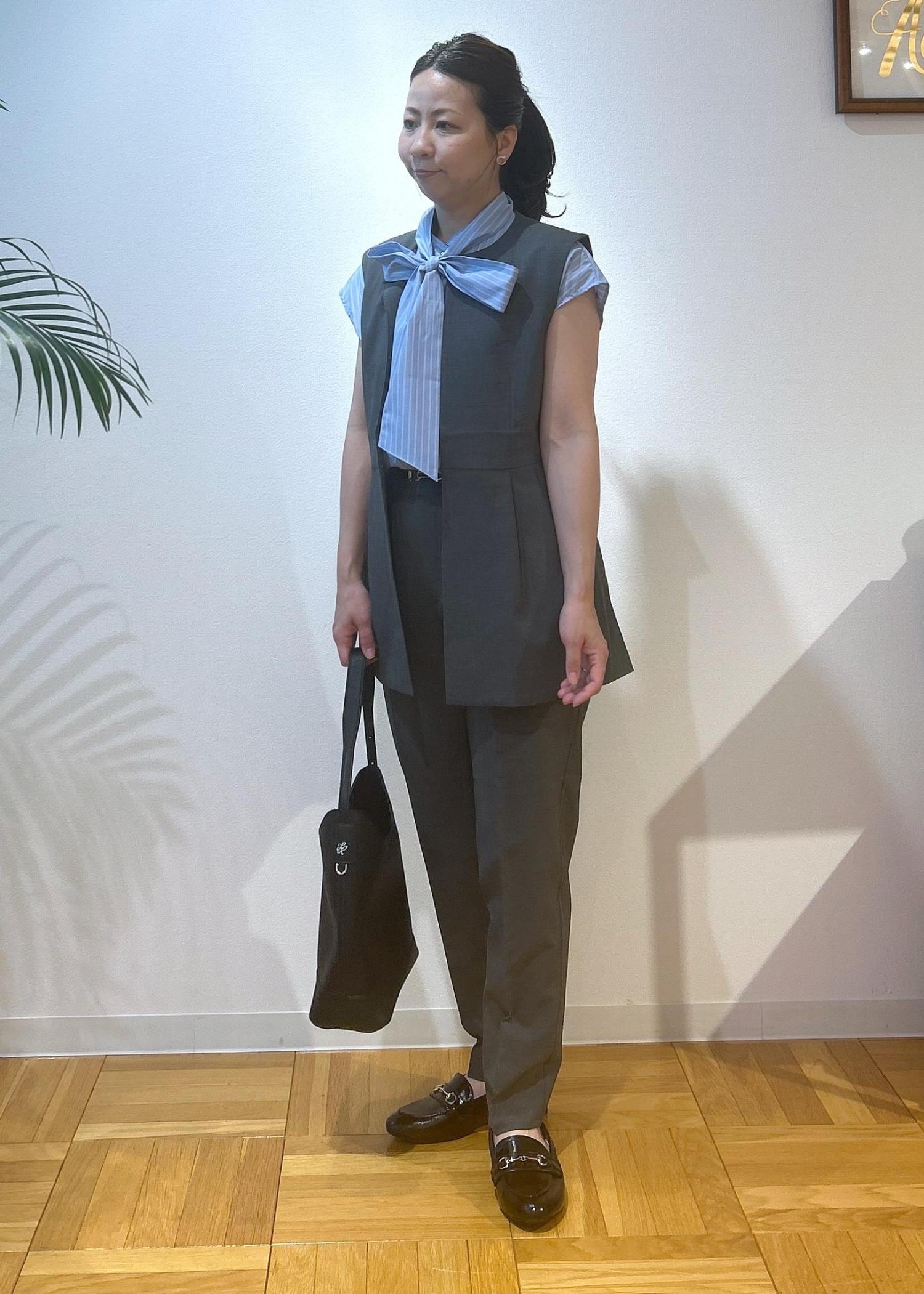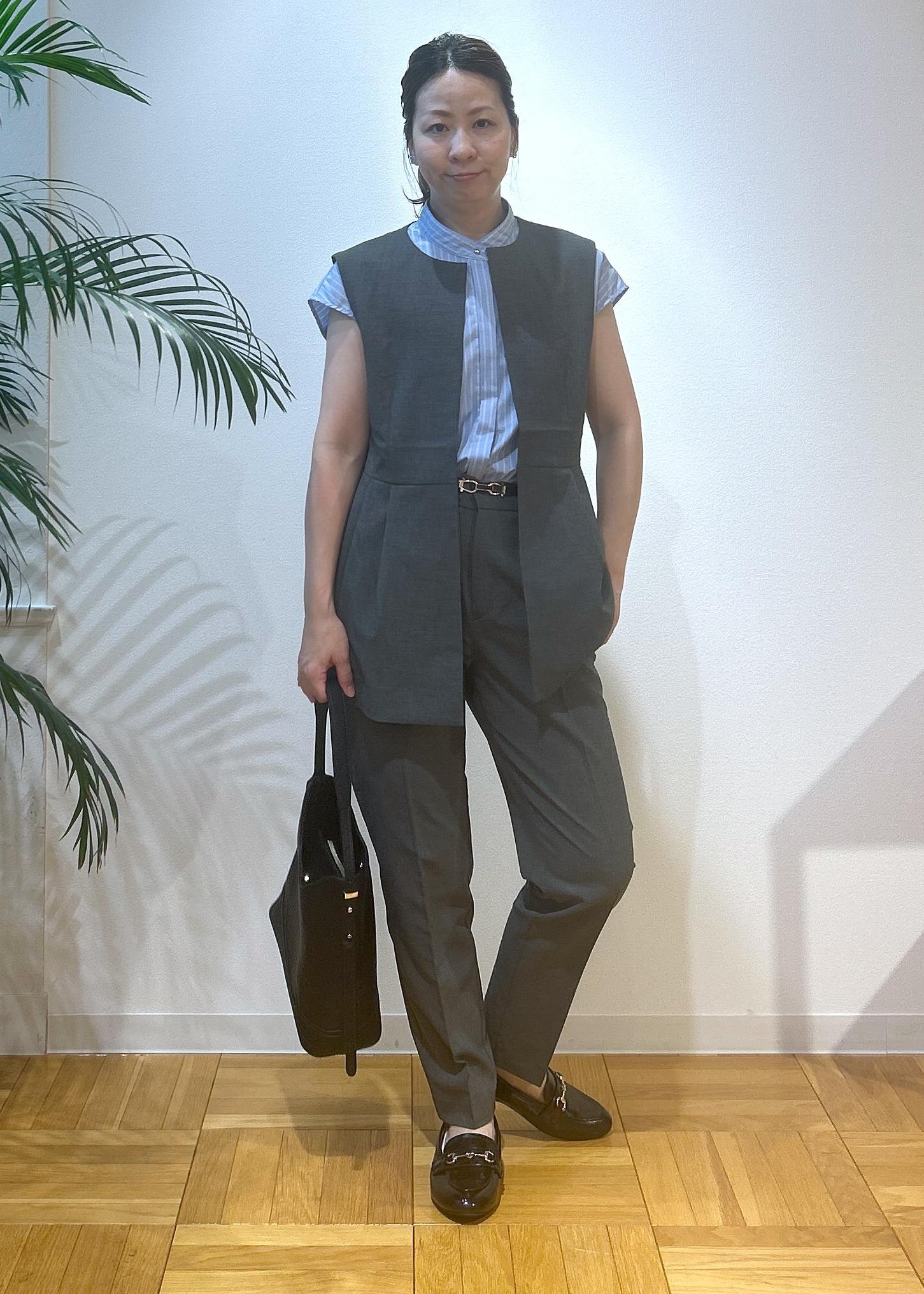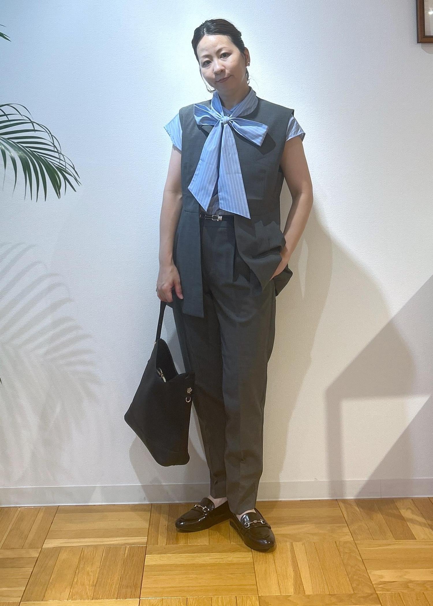 グレーとストライプシャツで組み合わせたことで、爽やかだけど落ち着きのあるコーディネートに仕上げました。また小物も黒で統一したのでより信頼感が上がるスタイリングにしました。