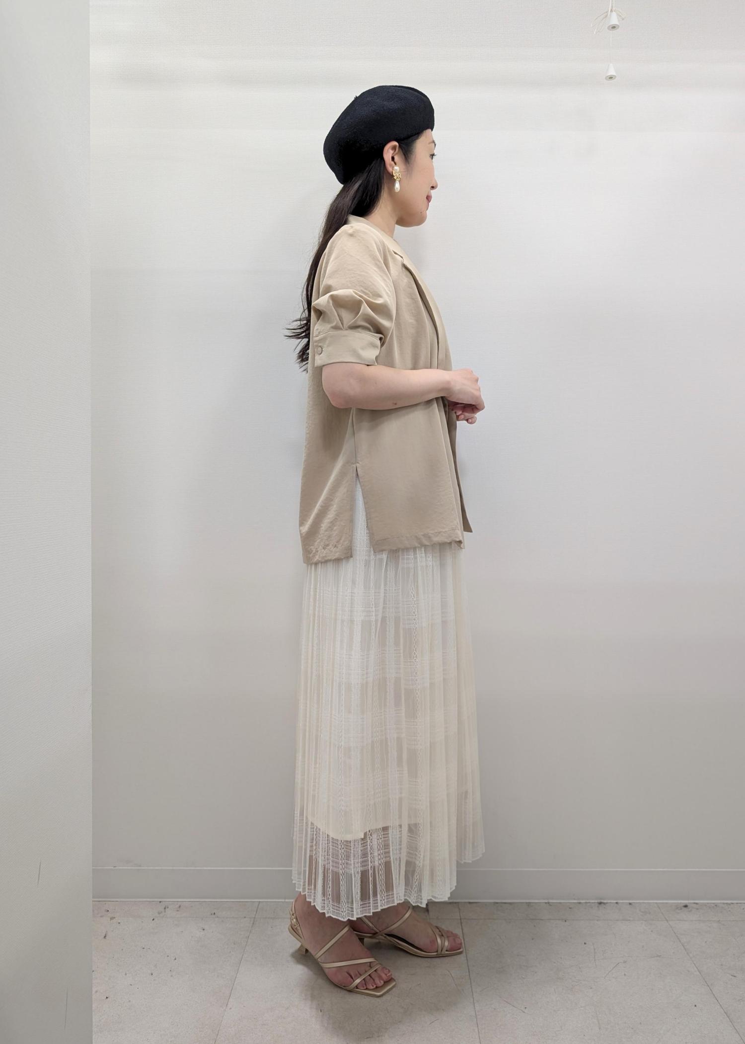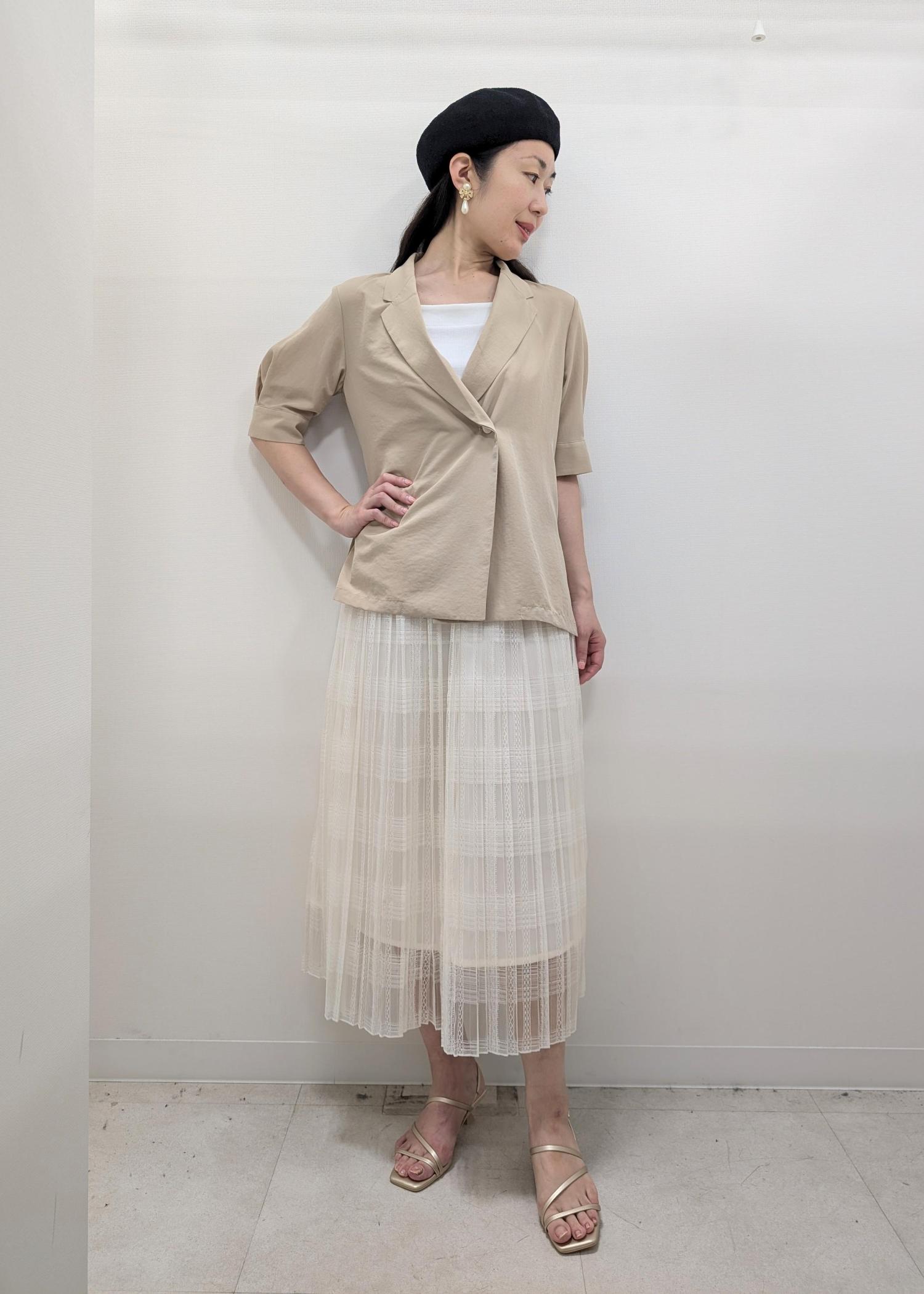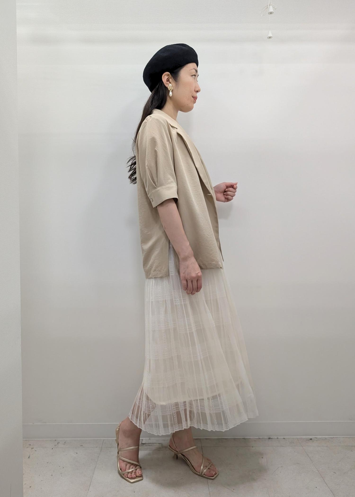 パフスリーブのジャケット風カーディガンとレースのチェックスカートがモード感のある組み合わせです(^.^)