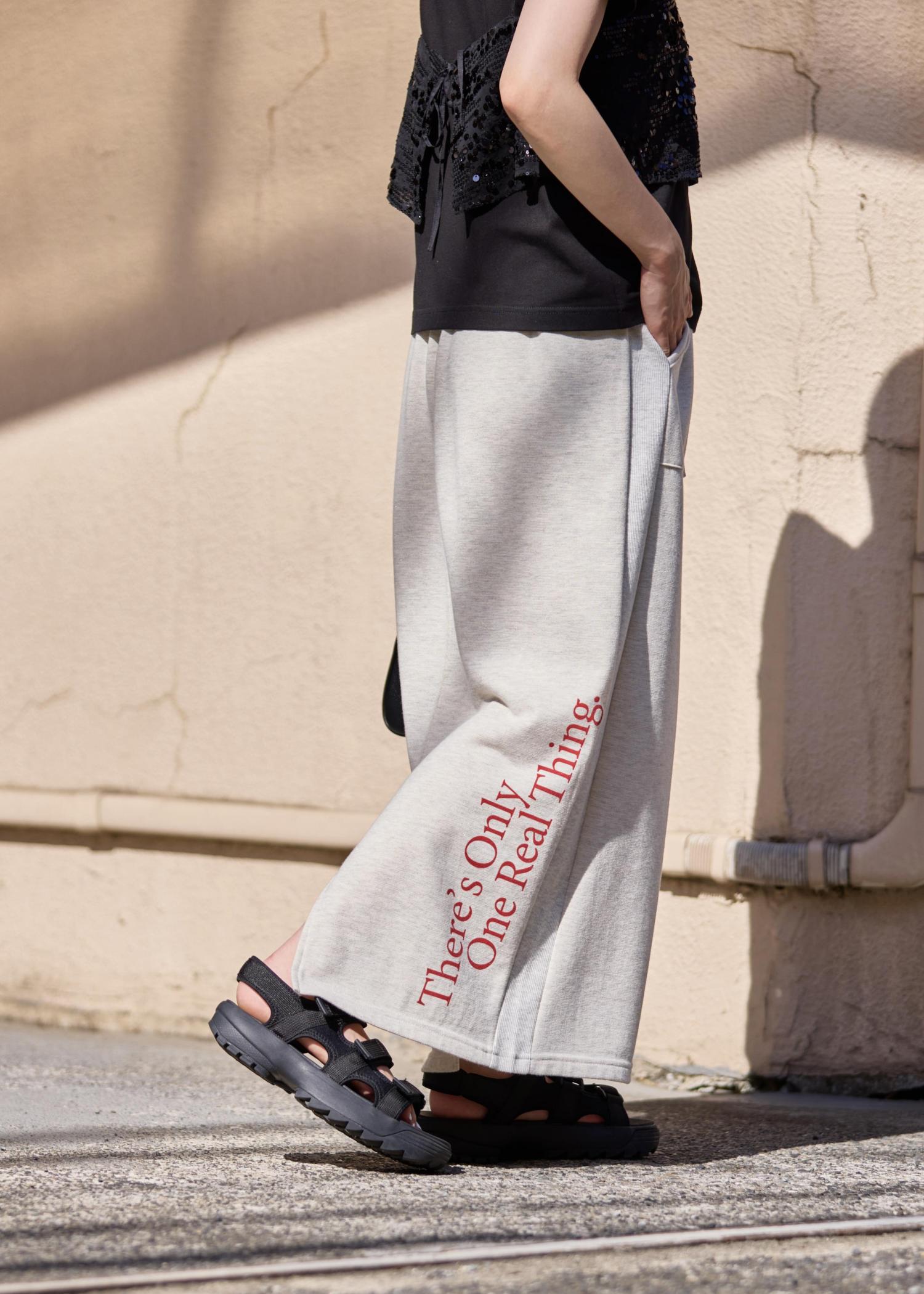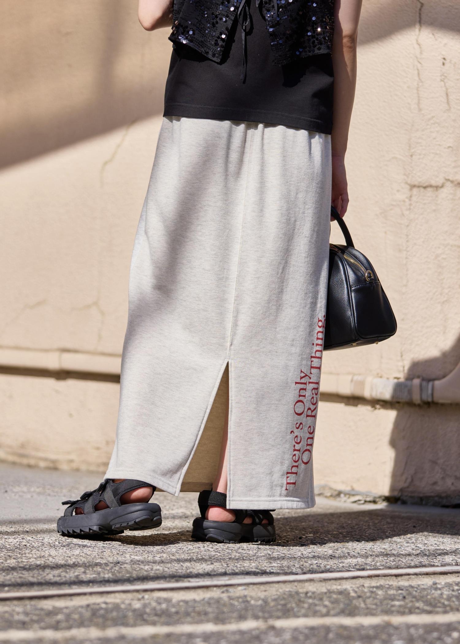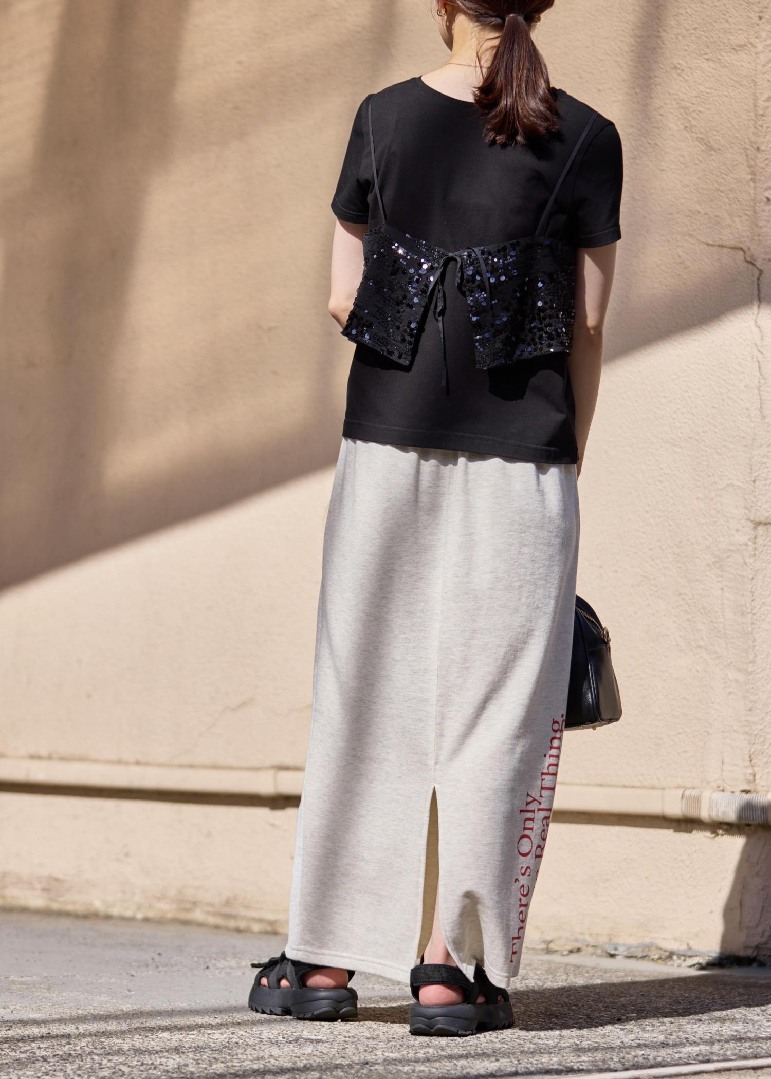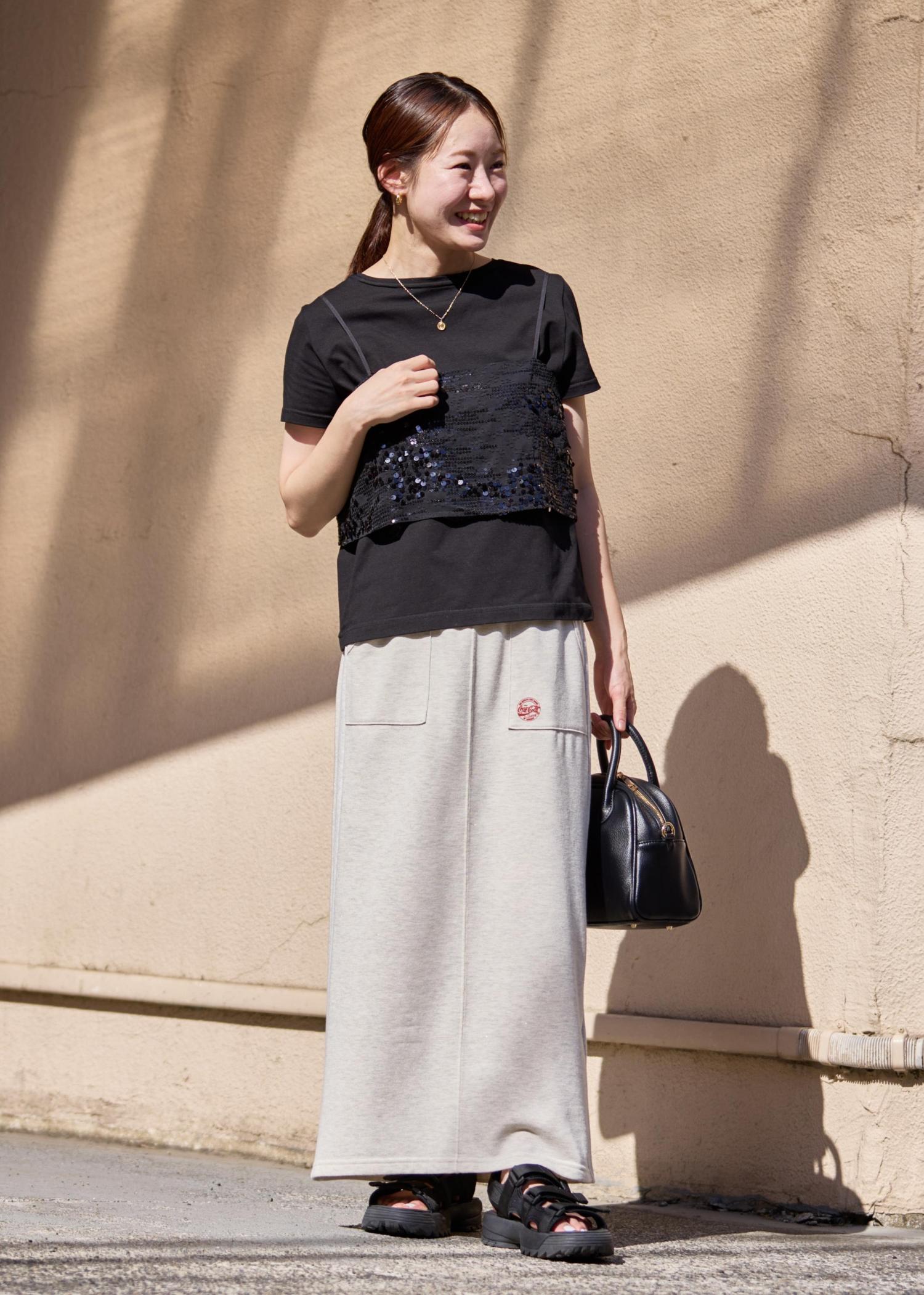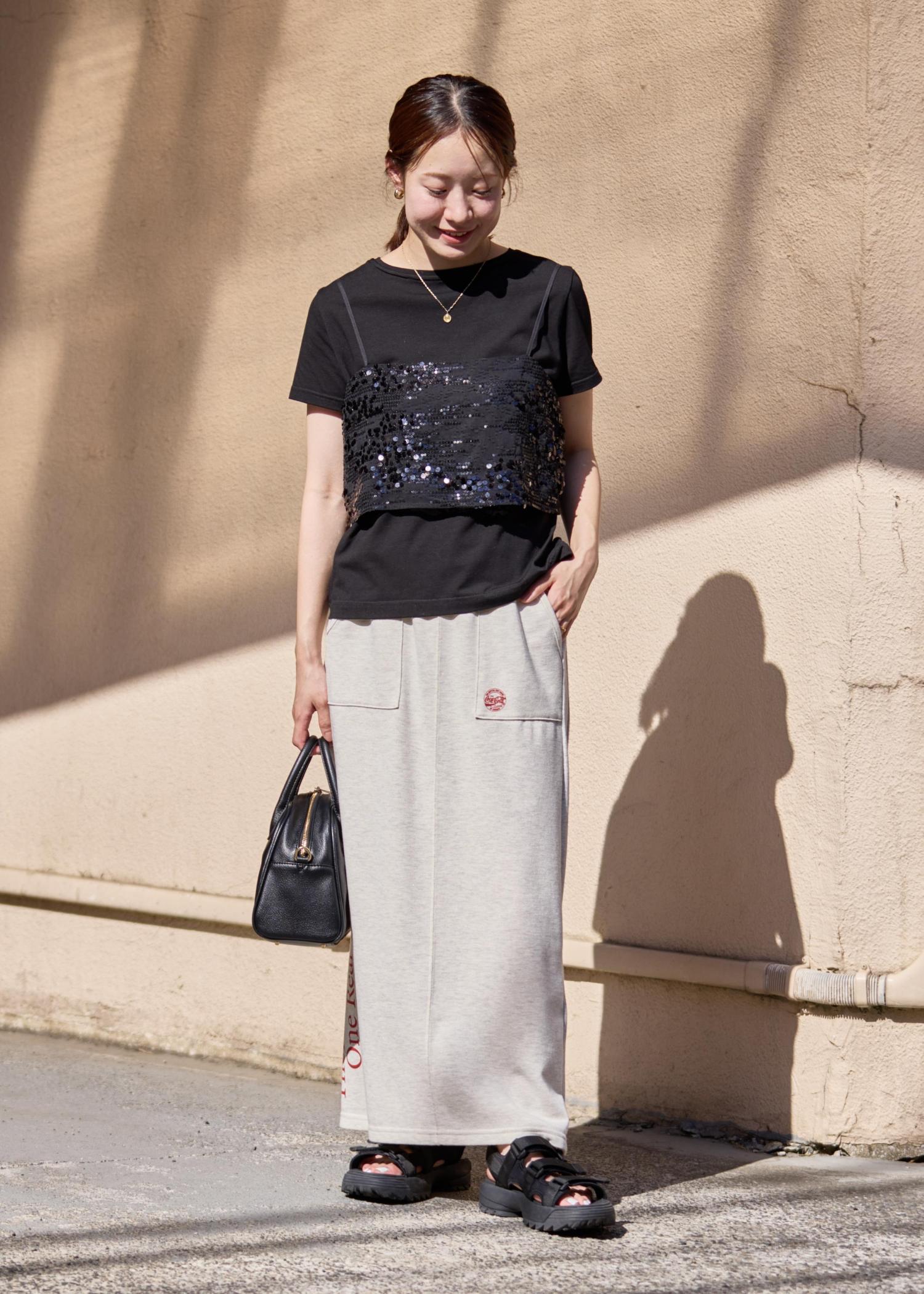 カジュアルなスウェットのスカートに、スパンコールビスチェを合わせて、女性らしさをプラス!