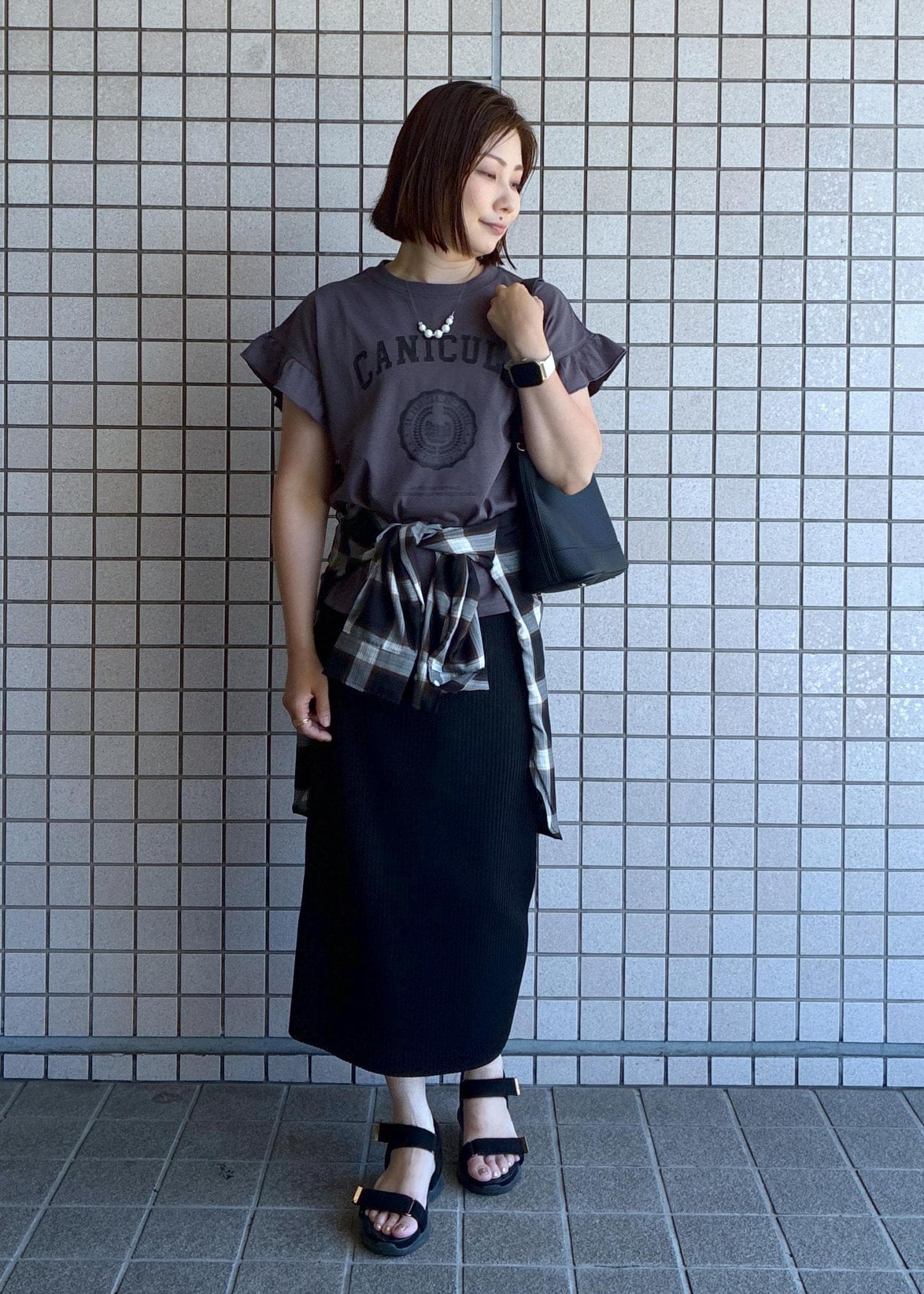 チェックのシャツがワンポイントで、袖などデザインにボリューム感ある時は腰巻きがおすすめです♡