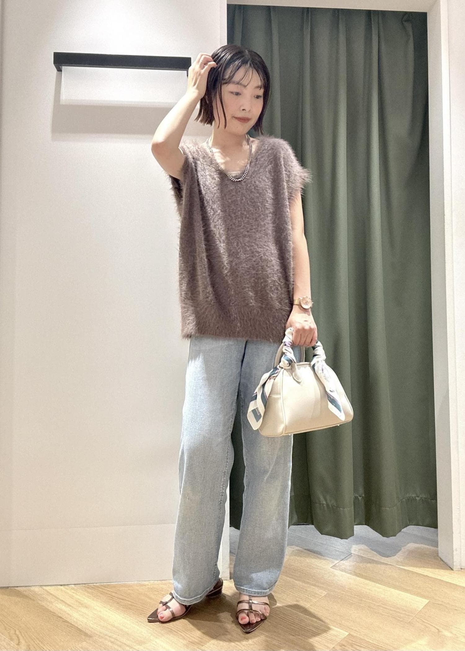 ふんわり柔らかいシャギーには、カジュアルなデニムとの相性が抜群です!首の空きが大きいトップスには、ロングネックレスの縦ライン効果で首元スッキリです!