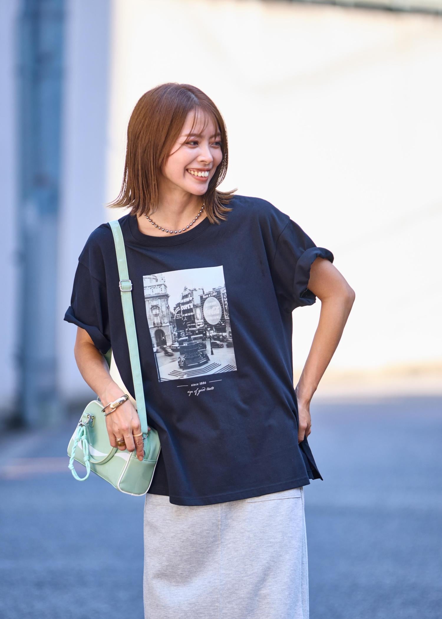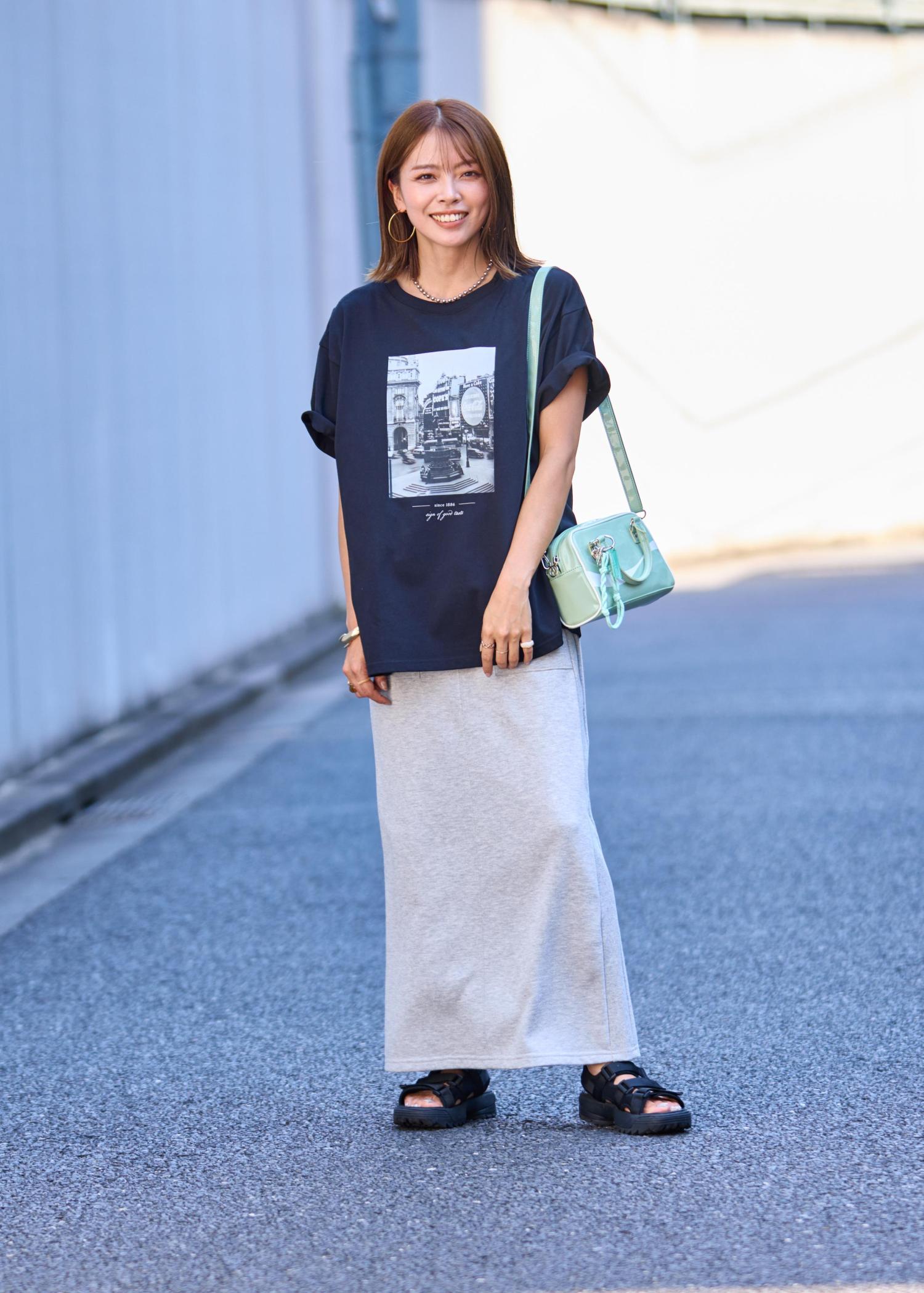 ブラックのTシャツはモノトーンプリントが大人カジュアルな着こなしにぴったり。