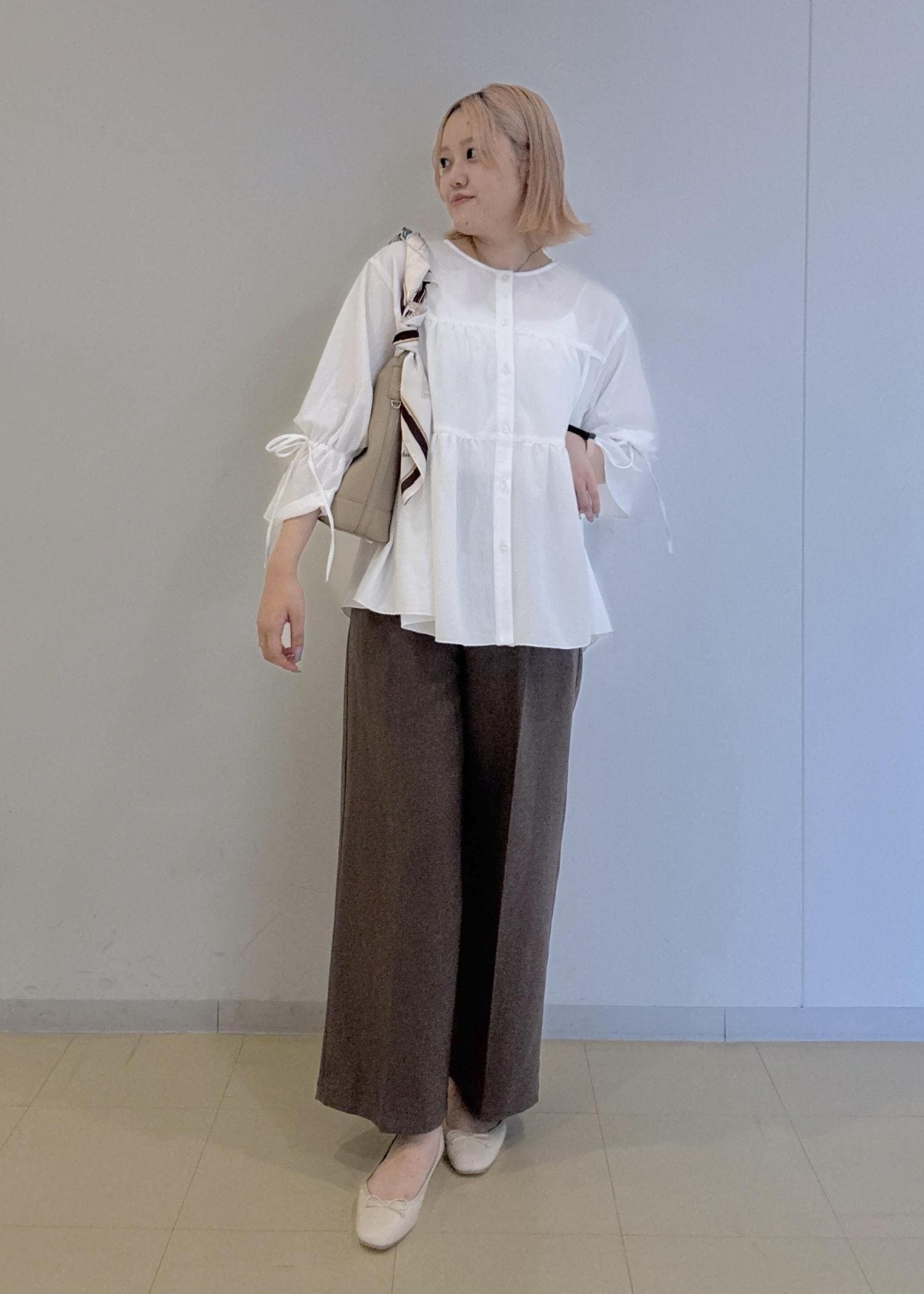 ブラウスは長袖ですが透け感のある素材なので、秋の先取りコーデとしてもおすすめ!