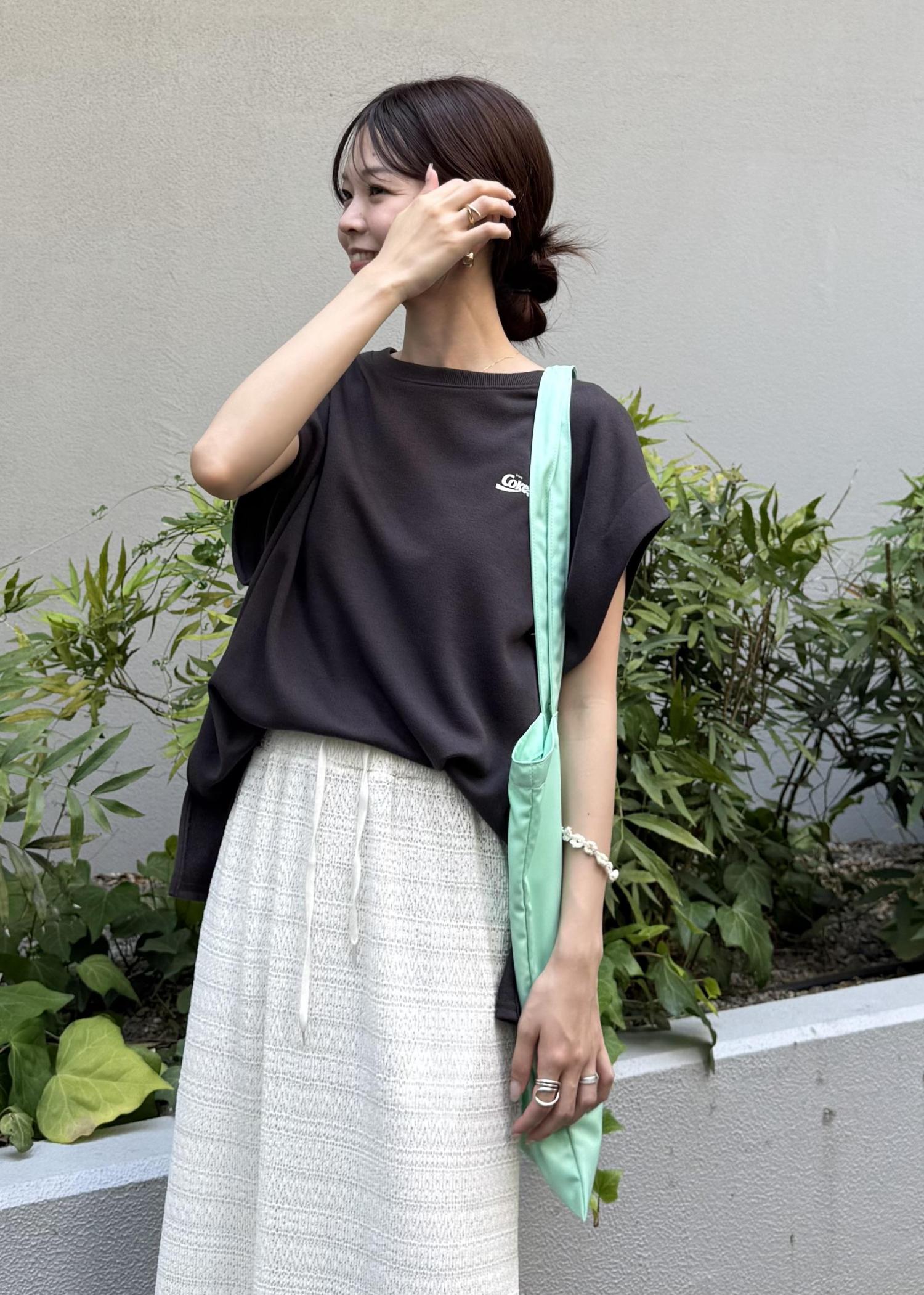 スエット素材でカジュアルですが、フレンチスリーブのディティールやゆったりした身幅が女性らしい印象に。
