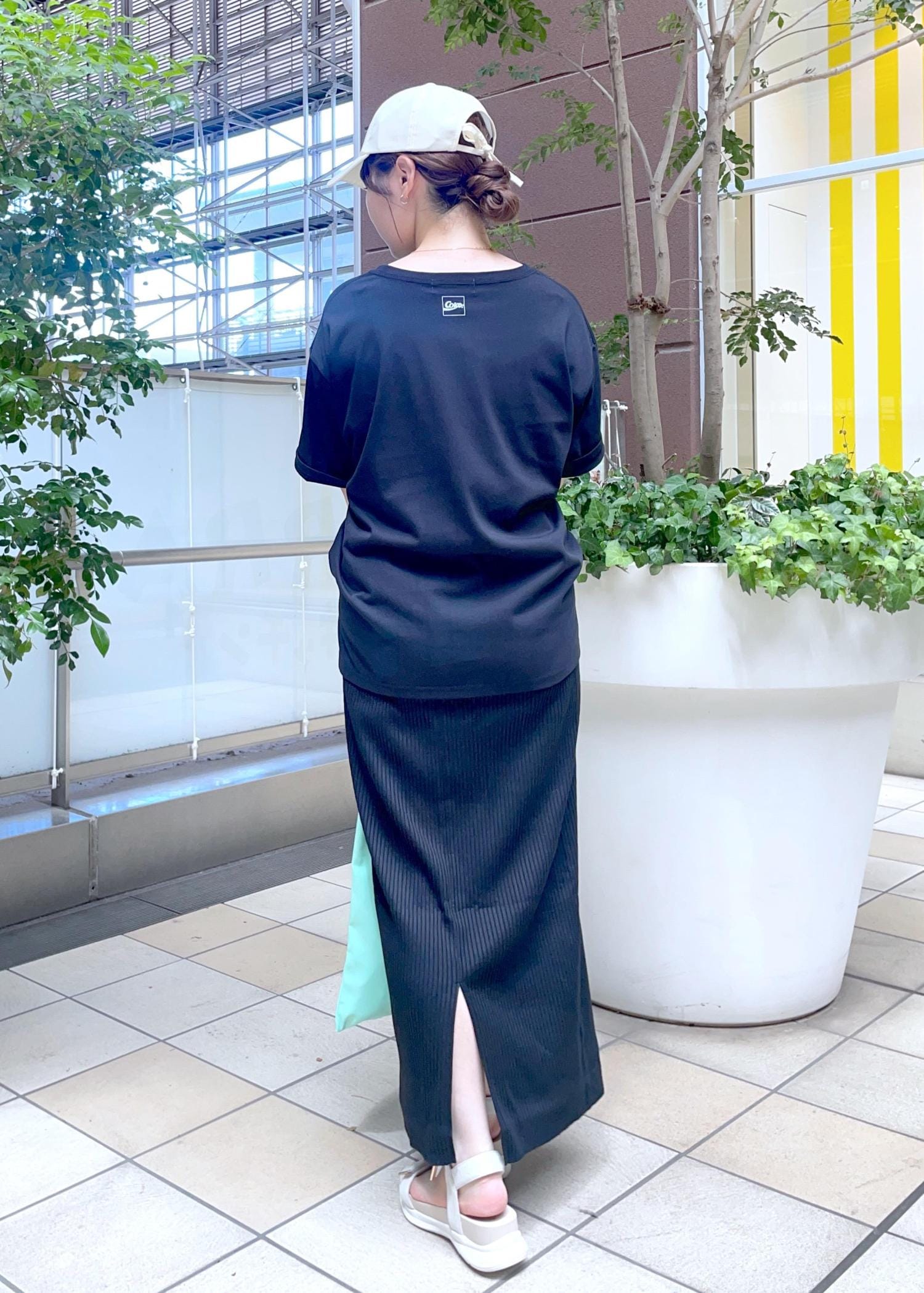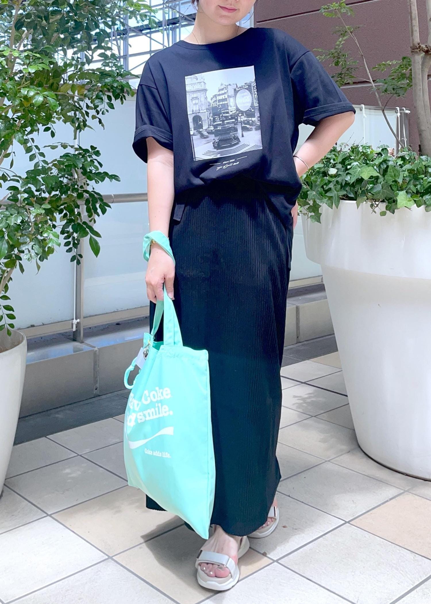 Coca-Colaの黒Tシャツに黒スカートを合わせたブラックコーデてす。