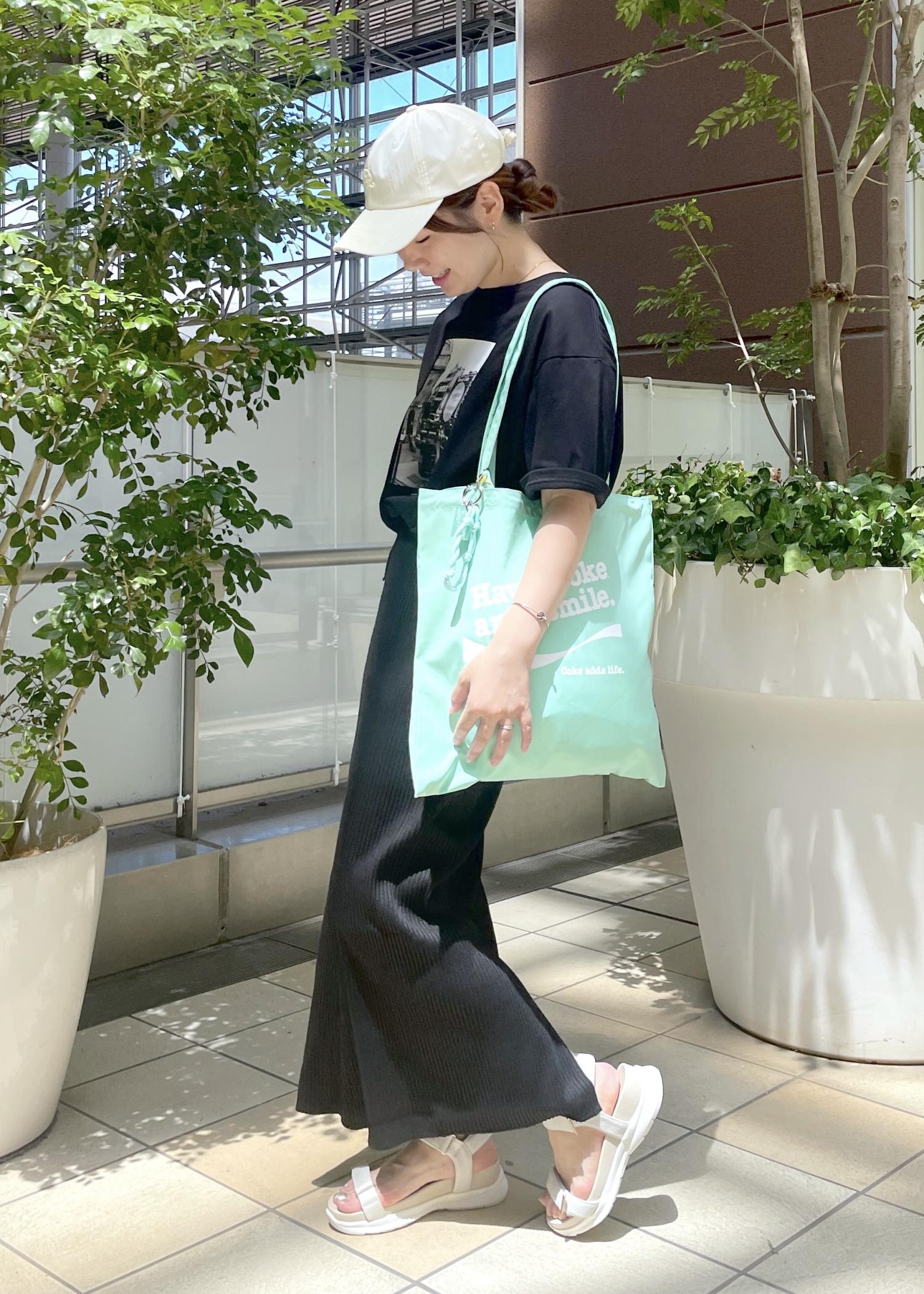 重たい印象にならないように小物はホワイトやブルーのカラーを取り入れて大人っぽいカジュアルコーデにしました◎