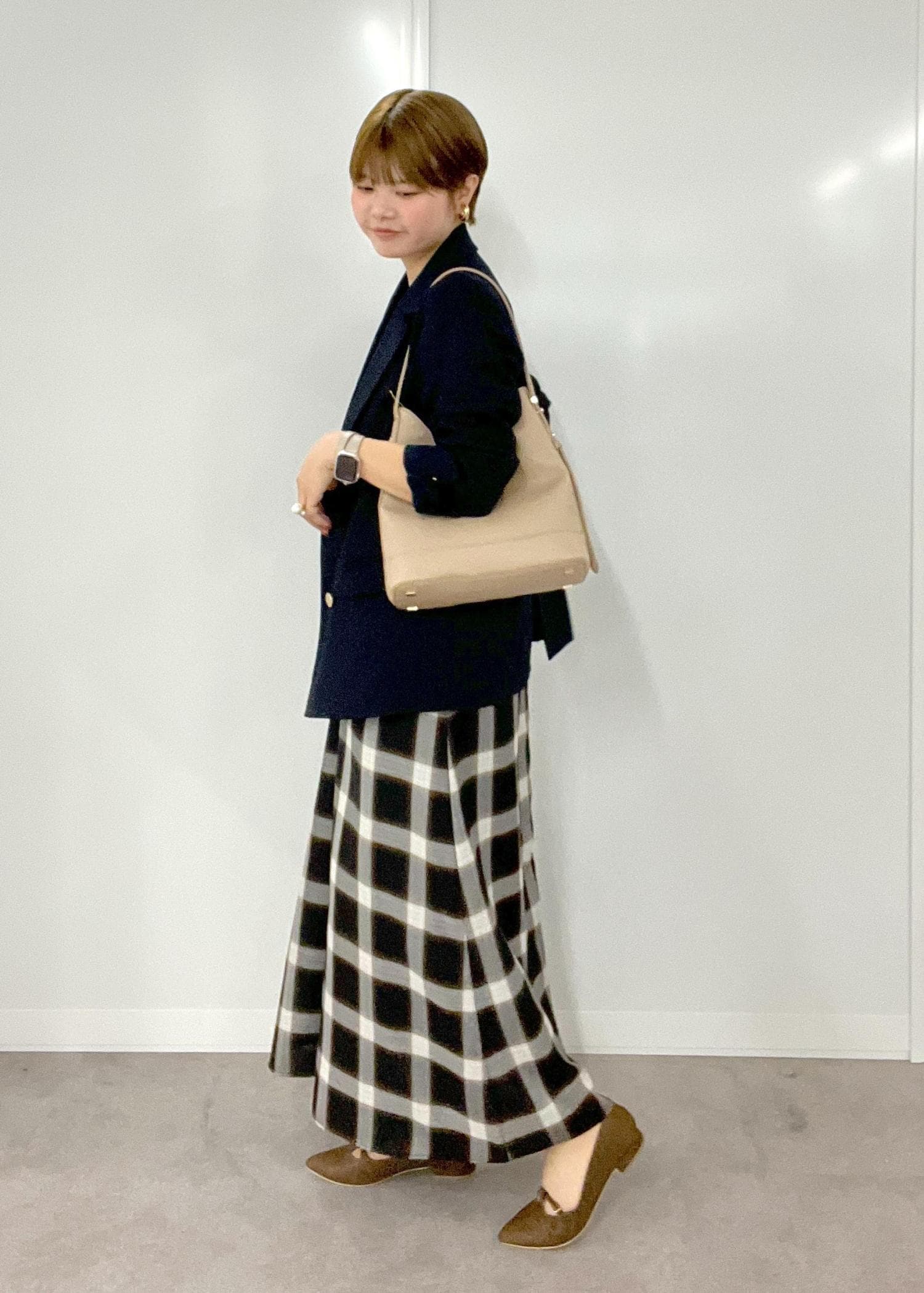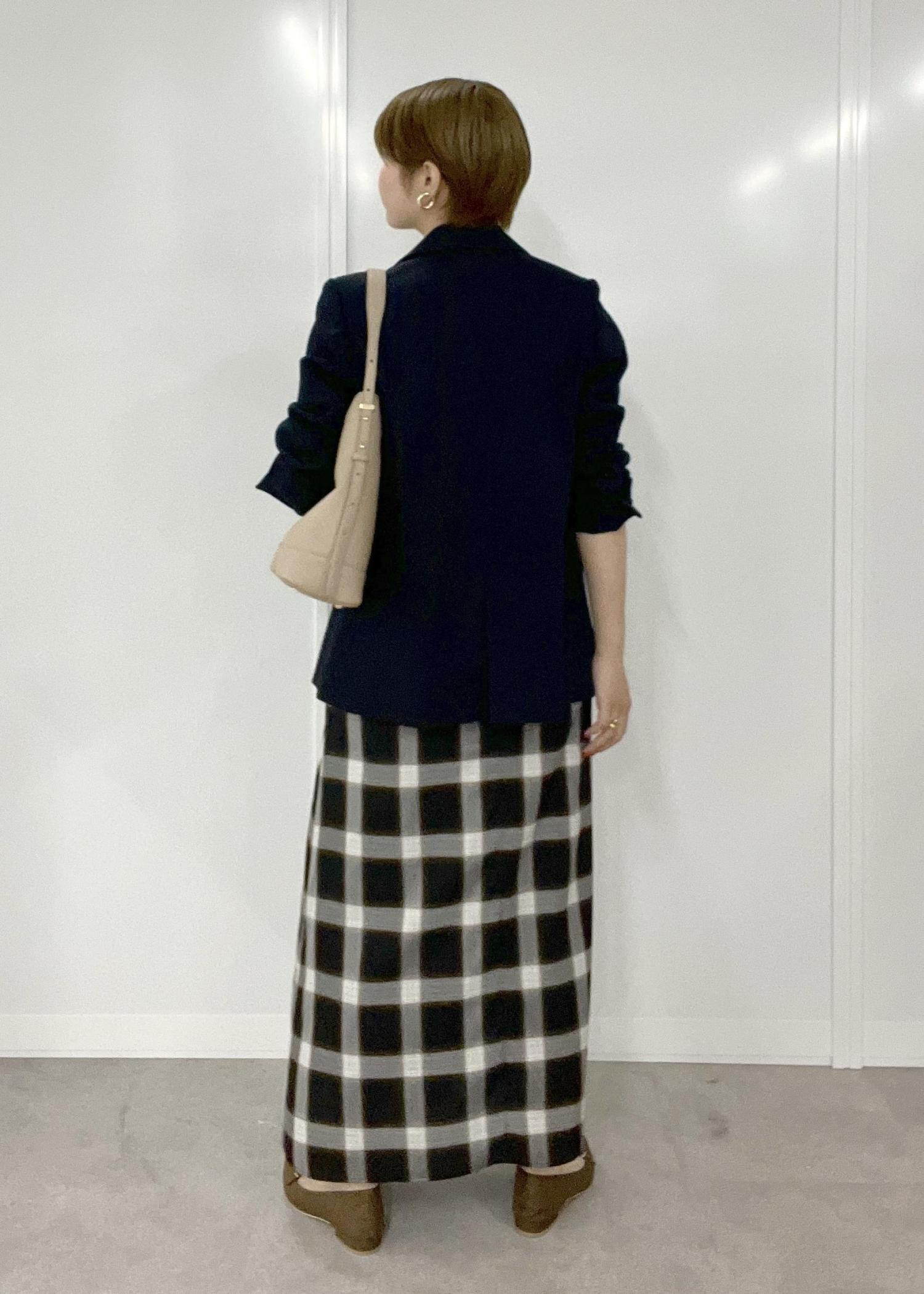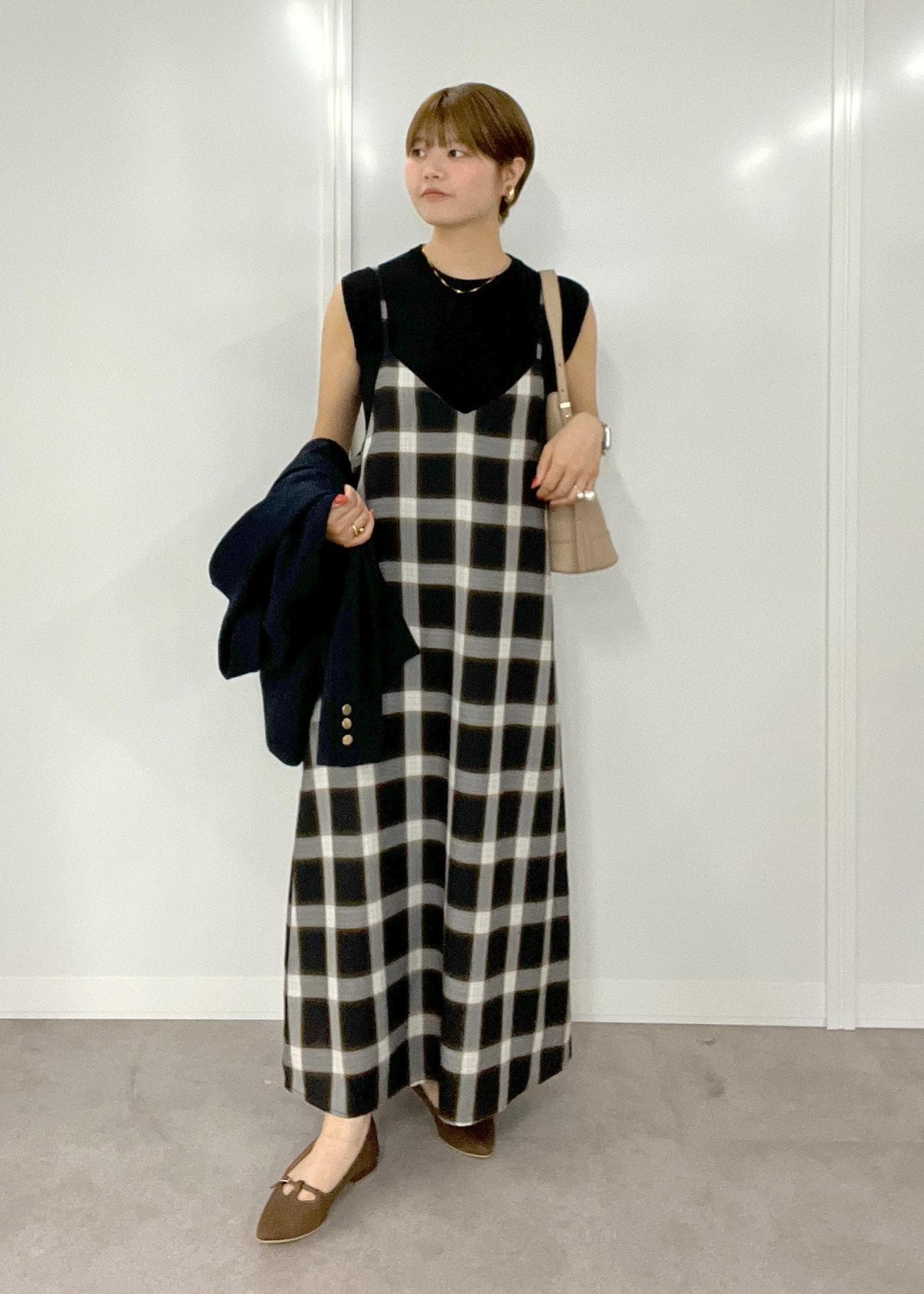 ワンピースやジャケットで縦のラインを意識・パンプスも