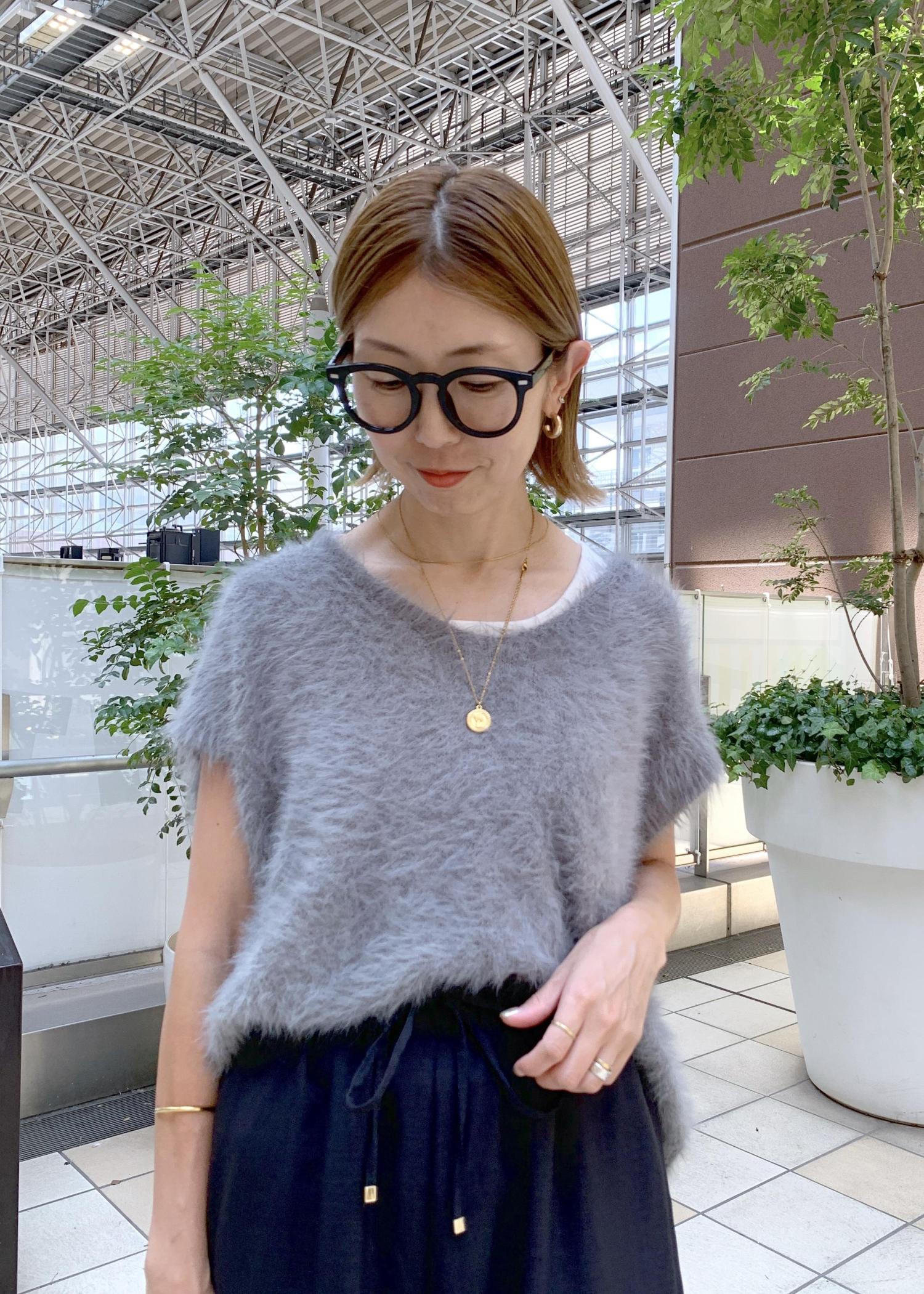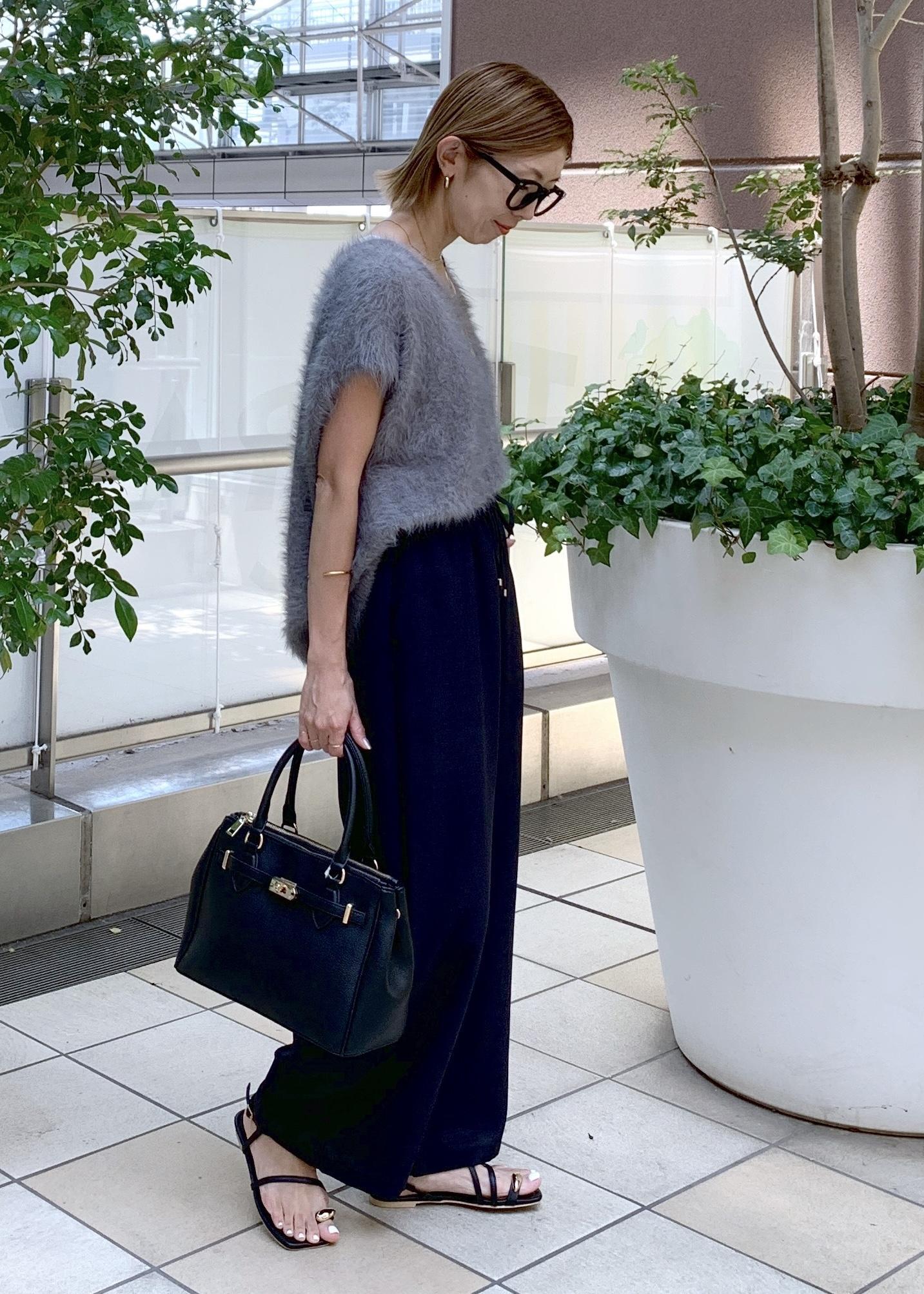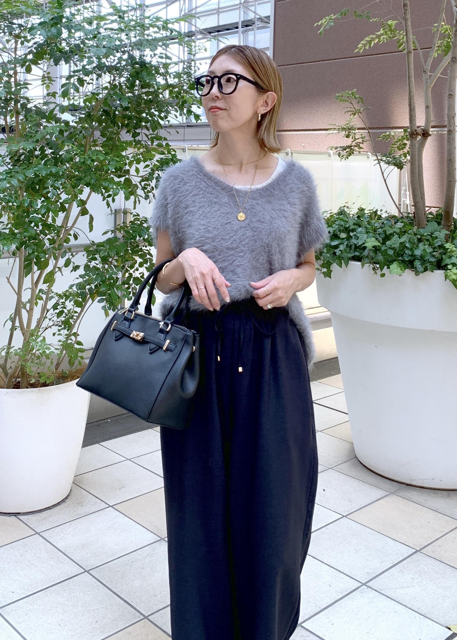 チャコールのワイドパンツを合わせて秋先取りスタイリング。