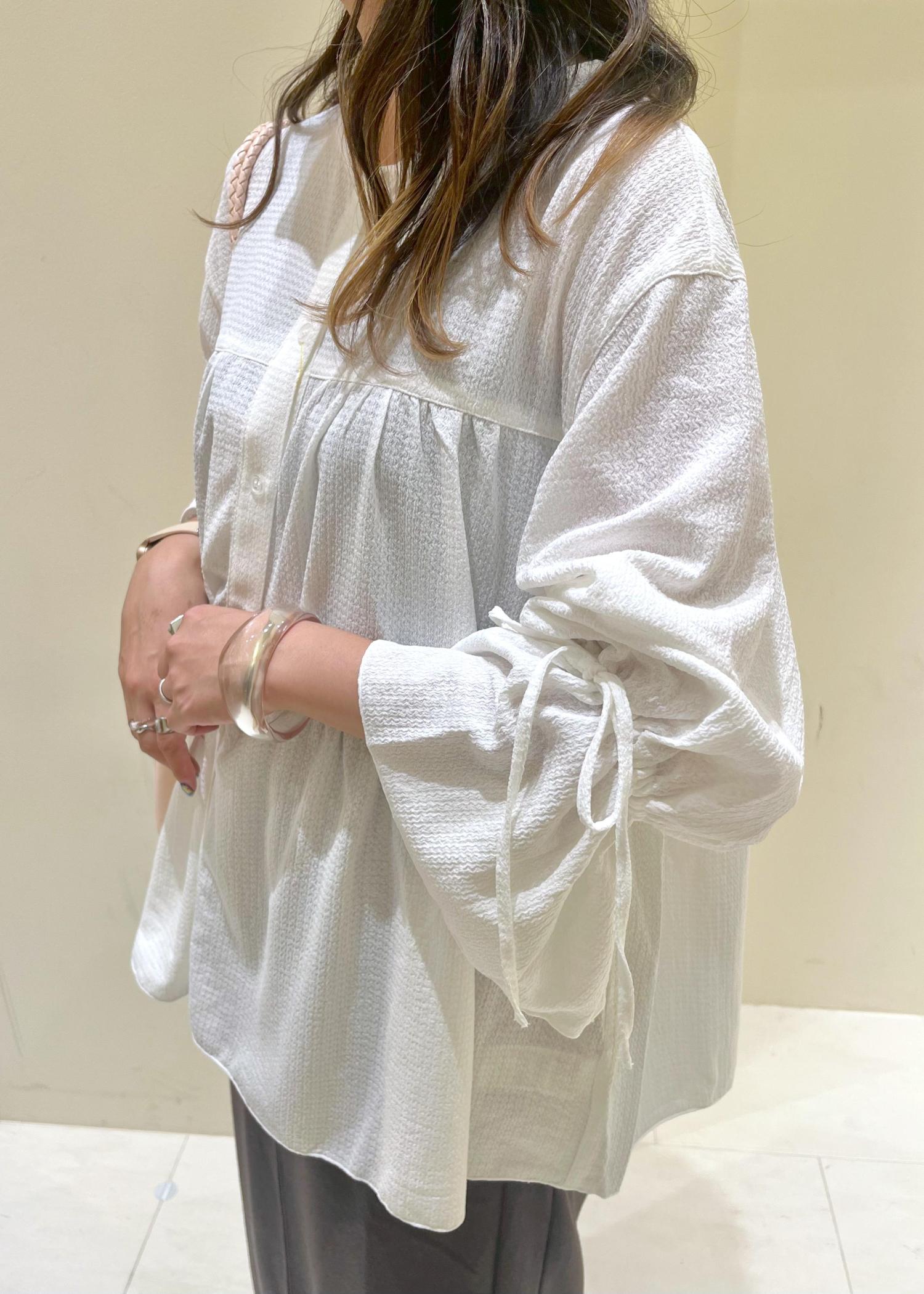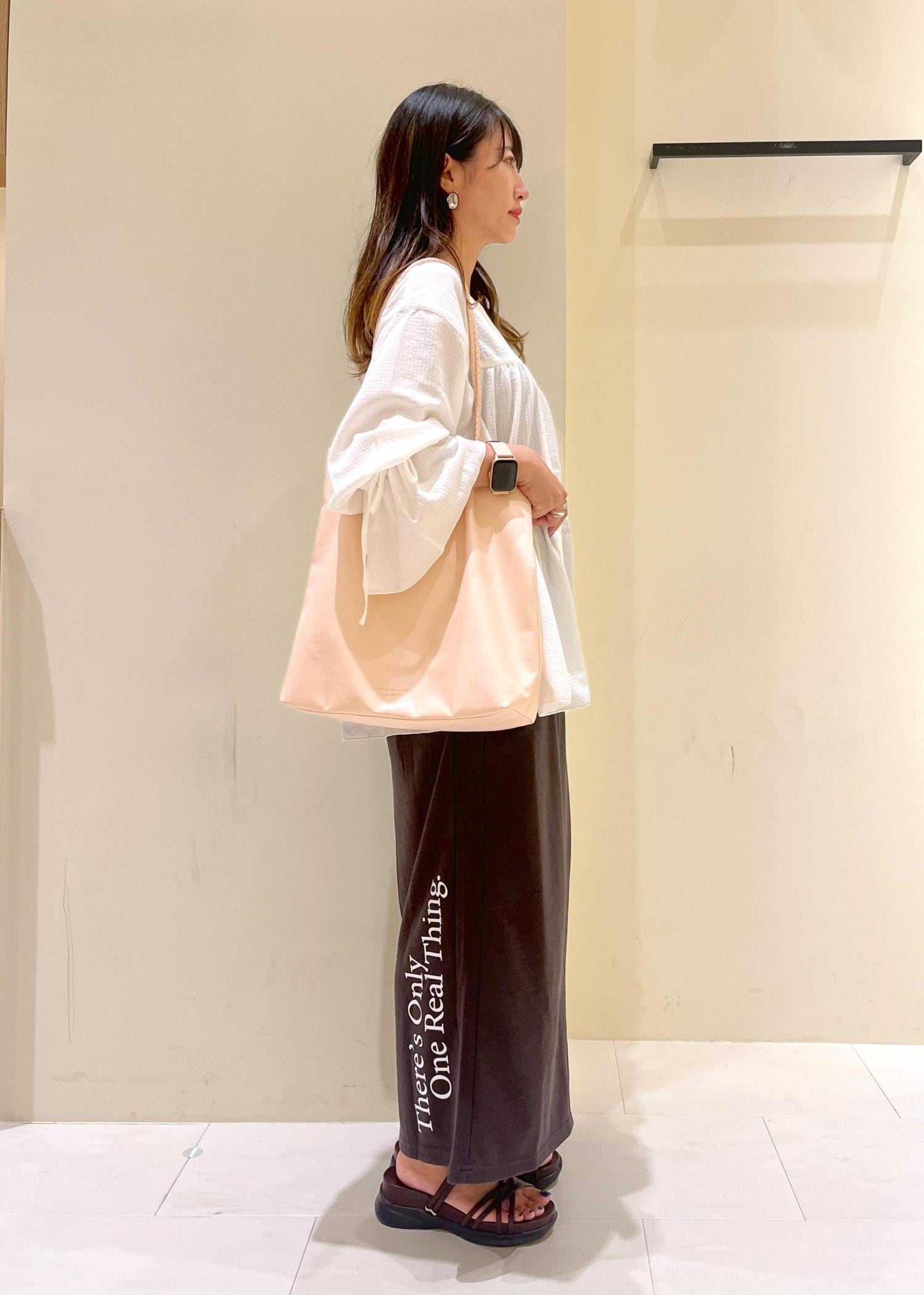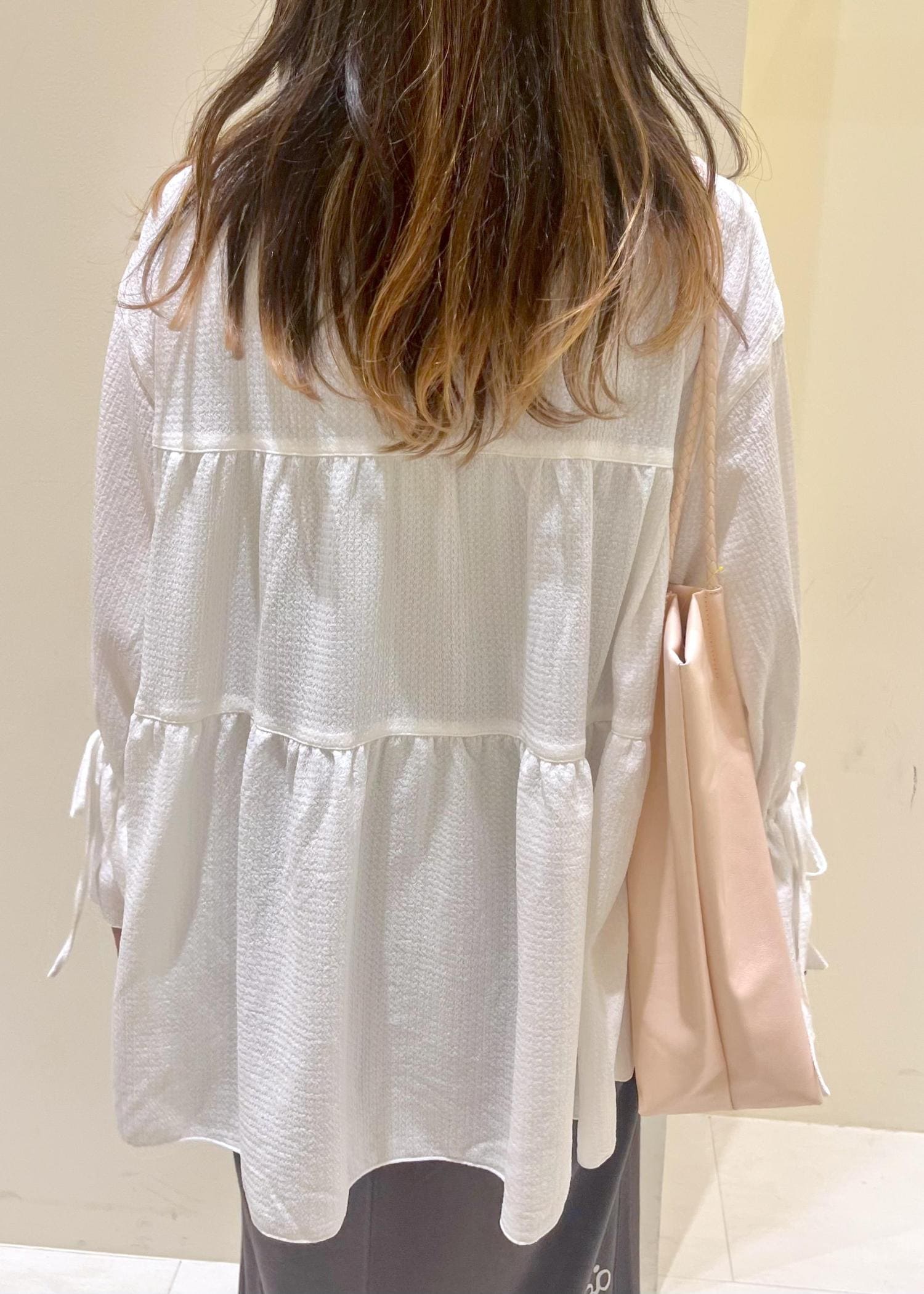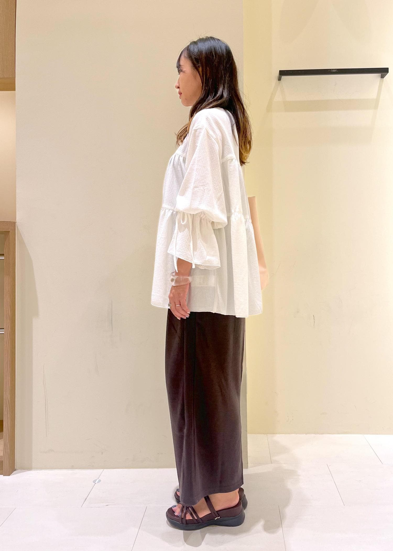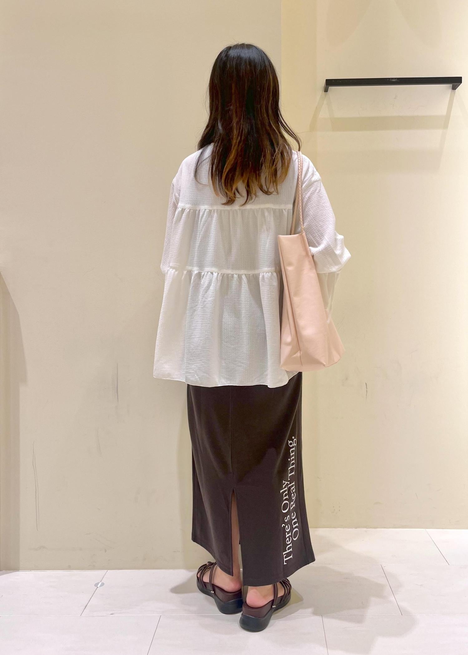 ティアードシルエットが可愛いブラウスをスウェットスカートでカジュアルダウン◎